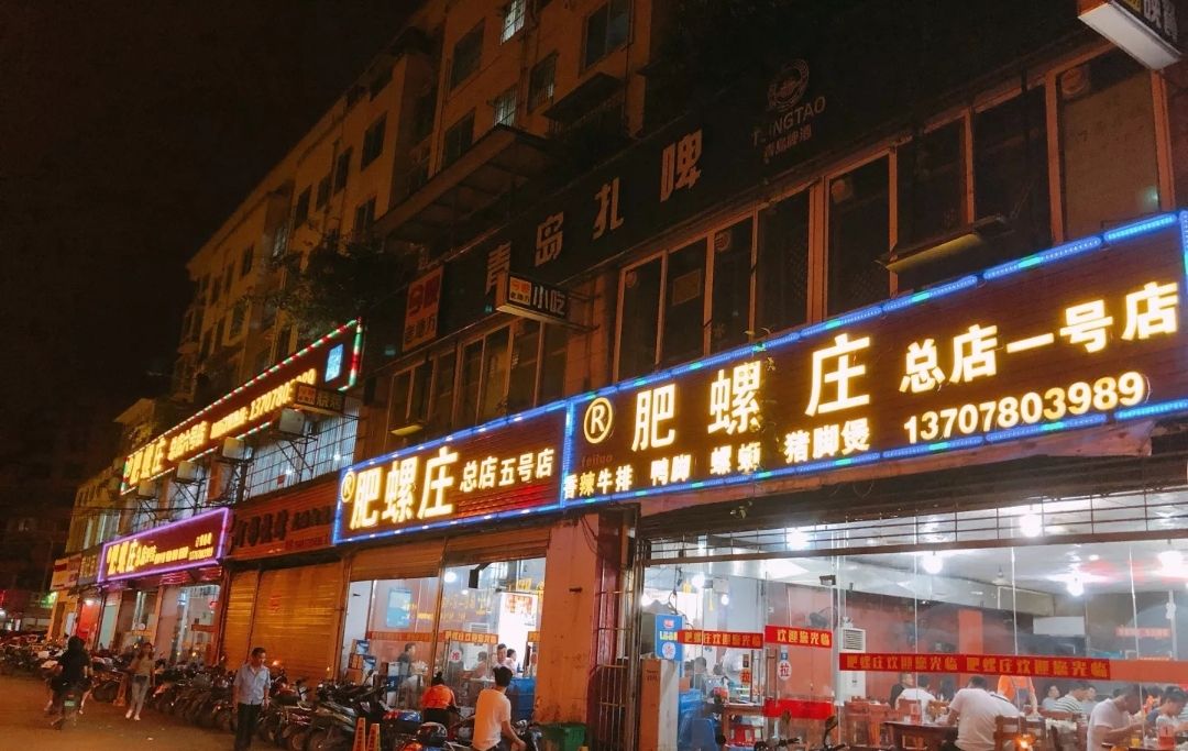 来柳州一定要去吃一次肥罗庄,从来没见过有一家餐饮店,可以开满整条街,1号分店,2号分店,3号分店,4号分店,5号分店,你大可以放心,都是同一个老板的,来这里一定要吃田螺鸭脚煲,还要吃烧烤,还有炒花甲,都是满满的柳州口味。