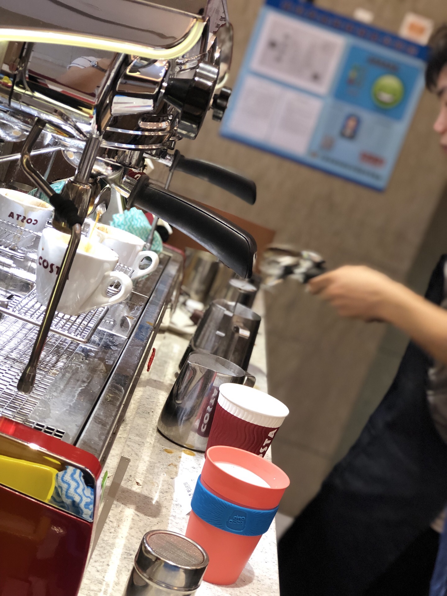 开在旁边的办公楼里的costa,环境很一般,一大早座位都没整理,很凌乱; 小杯拿铁29块,花这个价钱真的非常不值,味道不怎的,卖相也没有,服务也冷淡; sorry,真的找不出它家的亮点,咖啡店选择那么多,竞争也激烈,C家各方面都不来塞啊!