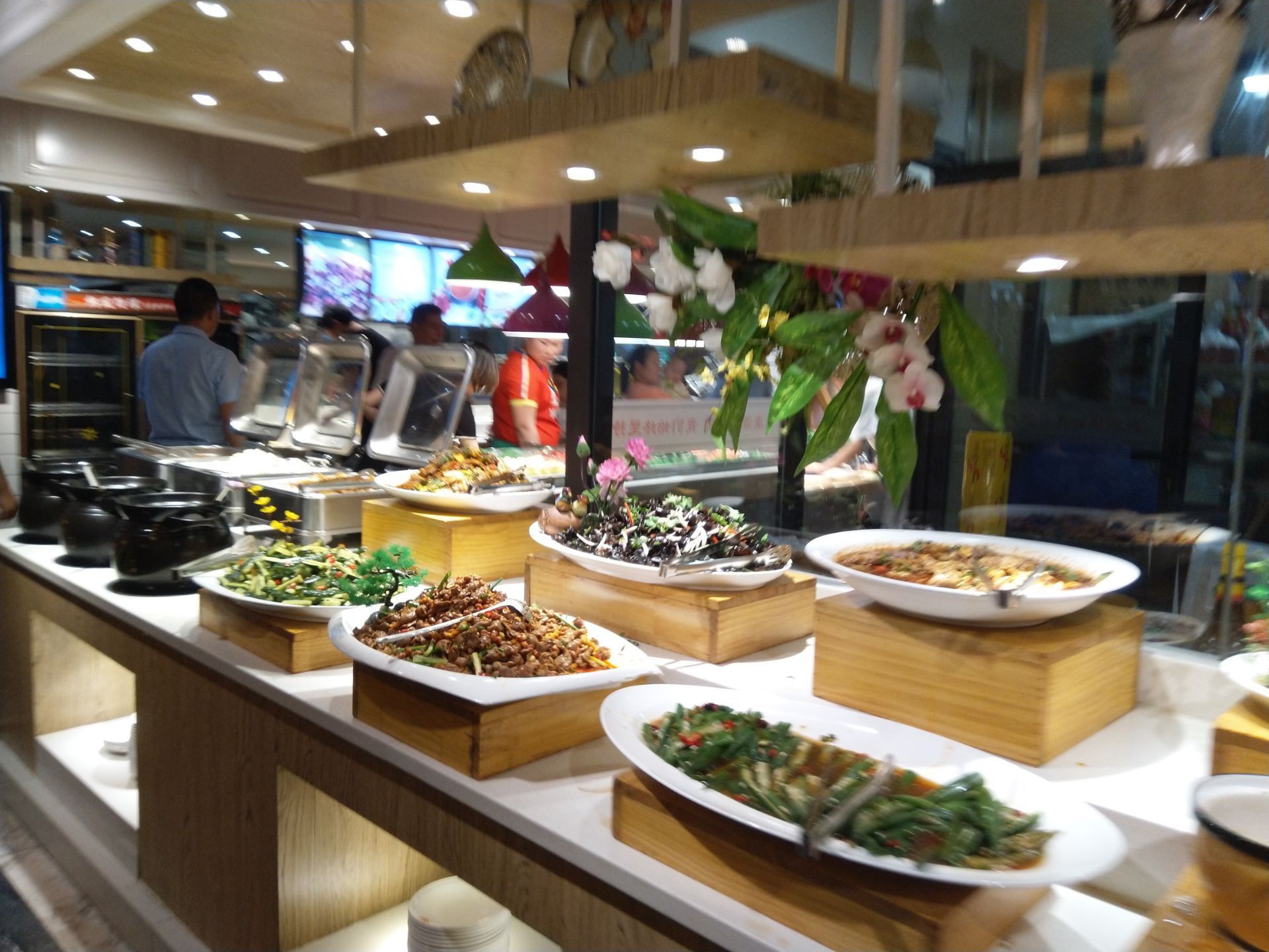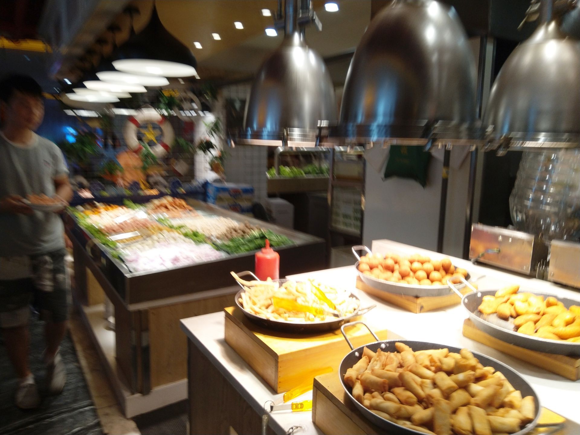 主要是想吃海鲜,但是去了后发现带壳的海鲜就只有虾,而且是冻的裹着一层厚厚的冰,等病融化后那虾比小指还小,其他肉也不是很多,主要是加工后含肉的一些类似含虾的虾饺,火腿之类,在就是一些很普通的鱼,还有就是寿司,批萨,糕点,水果,面食,稀饭,玉米,水果之类,大部分还是以蔬菜为主,不知道是什么肉卷是玩自己拿盘子在厨师那里现作的,饮品除了啤酒是瓶子的剩下全部是勾兑的用杯子现接的。环境不错,服务也挺好,就是菜品不咋地,也就值这个价钱,和粗粮王还是有30块钱的差距!