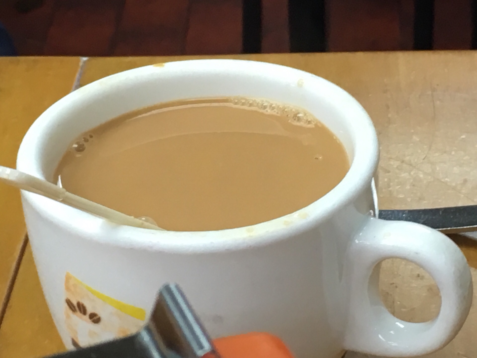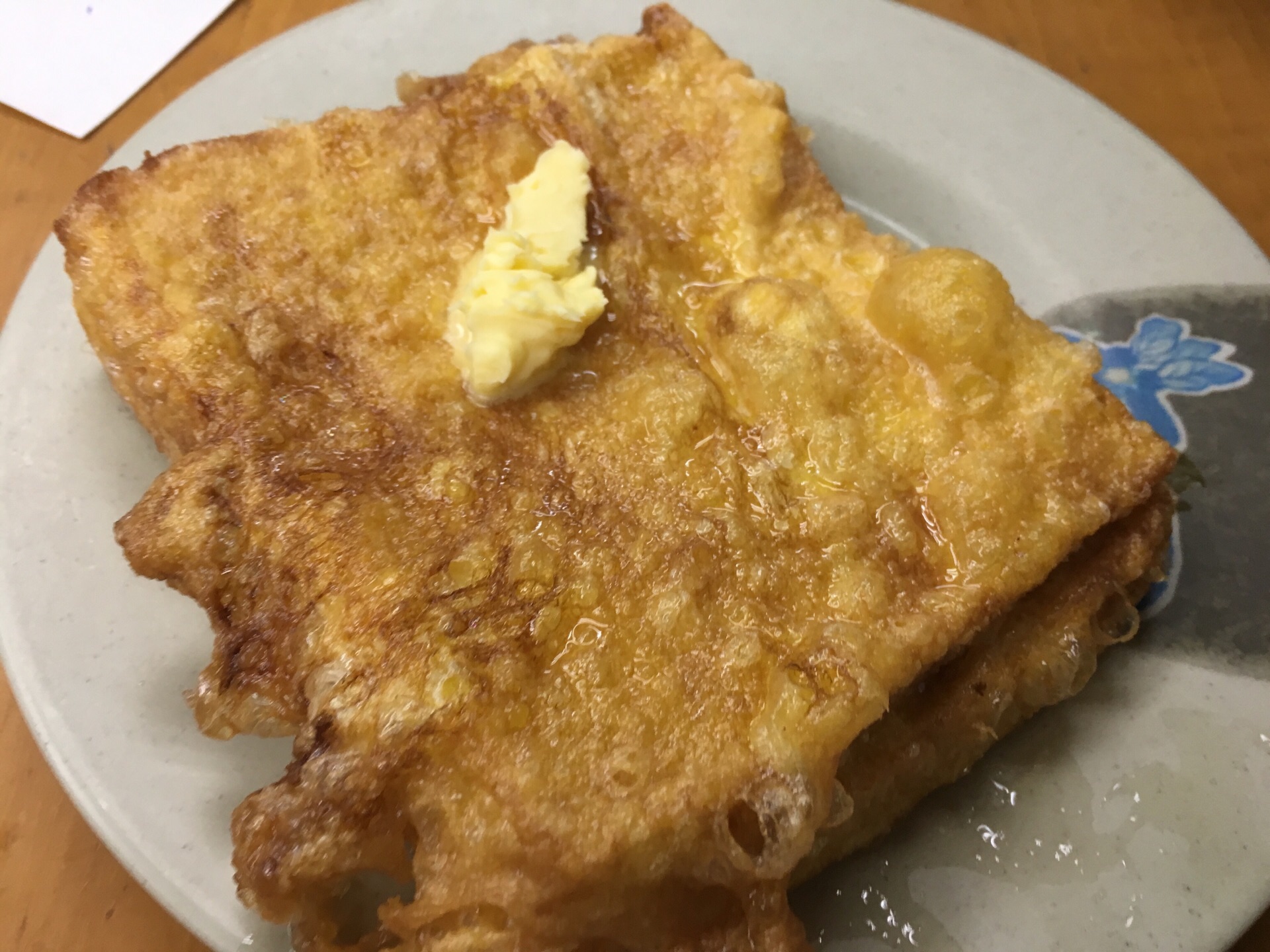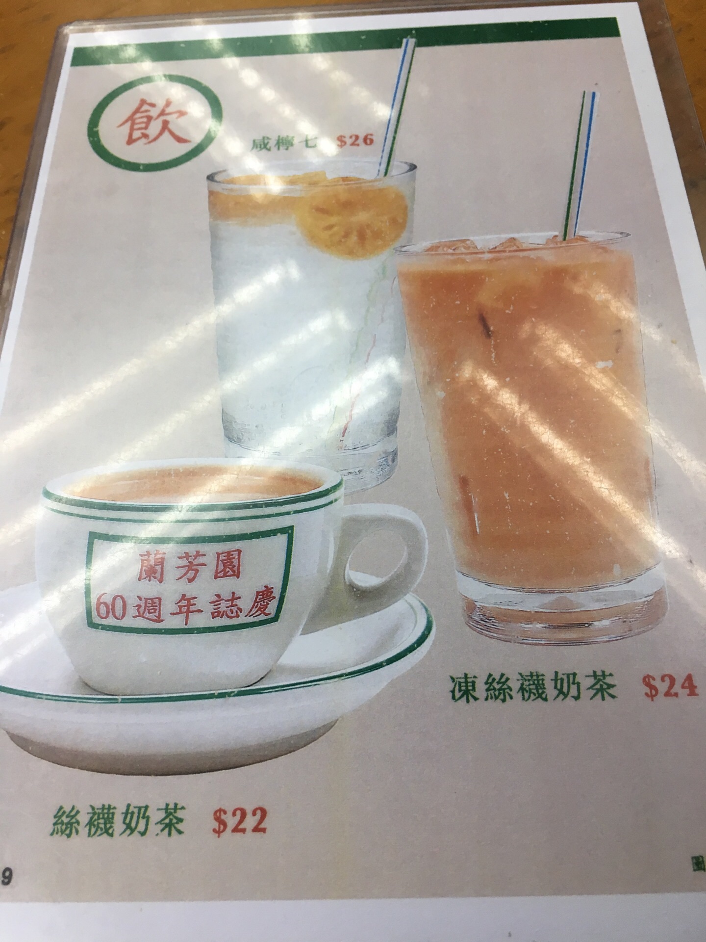 慕名前来。几个人点了奶茶、吐司、猪扒包等。服务生大叔的的记录系统,我们不懂。只得到一个算式:33+27+ ……=187,这就是我们要拿着去付款的餐单了。没觉得比香港其他的餐馆更好吃。餐厅的洗手间坏了,无法使用。