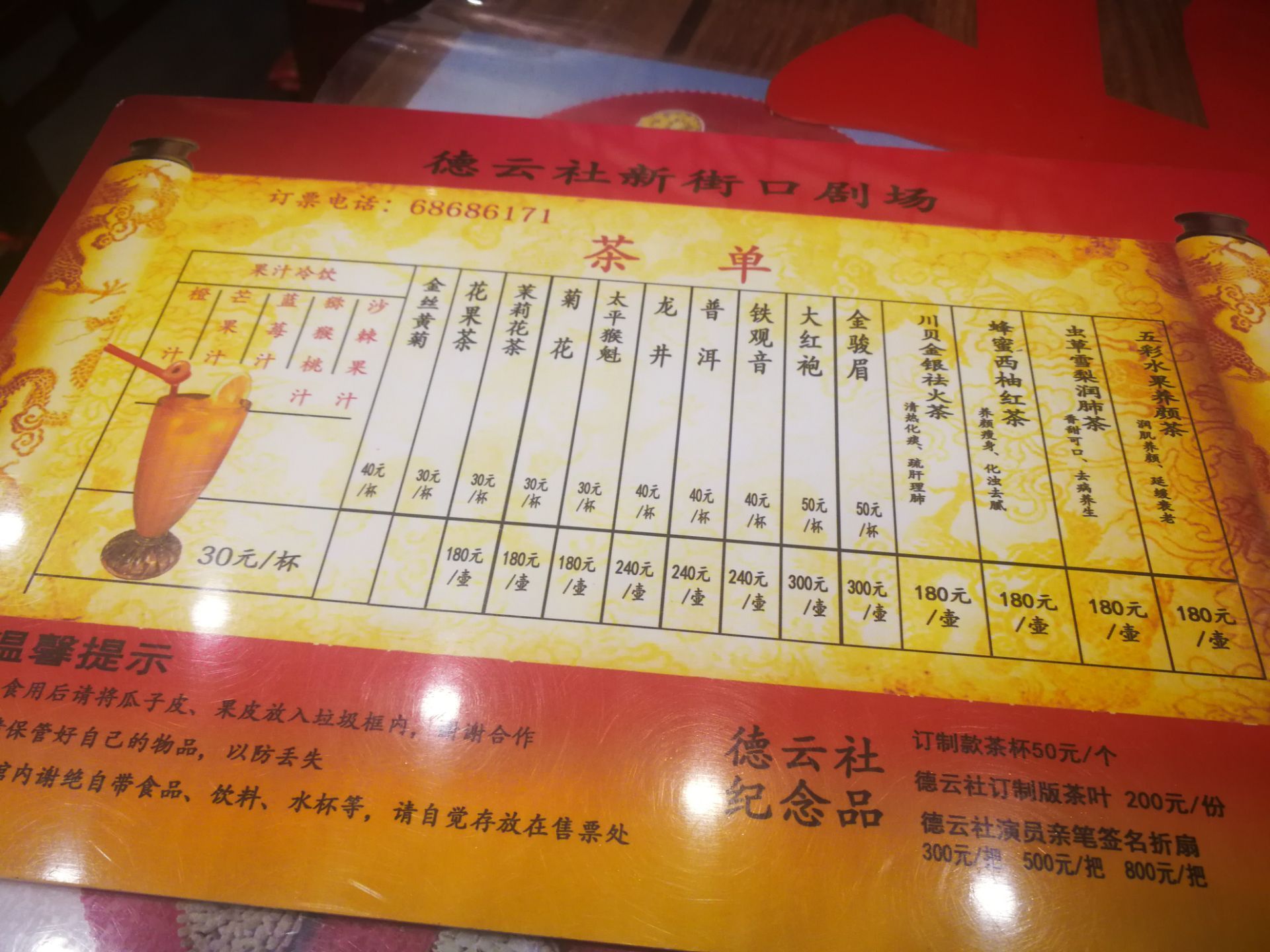 ...茶水饮品,小吃拼盘等都有,五队貌似演员不太多,一共四组,但是挺有意思的,笑声不断,三个小时左右决定看的晚了,当天只有新街口有票,晚上六点半之后检票进场,服务员带到位置,点餐付账,茶水饮品,小吃拼盘等都有,五队貌似演员不太多,一共四组,但是挺有意思的,笑声不断,三个小时左右