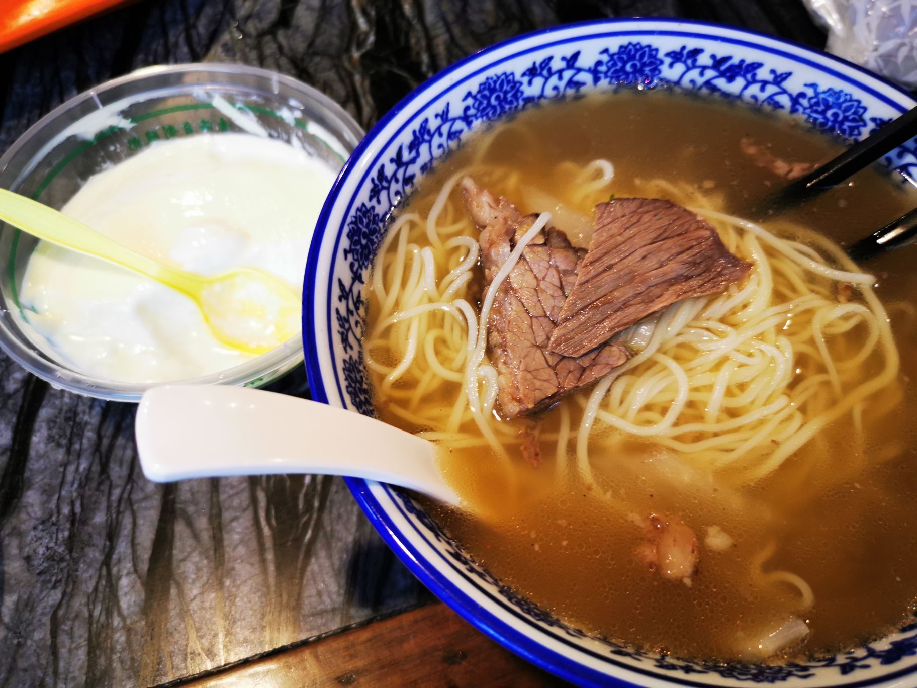 朋友之前来过兰州,推荐马有布拉面好吃,午饭时间所以来试一试。 就在中山桥的对面马路,很容易找,面条韧细,兰州拉面的标配再加几块萝卜片,习惯性走葱免辣,牛肉软香,感觉汤底与别家不同,多了点点姜味,好吃 ,不过青海酸奶真的好酸好酸,不过也全部吃掉了。