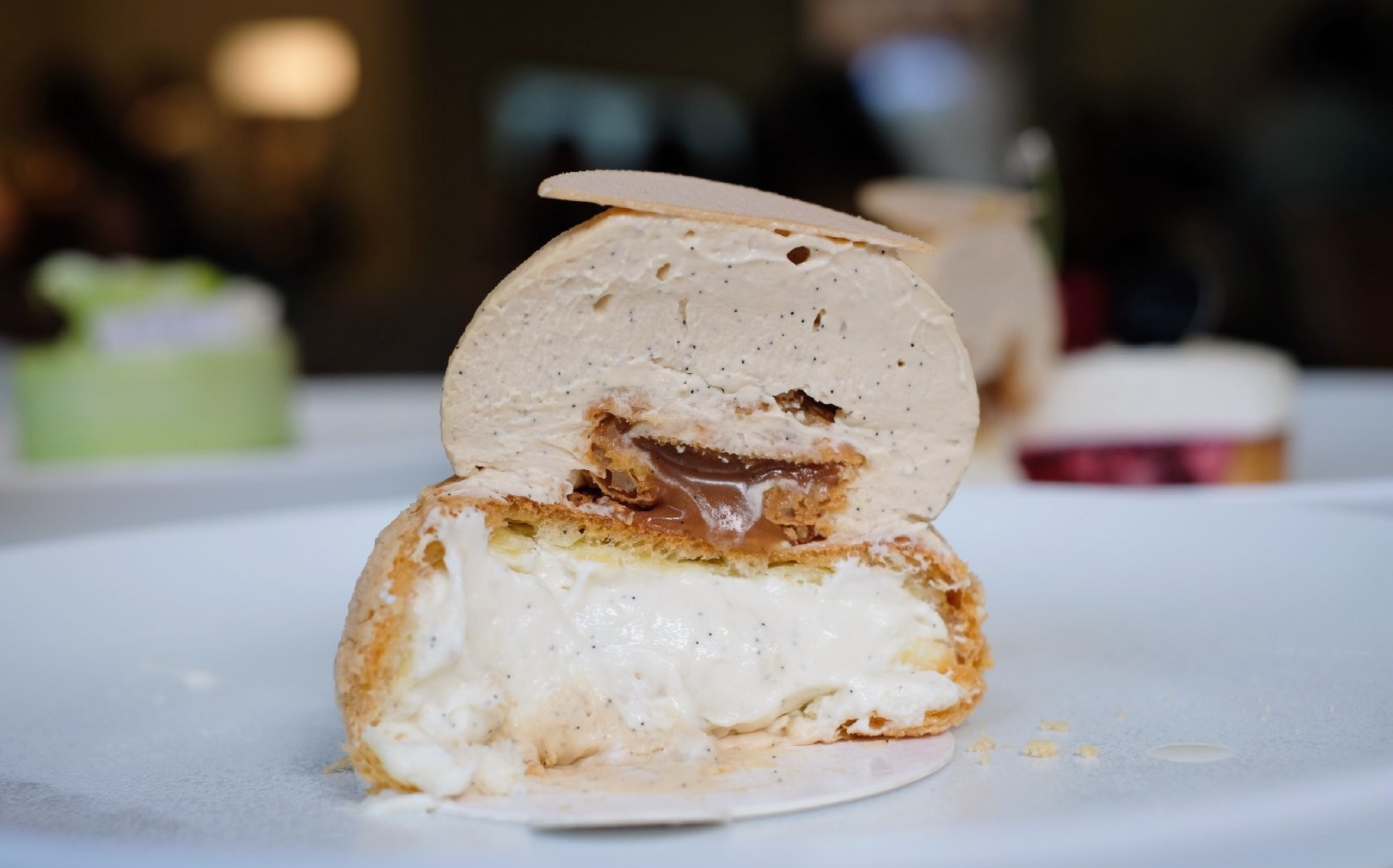 百香果苏打 碧潭飘雪限定 茶香清新,茉莉味突出,甜而不腻,喜欢中间脆脆的果粒,口感很丰富。 车厘子挞 我心中的No.1! 最上面的原味奶油轻盈细腻,下面冰凉幼滑的车厘子奶油包裹着满满的果肉,中间还有一层车厘子果酱,酸甜度平衡的刚刚好,挞底也够硬脆,加分加分! 大溪地香草泡芙 酥薄的外皮裹着充盈香滑的香草奶油,切开以后还能看到呼之欲流的焦糖酱,太喜欢啦!
