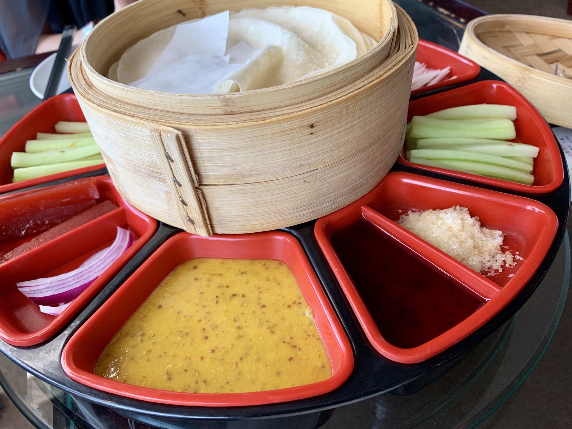 来北京自然要找烤鸭店,下飞机差不多就到了午饭点,搜了一下这家店离机场大概15公里左右,于是打车前往。中午的时候,餐厅里面小桌子位已经没有了,服务员领位到餐厅外的区域。点了烤鸭、宫爆虾球、葱油饼等。半只烤鸭等了挺久,先上桌的蟹球和葱油饼味道不错,尤其虾球,外脆里嫩酸甜开胃;但是烤鸭就差强人意了,作为烤鸭店的主打,口味和品质实在没有达到水准,酱料一般,山楂条切的太粗,面饼甚至有点涩涩的感觉。 服务态度很好,但是不会再来了。