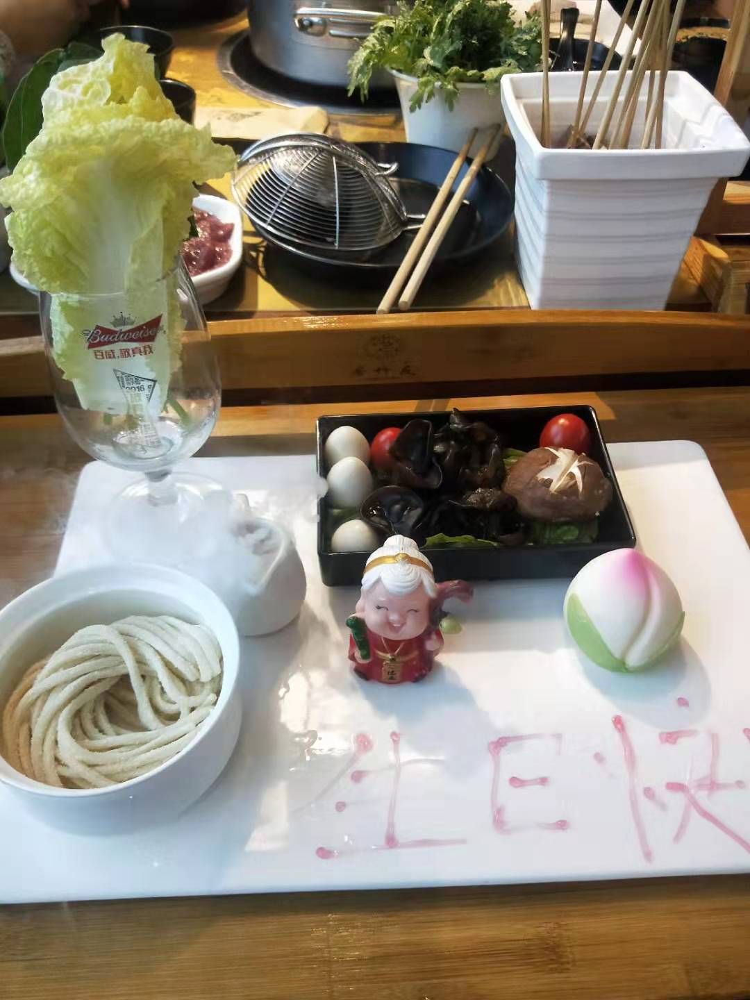 过生日还赠送一个生日面 妈妈说这的环境挺好,也很好吃,各种食材都是摆放的那么好看,干净