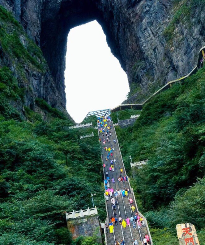 台阶好高,真是天梯,山有个自然的洞,所以登上去犹如天梯,白天,傍晚,还有有雾的天景色都不一样。游人很多,都来登山观景。很不错的。