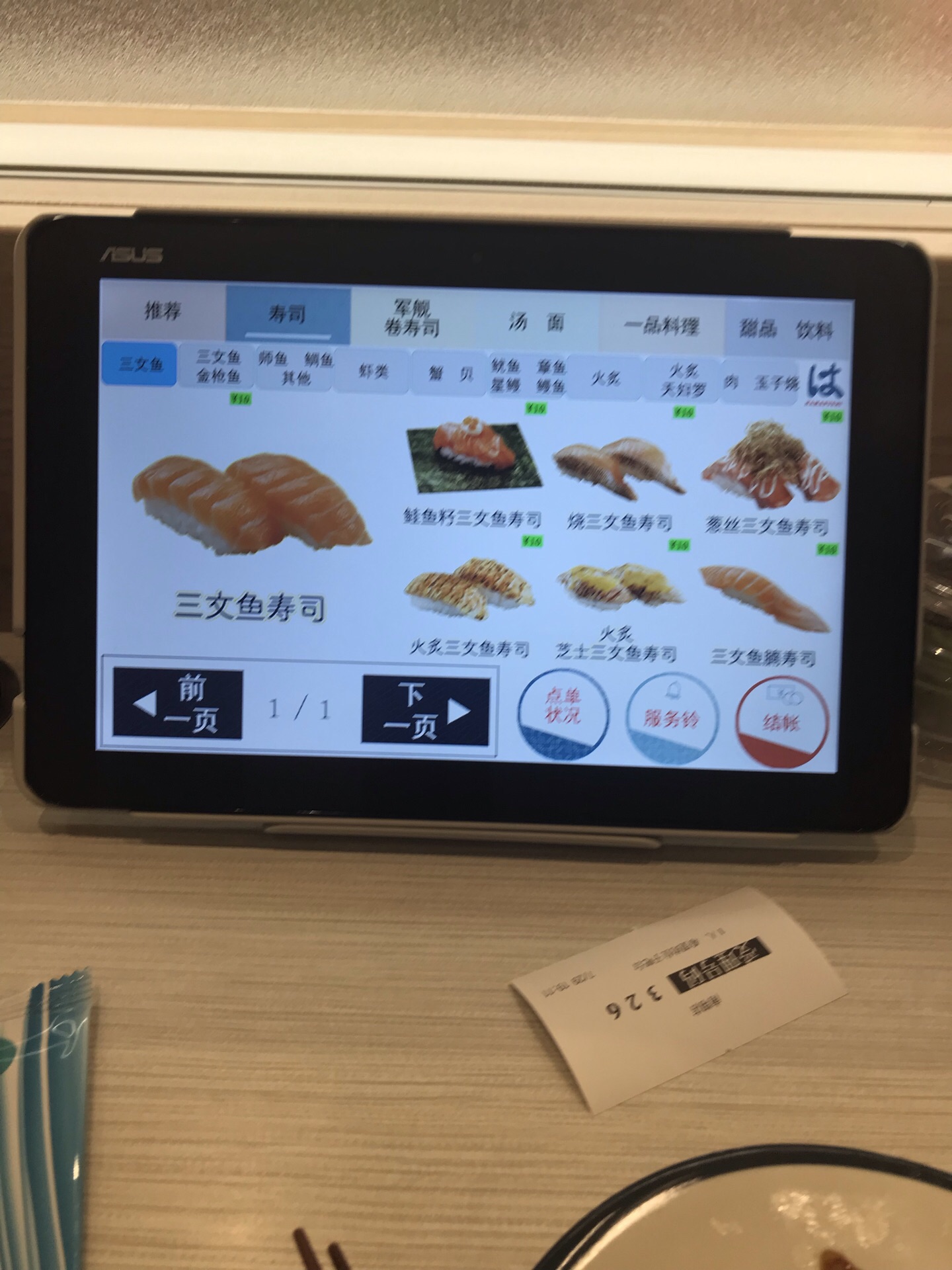 这个品牌的回转寿司我是6月在北海道的札幌吃过,先对比下价格,普通寿司日本是100日币每盘(含税),这里是10元人民币每盘,对比后可以发现国内的税费确实略贵,另外日本的店除了可以按自己需求指定单点外会有普通寿司、布丁、饮料循环轮转,供食客自由拿取(类似于争先寿司的模式)不过在这家店目前只提供单点,不过品种比在日本所吃的略多,多了苗条,大坂烧等,餐品的品质和在日本吃的差不多,新鲜度都不错,味道的话炎烤玉子寿司和三文鱼寿司感觉还比日本的略好,大坂烧也不错,可以说这家店是平价寿司的翘楚哦