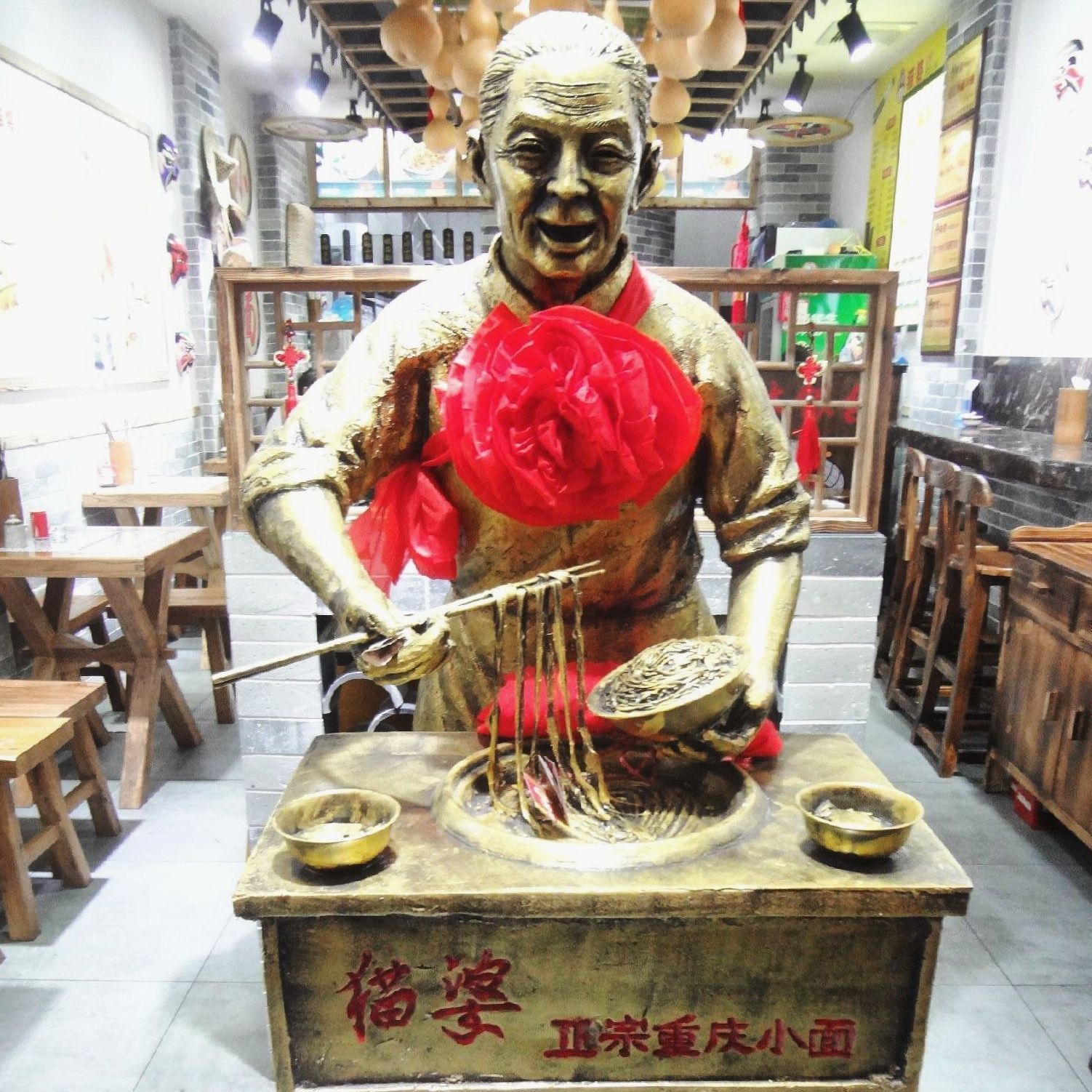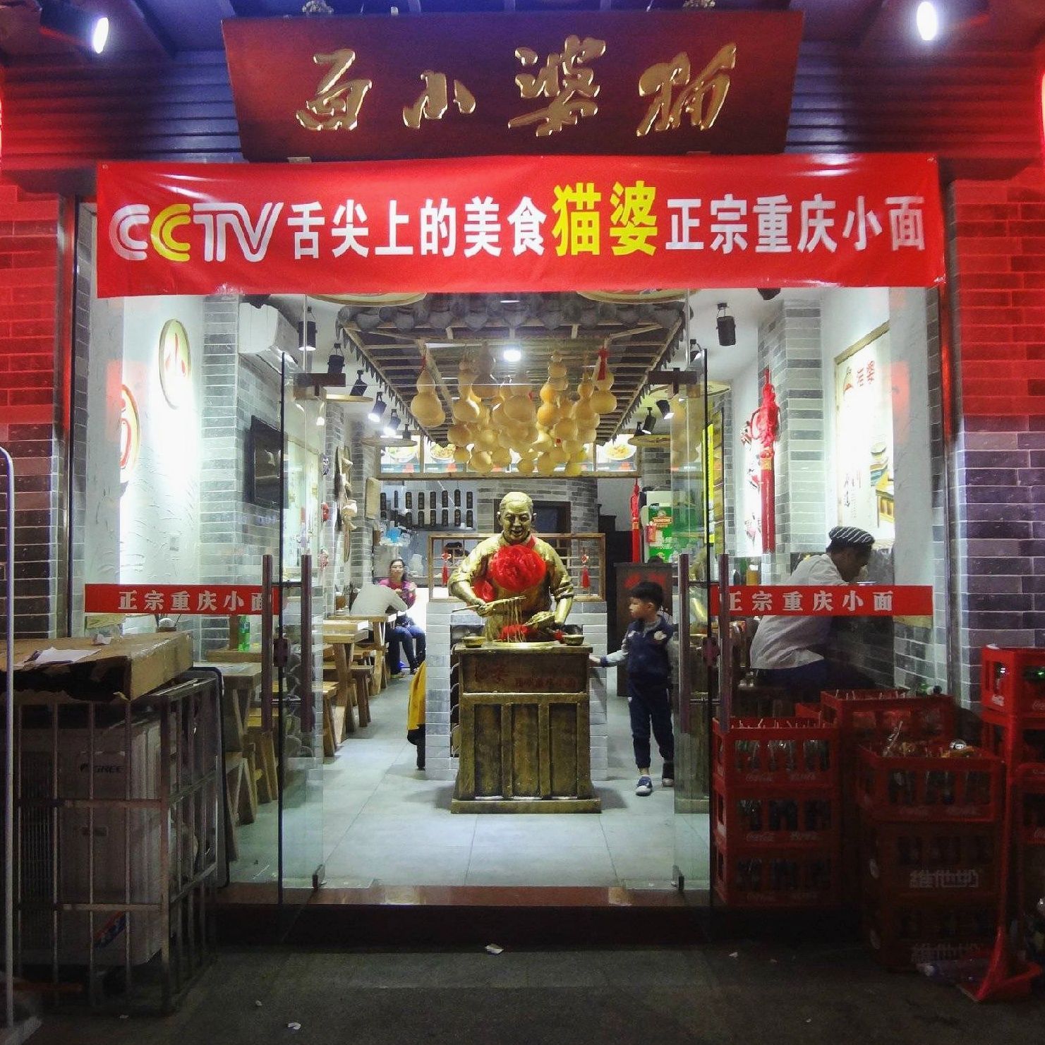 【菜品】个人非常喜欢吃面食,所以得知这家是”舌尖上的中国“推荐,当然是迫不及待要来吃,重庆小面更是面食中我最爱之一,没想到在珠海也能吃到这样地道的重庆小面了; #红油腐竹# 先点了一个小菜,因为重庆的面馆子,所以小菜基本都是辣的,正符合我心意,本来想点口水鸡的,就是怕太多了吃不完;不知道是不是因为晚上的缘故,腐竹都剩了一些比较硬的,挑了一些比较软的吃,味道还不错,作为小菜来说中规中矩,比较开胃; #重庆小面# 最期待的重庆小面很快就上来了,比我想象中的大碗,这是一人份么~~简直是以男人作为标准的一人份了,带汤的重庆小面,面条做得非常好吃,非常有韧性,虽然很大一碗我还是吃光光;里面的材料看起来不多,其实店家是下了很多功夫在调味上的,我点的是微麻微辣,里面的辣椒油很少,这一点出乎我的意料,之前吃过的重庆小面都故意放很多辣椒油,导致最后没法喝面汤;一碗面条下肚,完全饱足,到店的客人基本上都是点一碗面一份小菜,这一顿就是真的解决了。 【环境】小店有两层,因为舌尖上的中国,所以很火爆,不过我到店的时候是晚上,所以客人不多,里面布置得很有特色,进门看到的就是一个老婆婆的铜像,墙上挂着很多脸谱,最里面是厨房,布置得好像以前的客栈一样;餐具是每桌上面有一个筒子里面装着,个人觉得不太干净,因为每个客人都拿,很容易弄脏,还是应该店家从消毒柜里面拿出来给每个客人比较好。 【服务】店家人超级好,我不知道怎么去,就给店家打了电话,很贴心的告诉我怎么走,到点之后,有个店员听到我说话,立刻走过来问我是不是就是刚才打电话问路的;点餐的时候店员很细心的介绍了不同的面,上菜也很快,吃完了之后还问我觉得口味如何。 【价格】非常亲民,一碗面条才十几块,真的是好吃又饱足,而且绝对吃了还想再来吃。