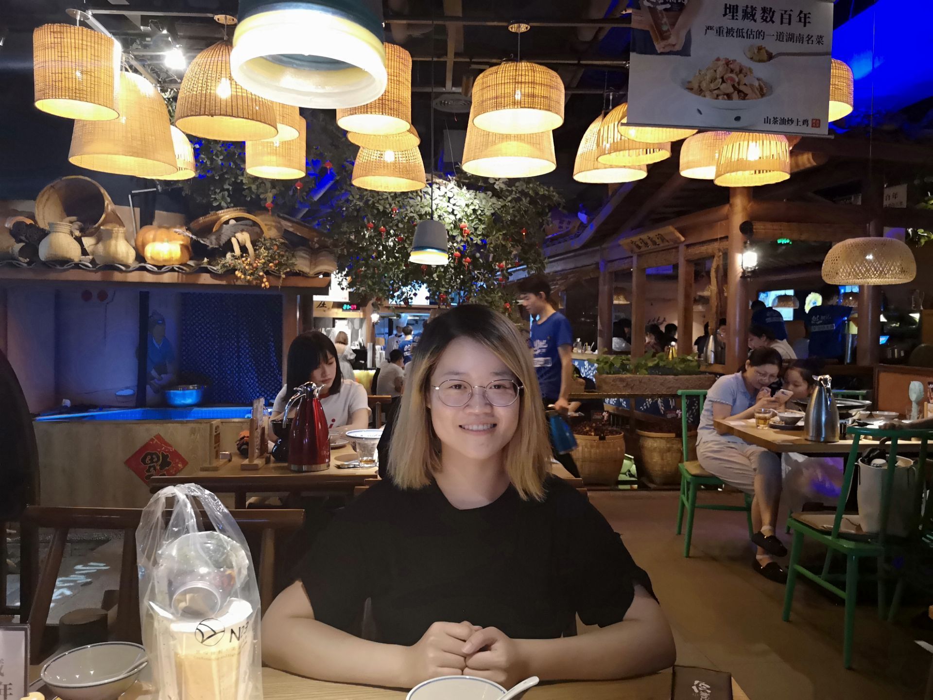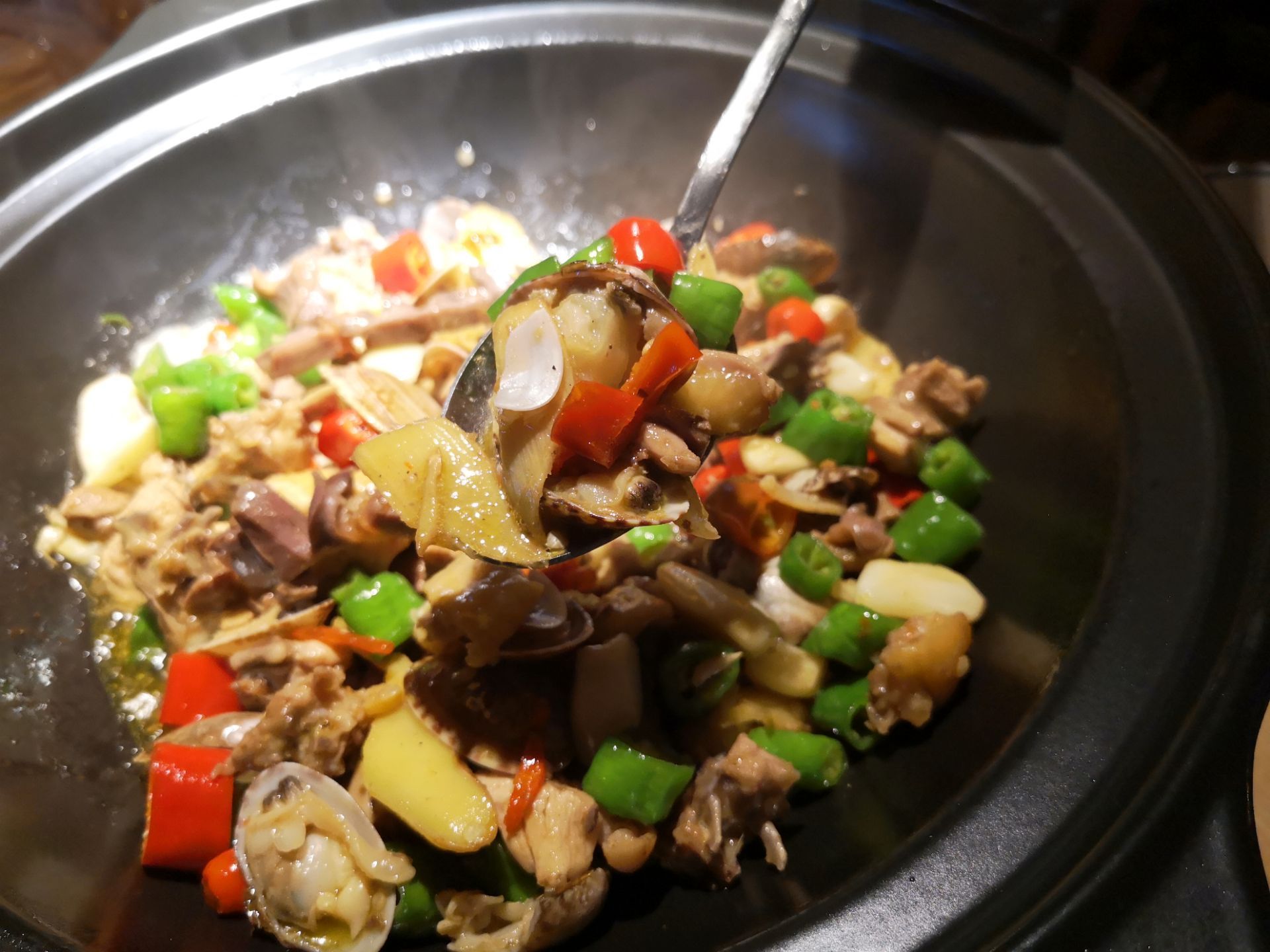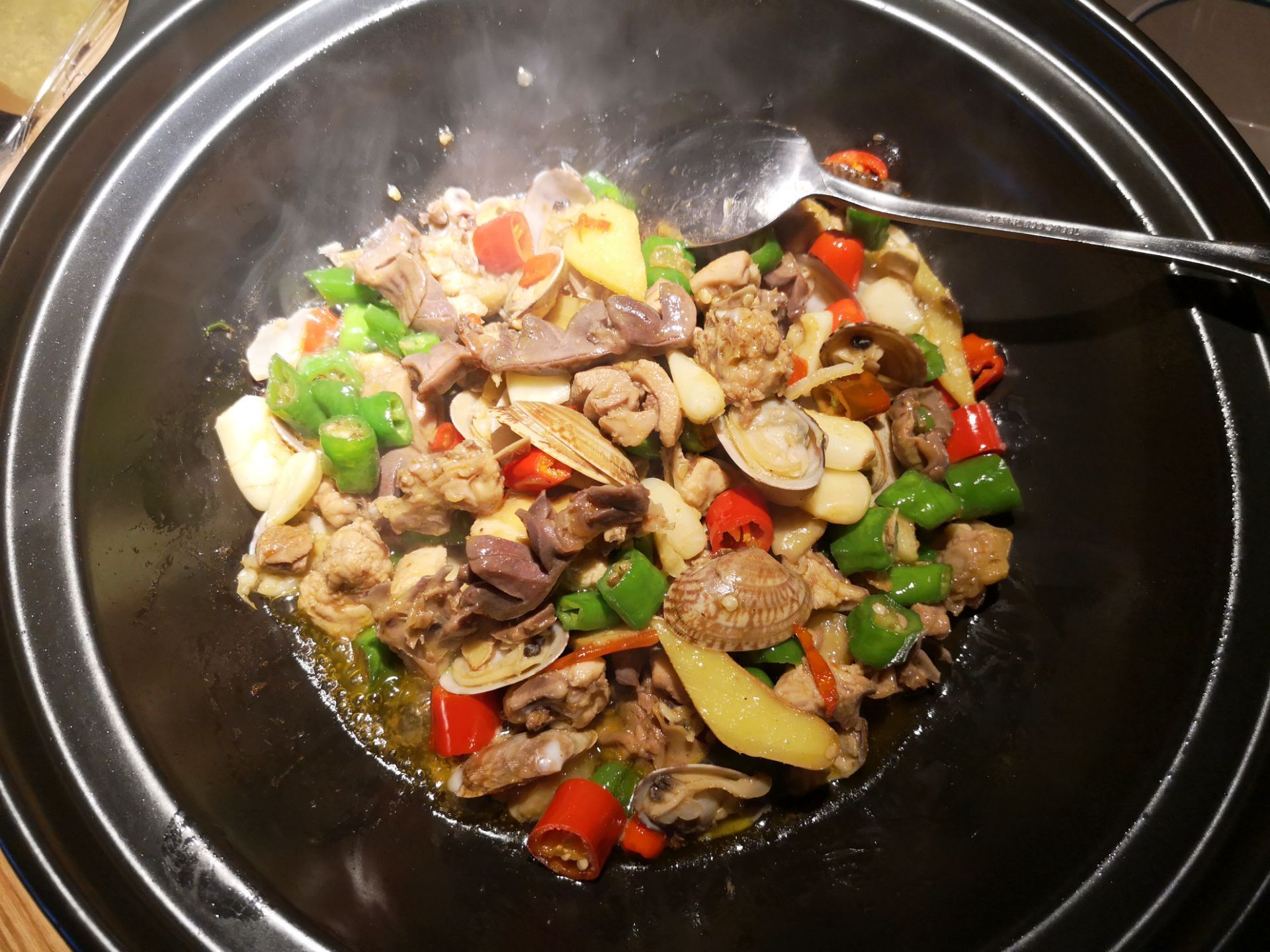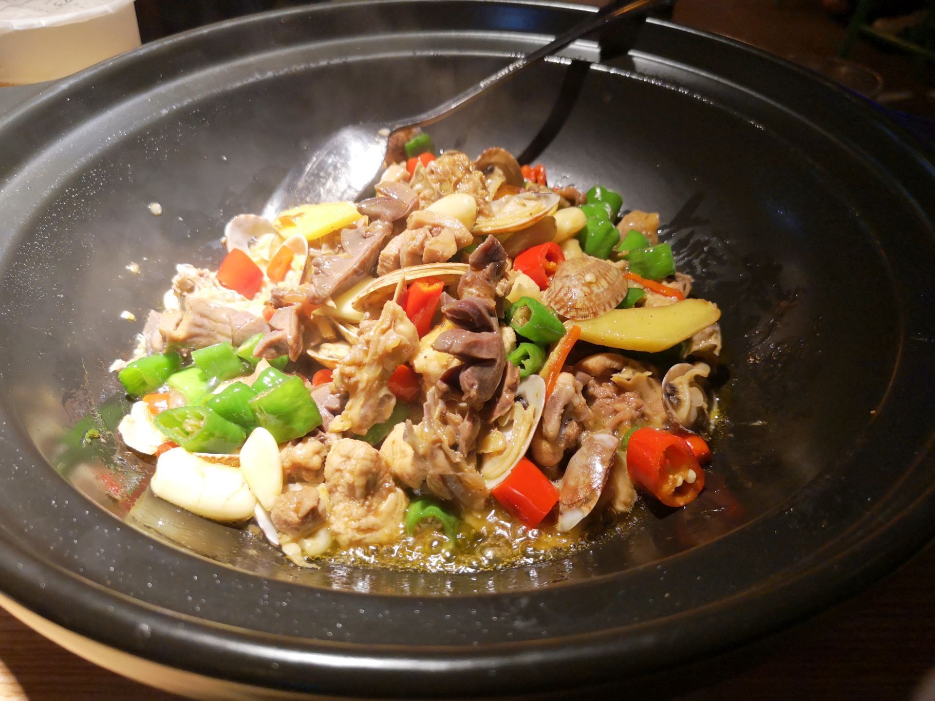 |山里茶油炒土鸡^这道菜上桌的时候,满满一个大锅,看起来量很大的样子。其实还好,两个人吃正好,味道比较独特吧,也是第一次吃这种味道。里面有鸡肉和蛤蜊,鸡肉的味道混合着海鲜的鲜美,味道还可以,但是鸡肉真的太小块了,因为太小块,就会有很多碎骨头渣子,所以吃的时候要注意。如果鸡肉肉块大一点,没有那么多碎骨头渣子,应该会更好。 饮料优格还不错|青柠优格^,配着鸡肉吃,缓解了肉的油腻。