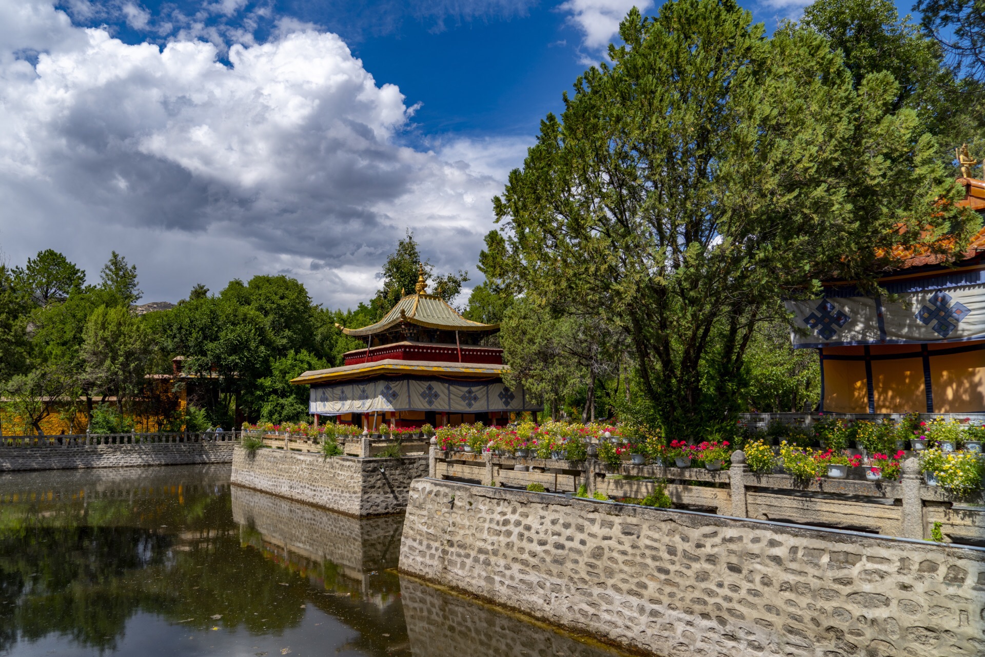 湖心宫是罗布林卡内比较特别的宫殿,中林卡内唯一一个四周有水,建在湖中的一个宫殿,湖不是很大,四周古木参天,芳草遍地,宫殿、凉亭、水榭、回廊布设紧凑,水池、草坪、林木、房舍相得益彰,很有汉式园林风格。