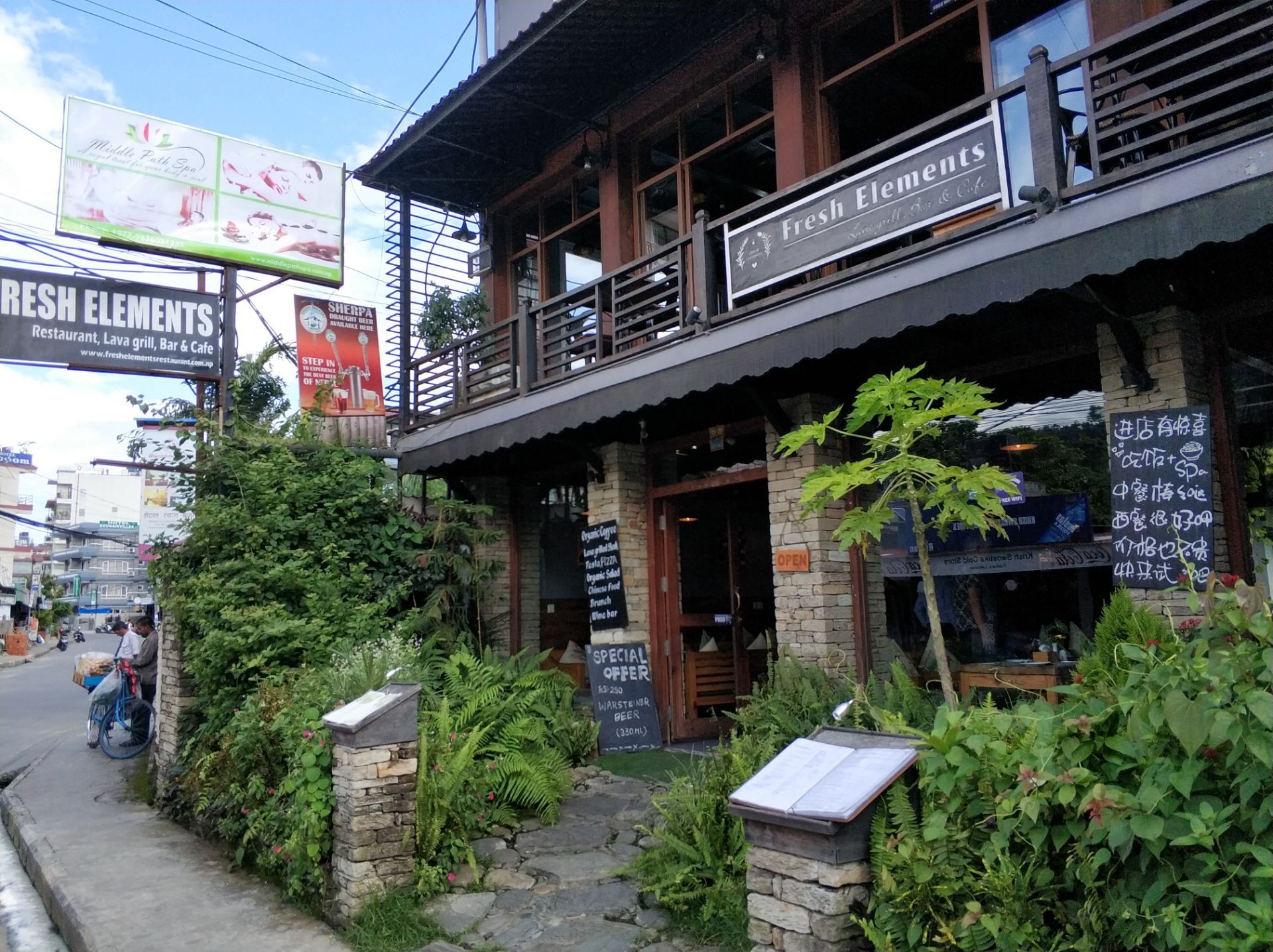 FRESH ELEMENT,还没到博卡拉就跟同行的朋友吹嘘,这里的牛排是在尼泊尔吃过最好吃的、原本不吃5分熟的一姑娘吃过这5分熟的牛排后就喜欢上了。 下午4点多到店,空调电扇辅助下,很是凉爽。 5分熟牛排比吹嘘的低了好几档,换厨师了? 环境、服务一样的优秀,下次换别的尝一下。