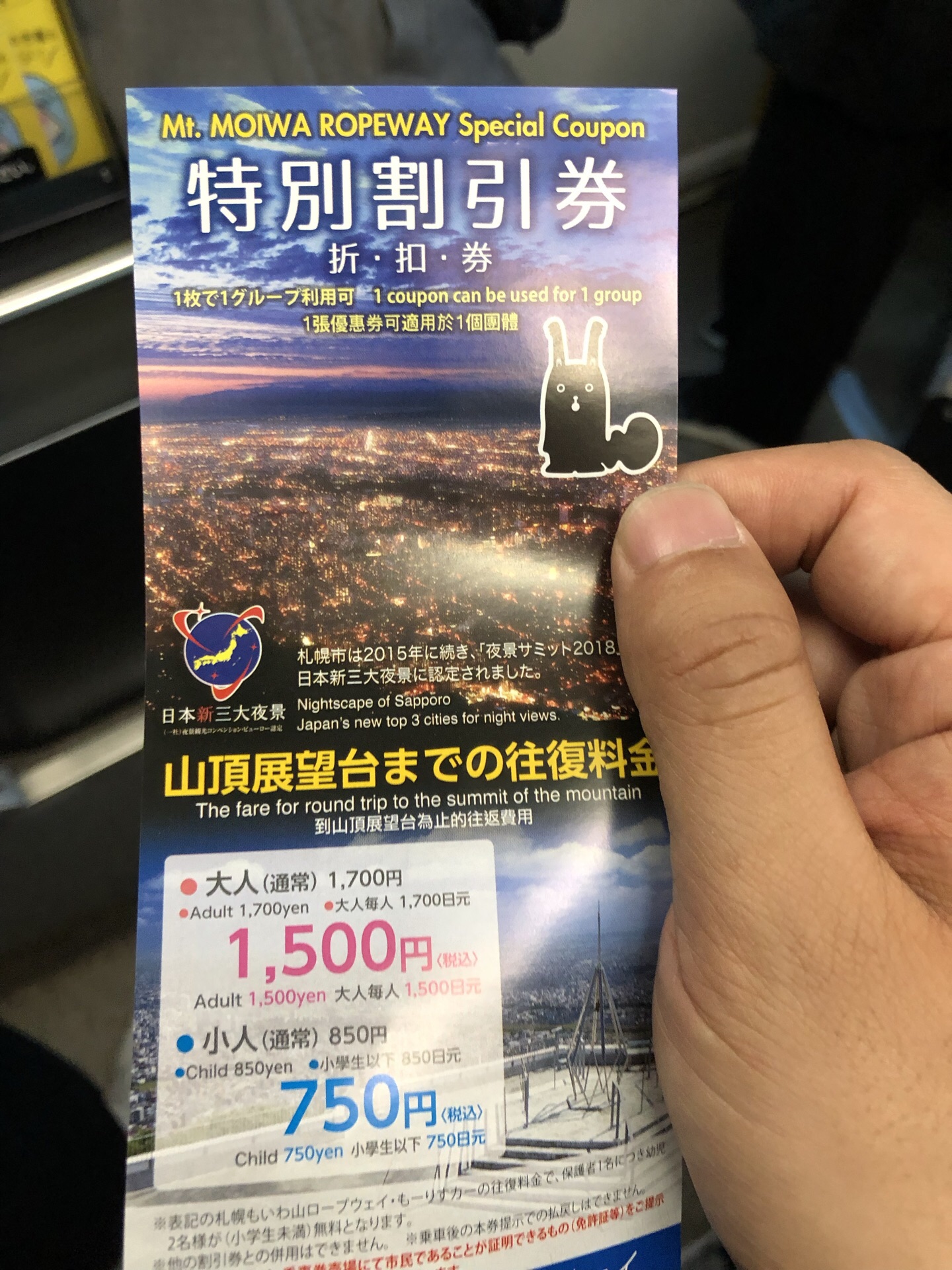 藻岩山是观看札晃夜景的最佳点。札晃夜景也是新的三大夜景。 乘坐电车在山脚下的公交车站下车,会有接驳巴士到缆车站,不过人太多了,等巴士时间很久,不如自己走上去。 在电车上有缆车的优惠券,免费领取。 缆车有两段,上山等的时间还好,下山那真让人等得闹心。 观景10分钟,排队2小时。 夜景还是不错的。只是不值得等这么长时间。