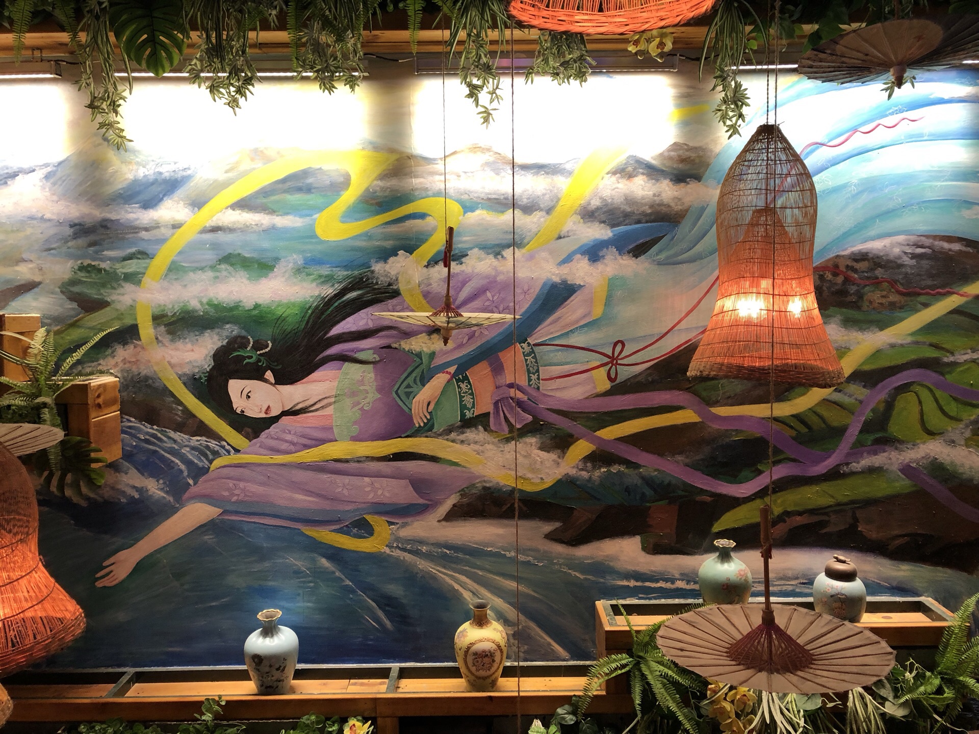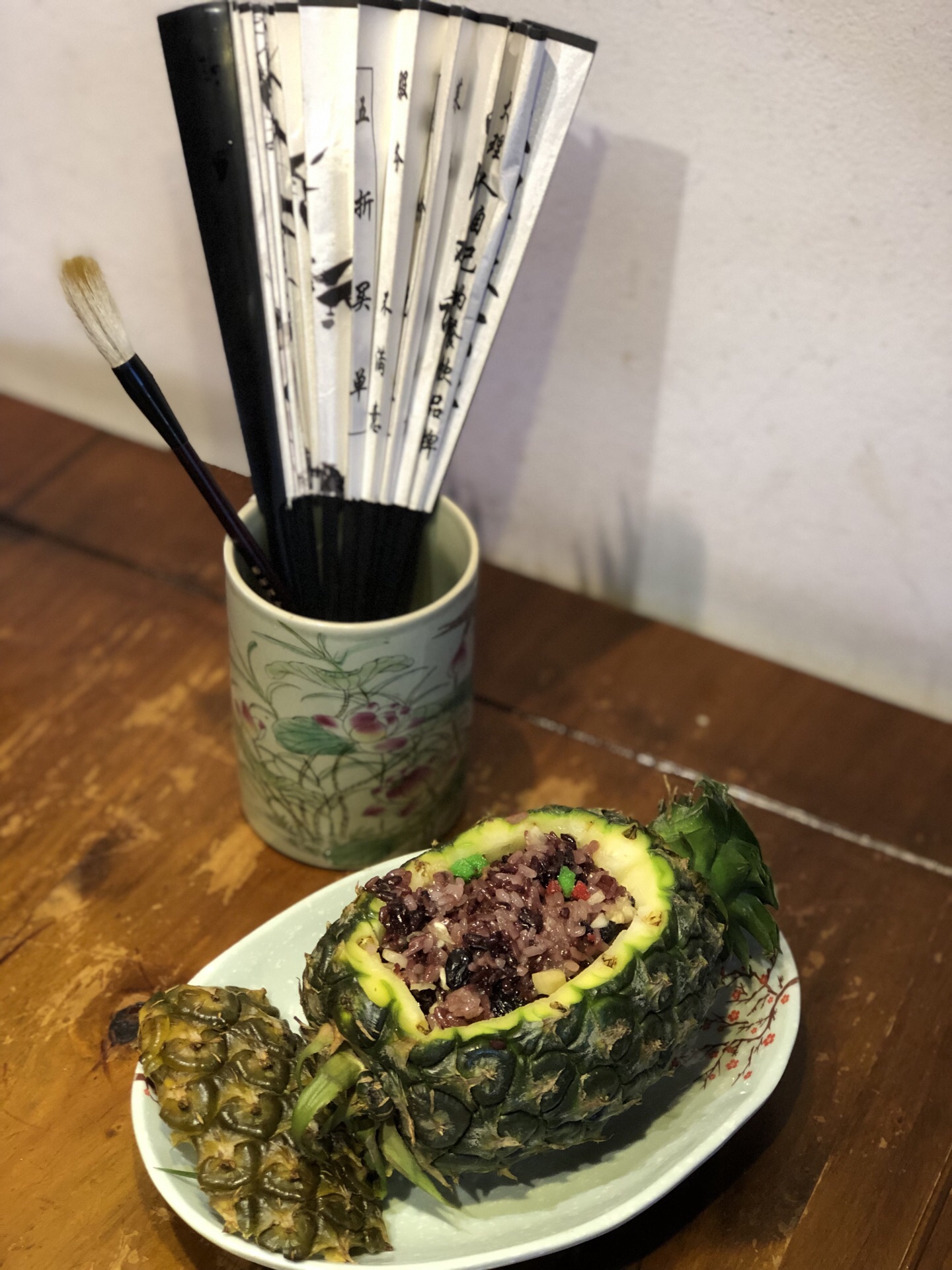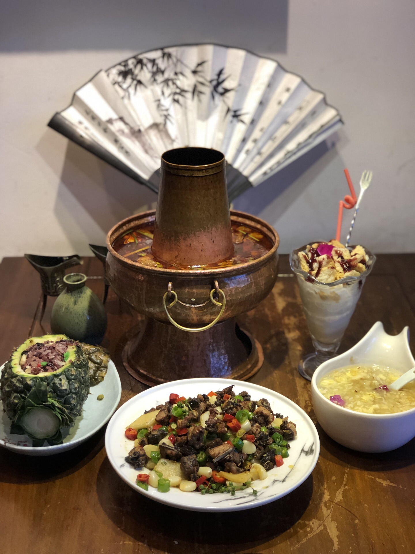大理段公子 大理古城 来大理必须打卡的网红店,店里主打天龙八部主题,前段时间旧版天龙八部段誉的扮演者陈浩民先生还亲临店里呢。店里的服务员也都是穿着特色的民族服装,壁画、歌曲都是天龙八部里面的。 点完菜服务员还会和你讲解一下菜的口味,会问你有没有忌口的。 老大理炊锅牛肉:铜火锅慢煮牛肉,有点微辣,里面还有饵块、腐竹、木耳多种配料,牛肉分量多,很入味,很适合配着菠萝饭吃 版纳天然菠萝饭:糯米饭蒸熟后加上酸酸甜甜的菠萝,大人小孩都爱吃的主食。 还有当地特色的饮品:泡鲁达,底下是酸奶,上面是面包脆,可以直接喝酸奶,也可以把面包脆泡软了喝,会是不一样的感觉。