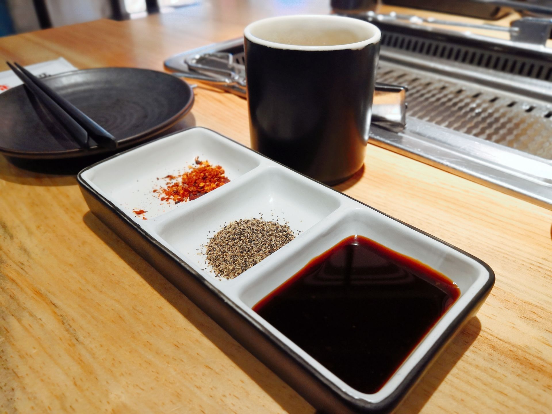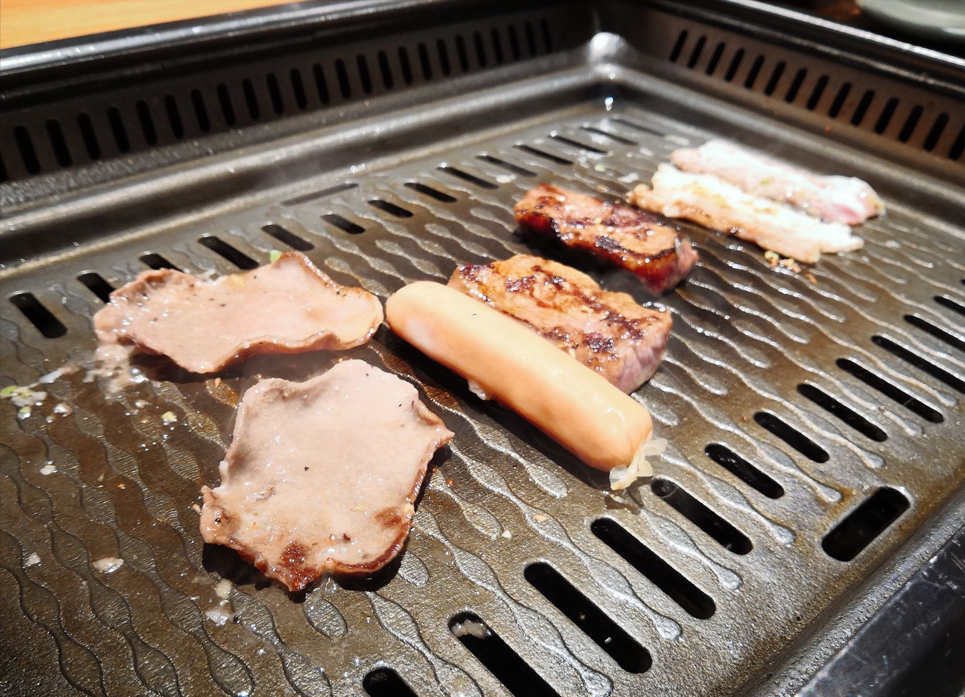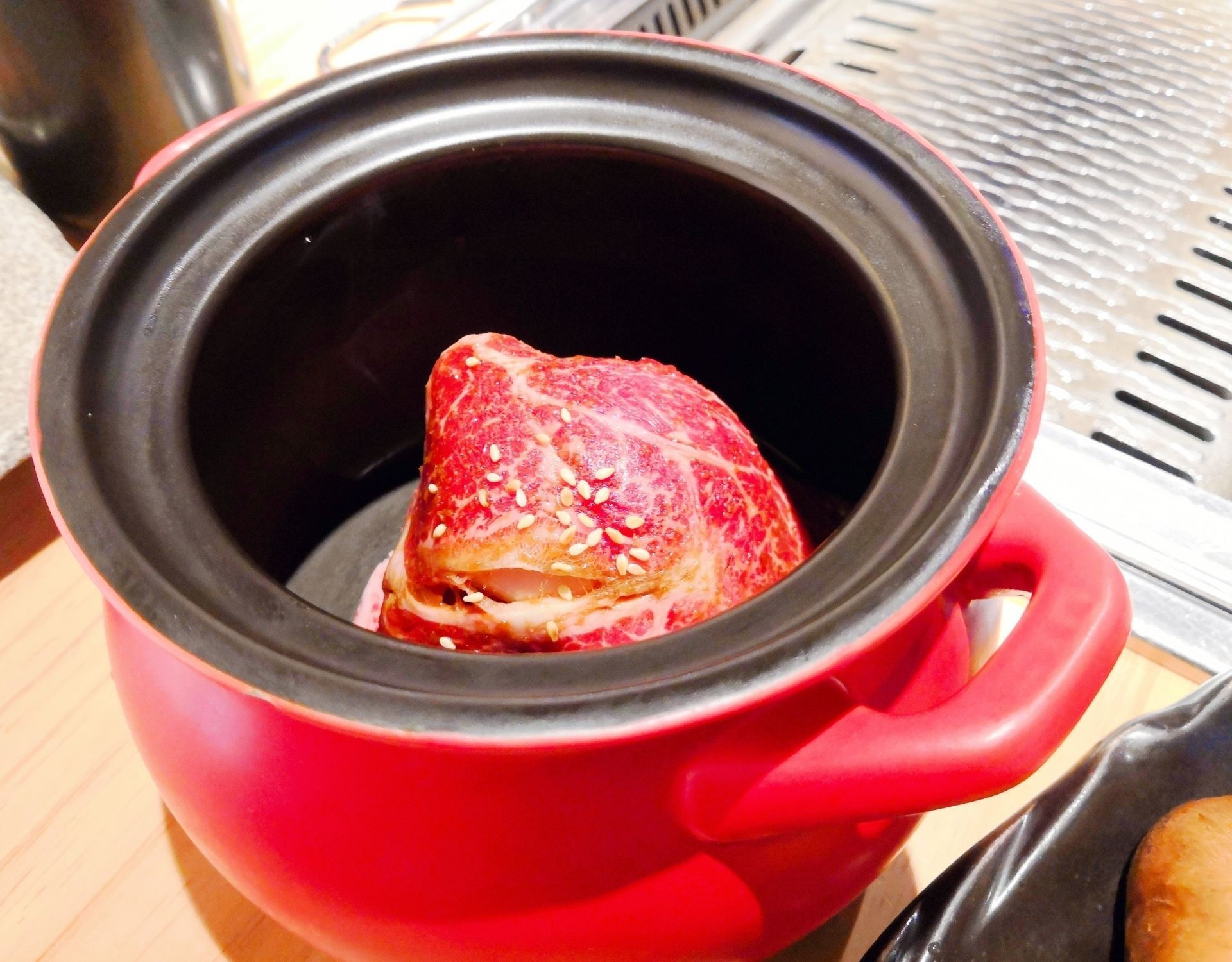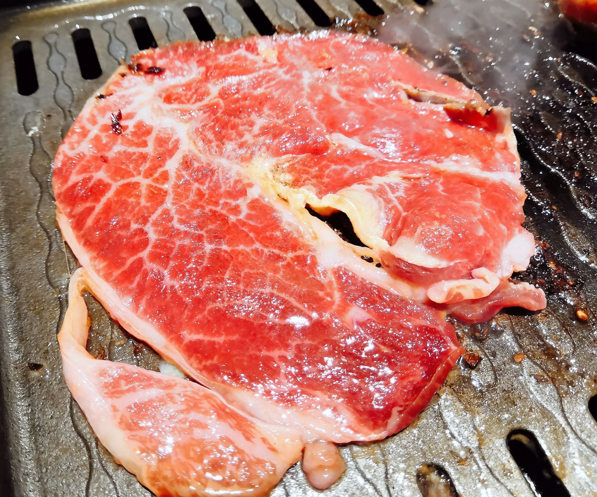 用吃肉开启放假模式,真是惬意呀!陪闺蜜在万象城买买买之后,直奔商场里的焱铁烧去了。整体灰黑色的工业风,搭配原木地板,蛮简约炫酷的。 焱铁烧主打招牌是黑毛和牛,选择很多,有搭配好的套餐,不仅有肉还有素菜,还有饭后甜点。看了下价格还是蛮划算的哦。 餐前会先上开胃小菜有四款,花生,脆瓜,萝卜干、裙带菜。服务员帮忙准备了黑胡椒,辣椒,还有酱汁,共3款调料,当然不止这些旁边的罐子里还有其他调料,看客人口味喜好自己diy。如果烤肉不知道从何下手也没事,店员会教我们烤肉也会帮忙烤肉,及时更换烤盘。服务很积极主动。 Ta家的肉很鲜嫩,不需要太多调料。经过简单的烤制,迸发出牛肉本身的甘甜口感。 瓦罐牛肉:肉红艳艳的刚上桌看着就很有食欲。每一片都好大,烤肉发出滋滋的声响,入口香软有味,很嫩。 盐烤牛舌:也是店里的热门菜品之一,肉汁饱满嫩滑,口感弹牙爽口。香味十足。