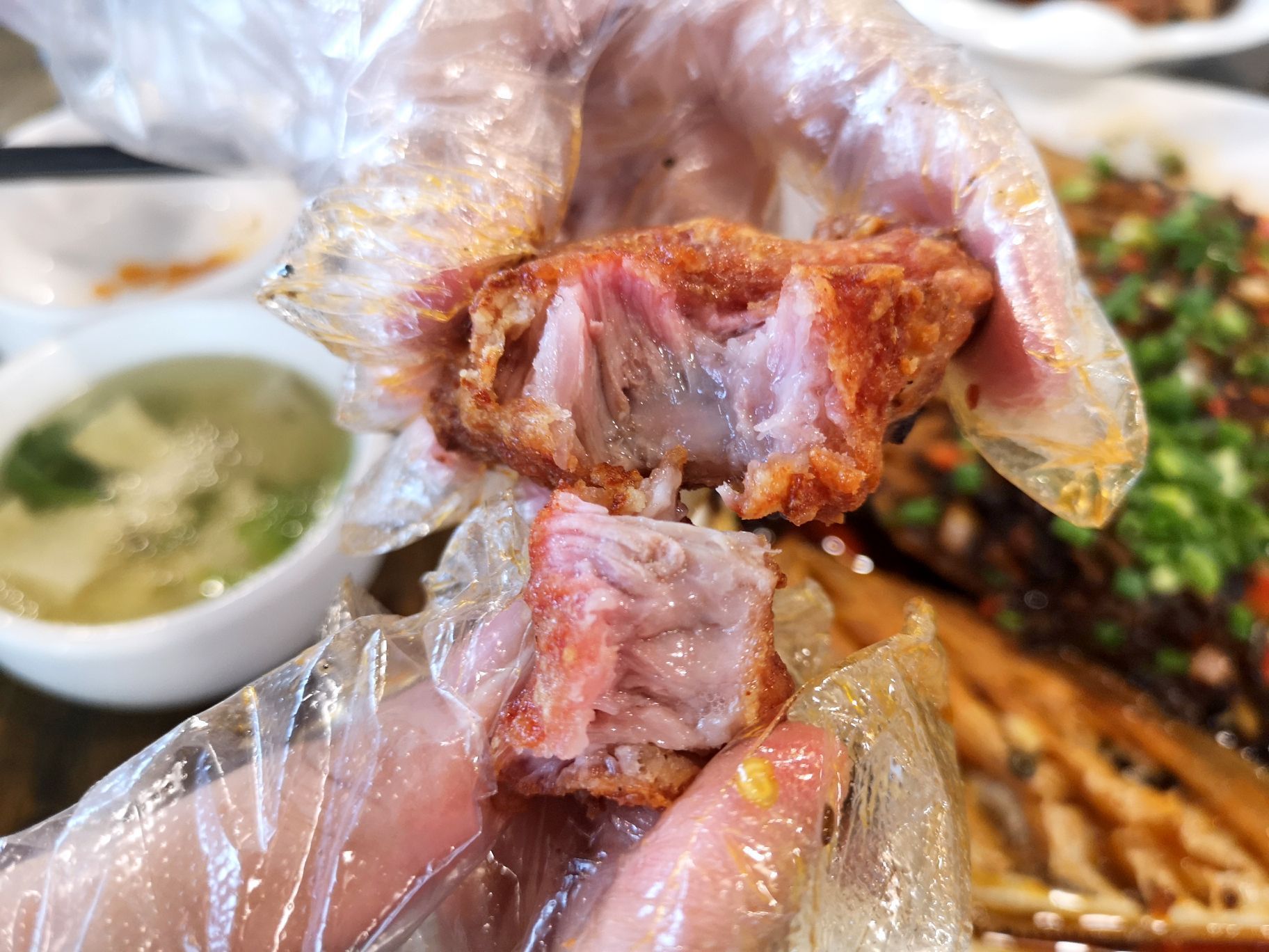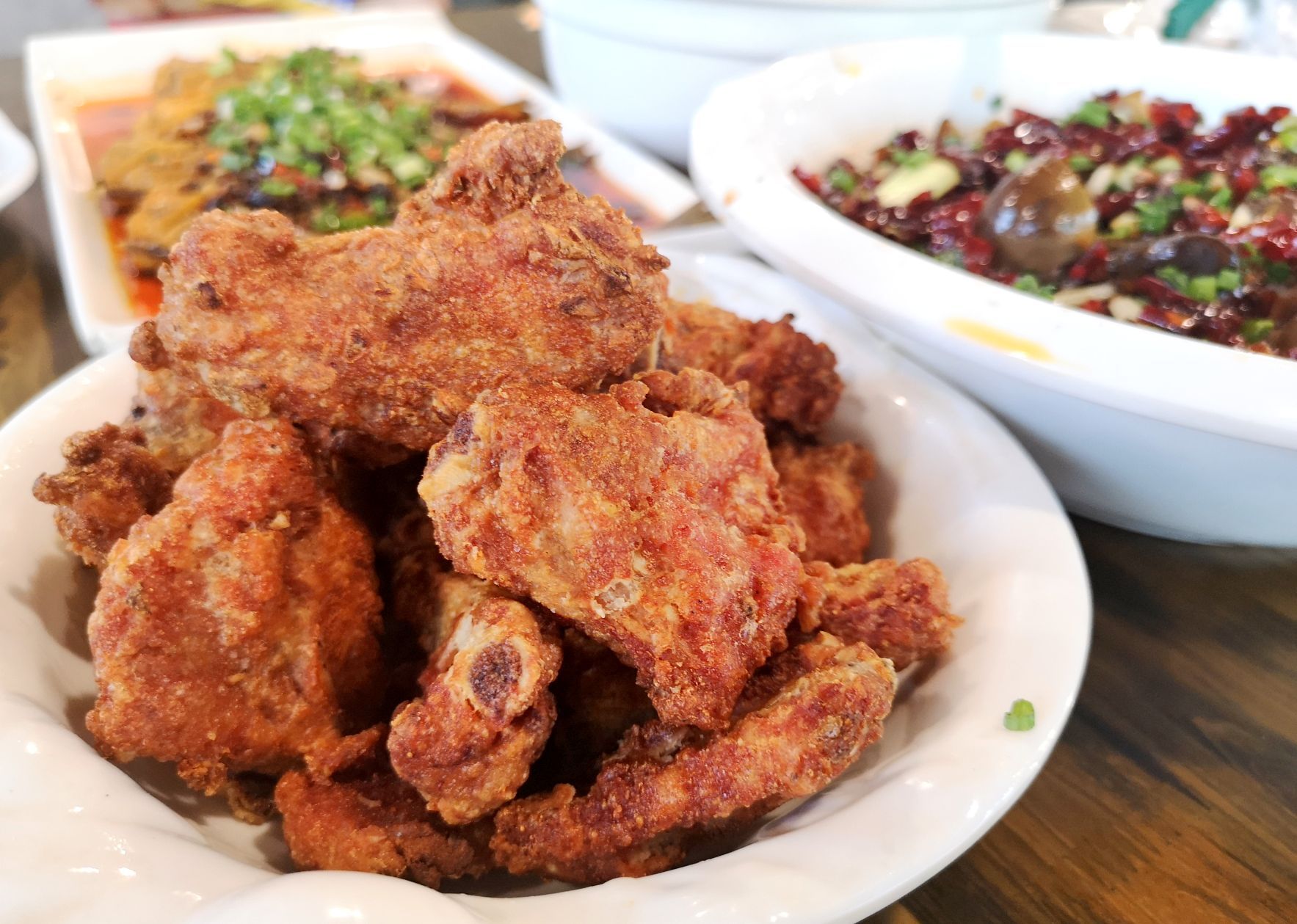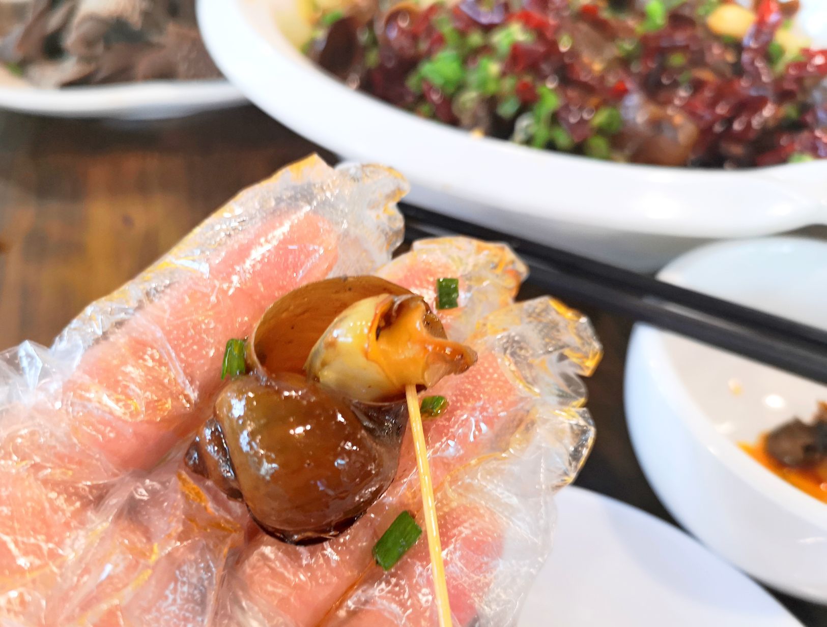 北碚很有名的江湖菜馆,晚点5:30才营业。 这边环境是谈不上的,降温基本靠墙上的大风扇,风力十足,还蛮凉快的。 特色就是各种江湖菜,特色的秘制田螺,味道还不错,一大盆佐料就占了一半,这就是江湖菜的特色,佐料满满的。螺蛳肉也比较Q,只是偶尔也会吃到一个臭的,小心点呢。 蒜香排骨也是很大一份的,排骨外皮很脆,里面的肉还是很嫩的。 拌毛肚不如旁边的红霞好吃,味道略淡。 总体口味还不错,就是滴比较辣,不喝酒的话一定要冰饮料才解渴哦[色]