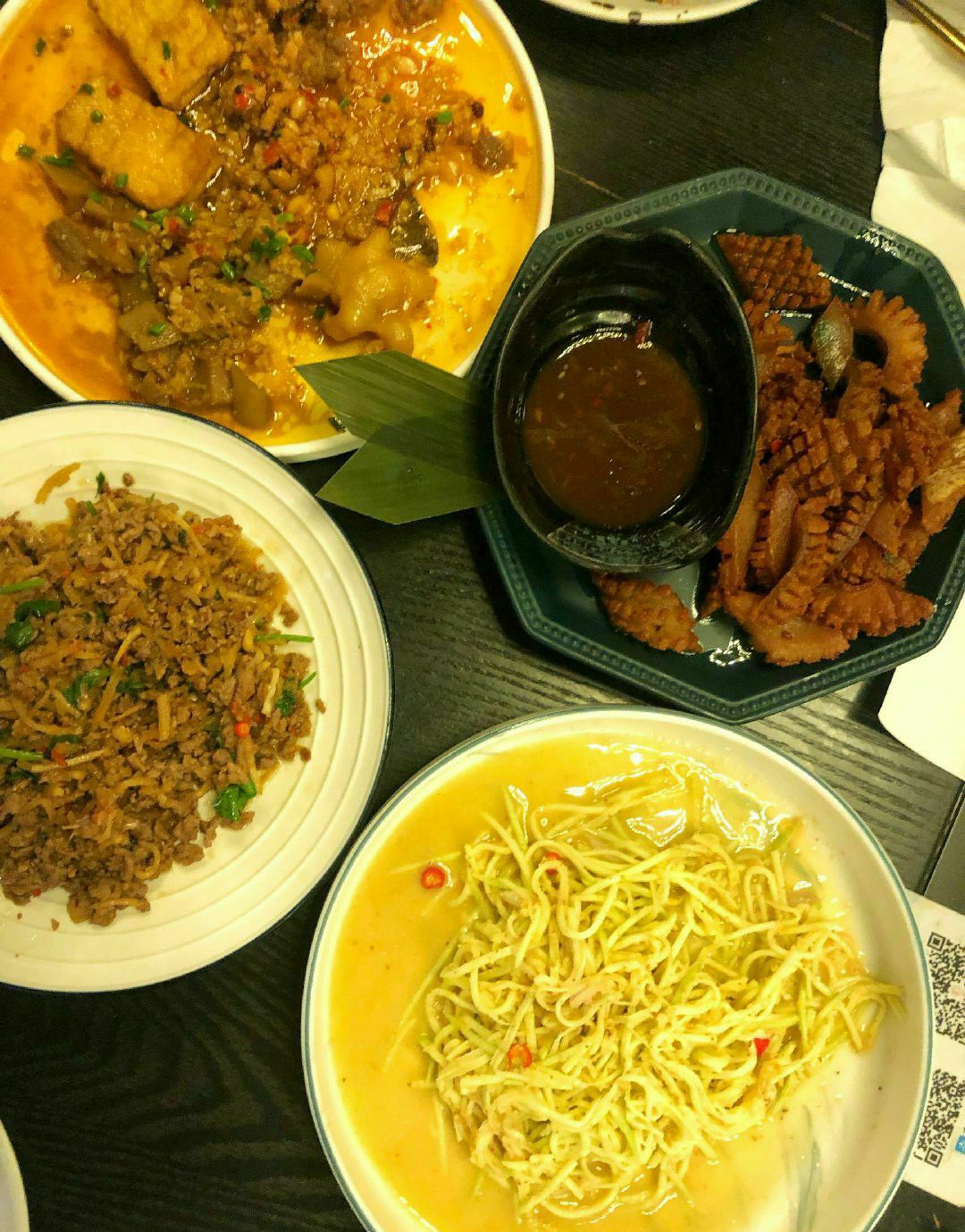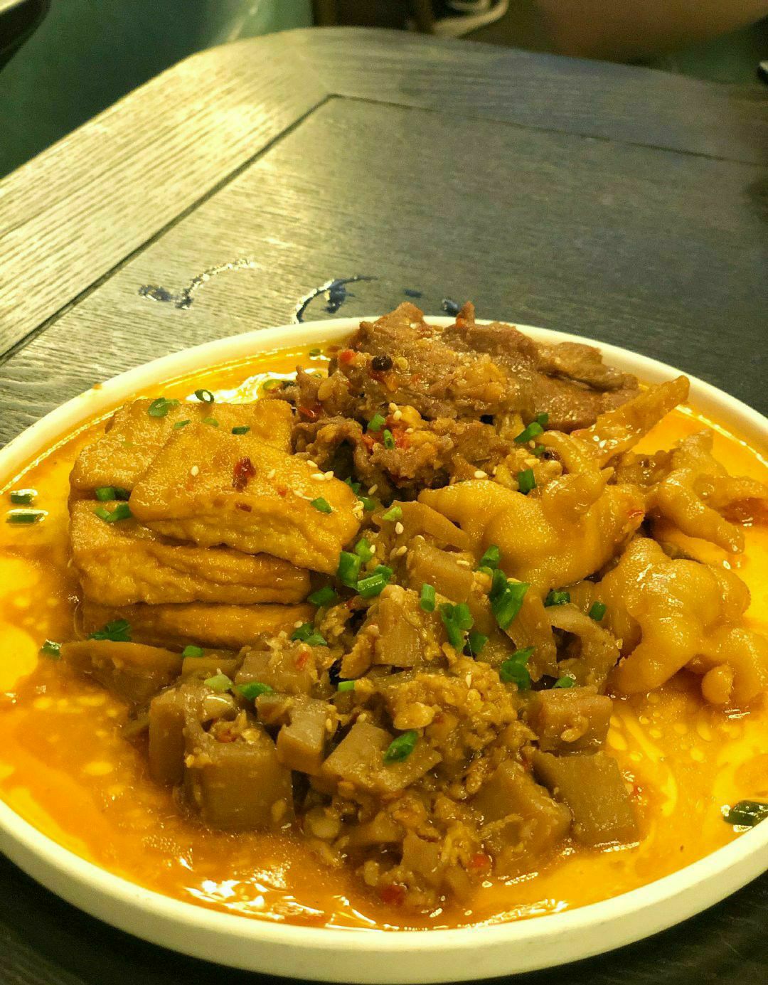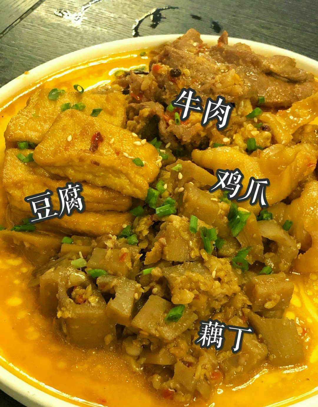 | 土司铜锅油焖鸡 | 微微辣已经够辣,分量超足,小份足以3-4人食用,鸡块几乎没有骨头,每块都是足足的鸡肉,肉质鲜嫩,里面的土豆被炖的酥烂绵密,个人觉得土豆比鸡肉更加入味好吃,拌饭吃更佳! | 鸡爪 牛肉 藕丁 豆腐蒜香四拼 | 小份拼盘可以一次吃到想吃的菜品,蒜香调味非常棒,非常推荐豆腐!类似于臭豆腐的口感,软软的吸了好多汁水!去骨鸡爪也很有韧性,调味特别棒! | 酸笋炒肉 | 喜欢螺狮粉的小伙伴们一定要点这道菜!完全就是螺狮粉的浇头~酸酸臭臭的超级得劲! | 爆油猪皮 | 第一次尝试吃猪皮,被刀切过的猪皮油炸后看上去像鱿鱼卷似的,一入口就被弹糯的口感惊艳到了!蘸料酸甜口可以解猪皮的油腻,一定要趁热吃冷了就咬不动了。 | 青青芒果丝 | 这道凉菜非常解腻,浇了芝麻酱还是花生酱调味增添了口感,吃完几个辣辣油油的菜之后吃它真的清清爽爽! 这家店的菜全都香咸入味好下饭!不知不觉就扒拉扒拉一碗饭下肚。
