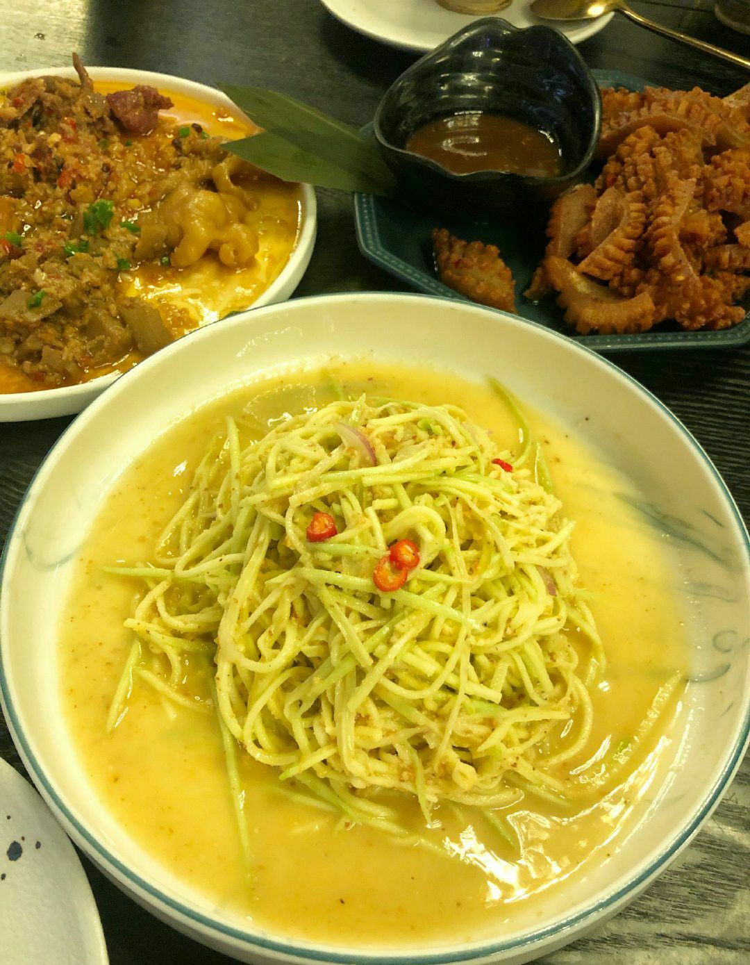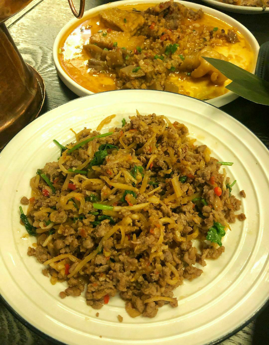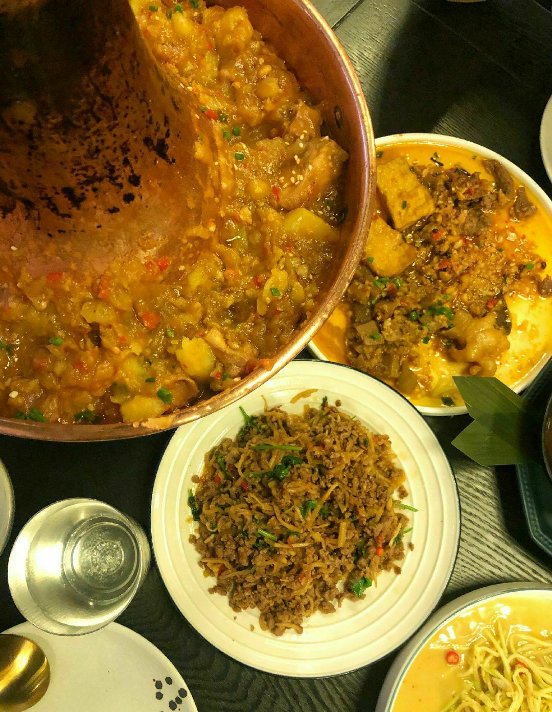 | 土司铜锅油焖鸡 | 微微辣已经够辣,分量超足,小份足以3-4人食用,鸡块几乎没有骨头,每块都是足足的鸡肉,肉质鲜嫩,里面的土豆被炖的酥烂绵密,个人觉得土豆比鸡肉更加入味好吃,拌饭吃更佳! | 鸡爪 牛肉 藕丁 豆腐蒜香四拼 | 小份拼盘可以一次吃到想吃的菜品,蒜香调味非常棒,非常推荐豆腐!类似于臭豆腐的口感,软软的吸了好多汁水!去骨鸡爪也很有韧性,调味特别棒! | 酸笋炒肉 | 喜欢螺狮粉的小伙伴们一定要点这道菜!完全就是螺狮粉的浇头~酸酸臭臭的超级得劲! | 爆油猪皮 | 第一次尝试吃猪皮,被刀切过的猪皮油炸后看上去像鱿鱼卷似的,一入口就被弹糯的口感惊艳到了!蘸料酸甜口可以解猪皮的油腻,一定要趁热吃冷了就咬不动了。 | 青青芒果丝 | 这道凉菜非常解腻,浇了芝麻酱还是花生酱调味增添了口感,吃完几个辣辣油油的菜之后吃它真的清清爽爽! 这家店的菜全都香咸入味好下饭!不知不觉就扒拉扒拉一碗饭下肚。