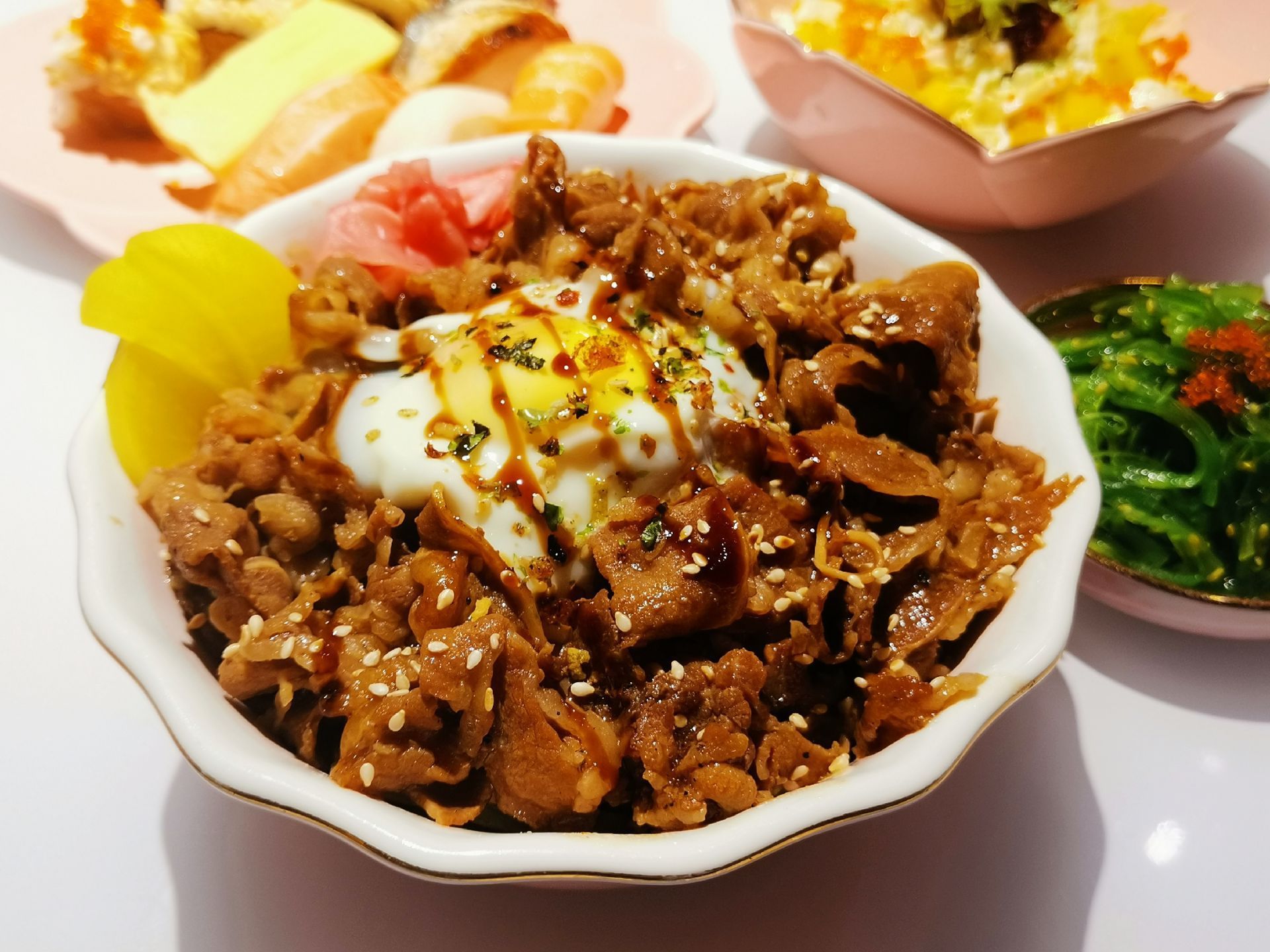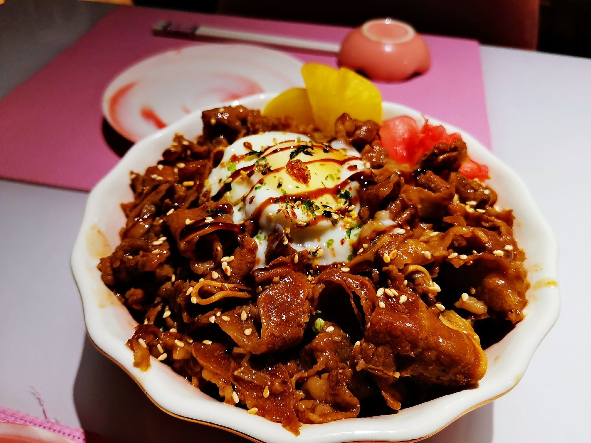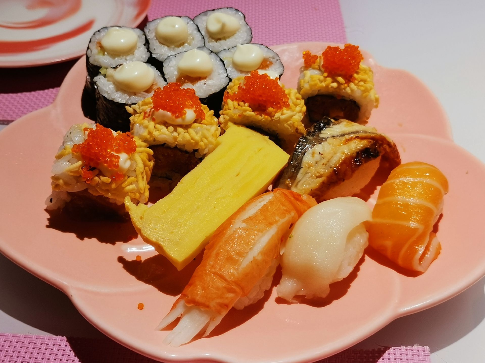 这家粉色系的日料店,去了就想谈恋爱 乐云棚网红料理位于镇邦路47号,隐藏在中山路旁的巷子里。一进餐厅,网红ins粉色系装修风格再加上随处可见的人偶、面具、提灯、油纸伞等日本元素的点缀,给人唯美浪漫的感觉,完美的设计颠覆我对日料店的传统装修风格的印象。 推荐在二楼用餐,静谧的环境,活泼的色调,柔和的灯饰,还有网红玻璃球吊椅、公仔、浴缸,这样的环境不仅适合品味日料的魅力,更让人忍不住拍拍拍,餐厅还提供和服,穿上和服拍照打卡,真是敲美哦。作为单身狗,在如此粉嫩梦幻的餐厅,真的有想去谈恋爱的冲动❤。 【寿司】这次点了什锦寿司拼盘和曼谷风情卷,不同种类的寿司带来不一样的味蕾体验 。 【芝士焗大虾】芝士味浓,虾肉鲜甜,虾的个头也不小。 【牛肉饭】份量十足,满满一大份牛肉,这么大的份量适合两人食用,牛肉饭上还有粒温泉蛋,一口吃下去超满足。 【芒果蟹子沙律】芒果粒、蟹籽和沙拉完美地融合在一起,酸酸甜甜的,营养丰富。 【三文鱼头】虽然造型有点吓人,不过微焦的鱼皮香香脆脆的,鱼肉肉质软嫩,特别入味。 人均大约100元,很喜欢这样让人少女心满满的餐厅。