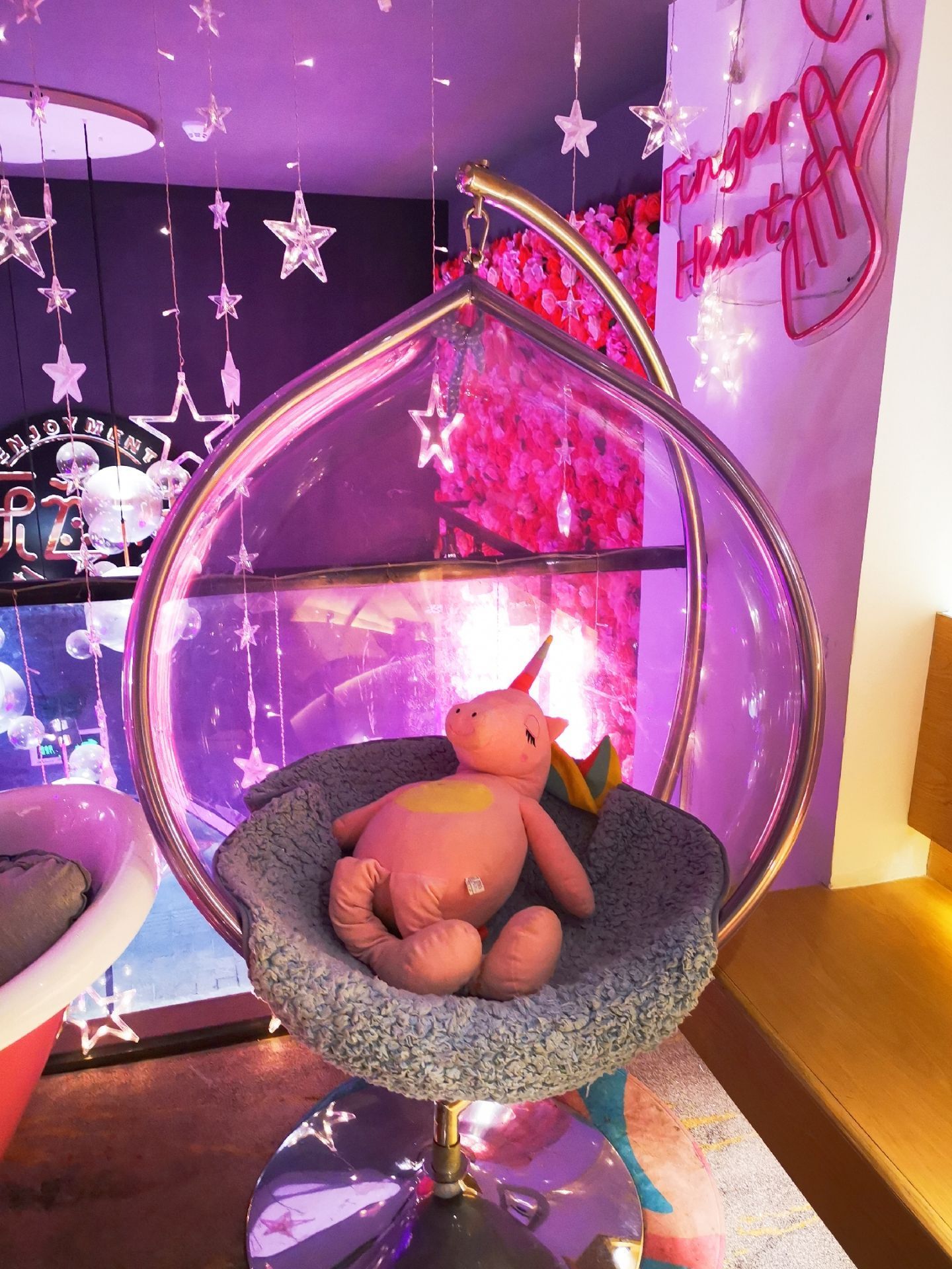 推荐在二楼用餐,静谧的环境,活泼的色调,柔和的灯饰,还有网红玻璃球吊椅、公仔、浴缸,这样的环...