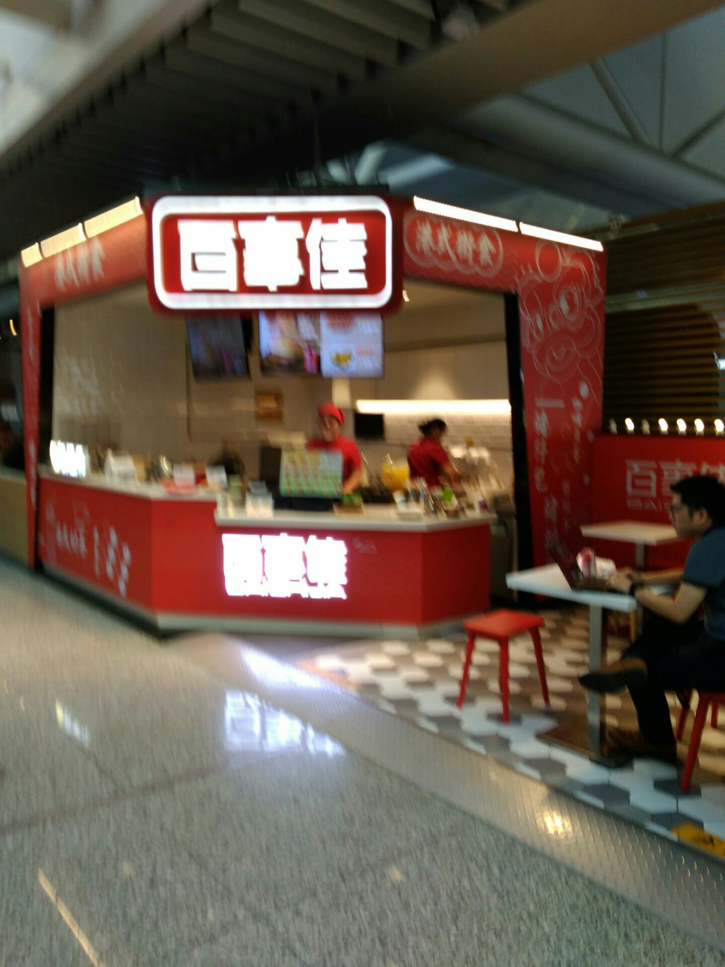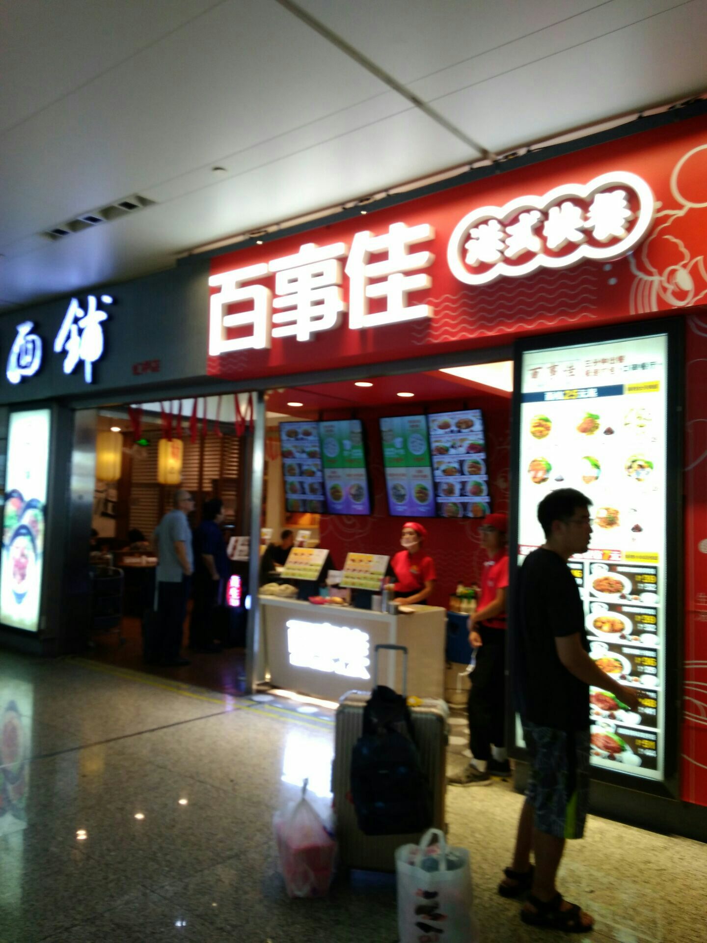 百事佳大大的霓虹灯招牌,一闪一闪的,非常显眼的。百事佳港式快餐在上海虹桥高铁站三楼的餐饮区域里
