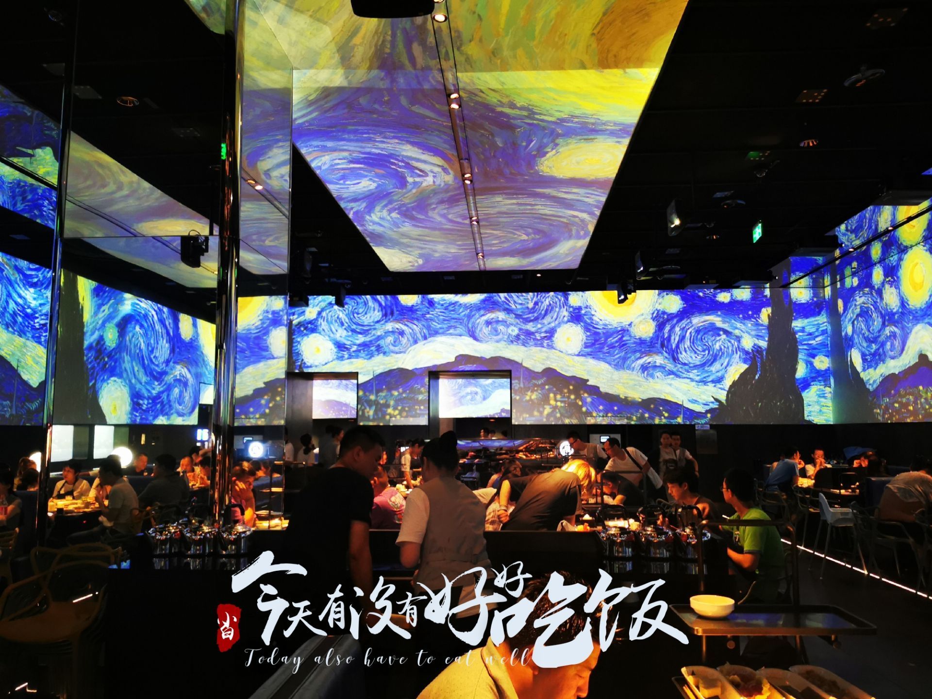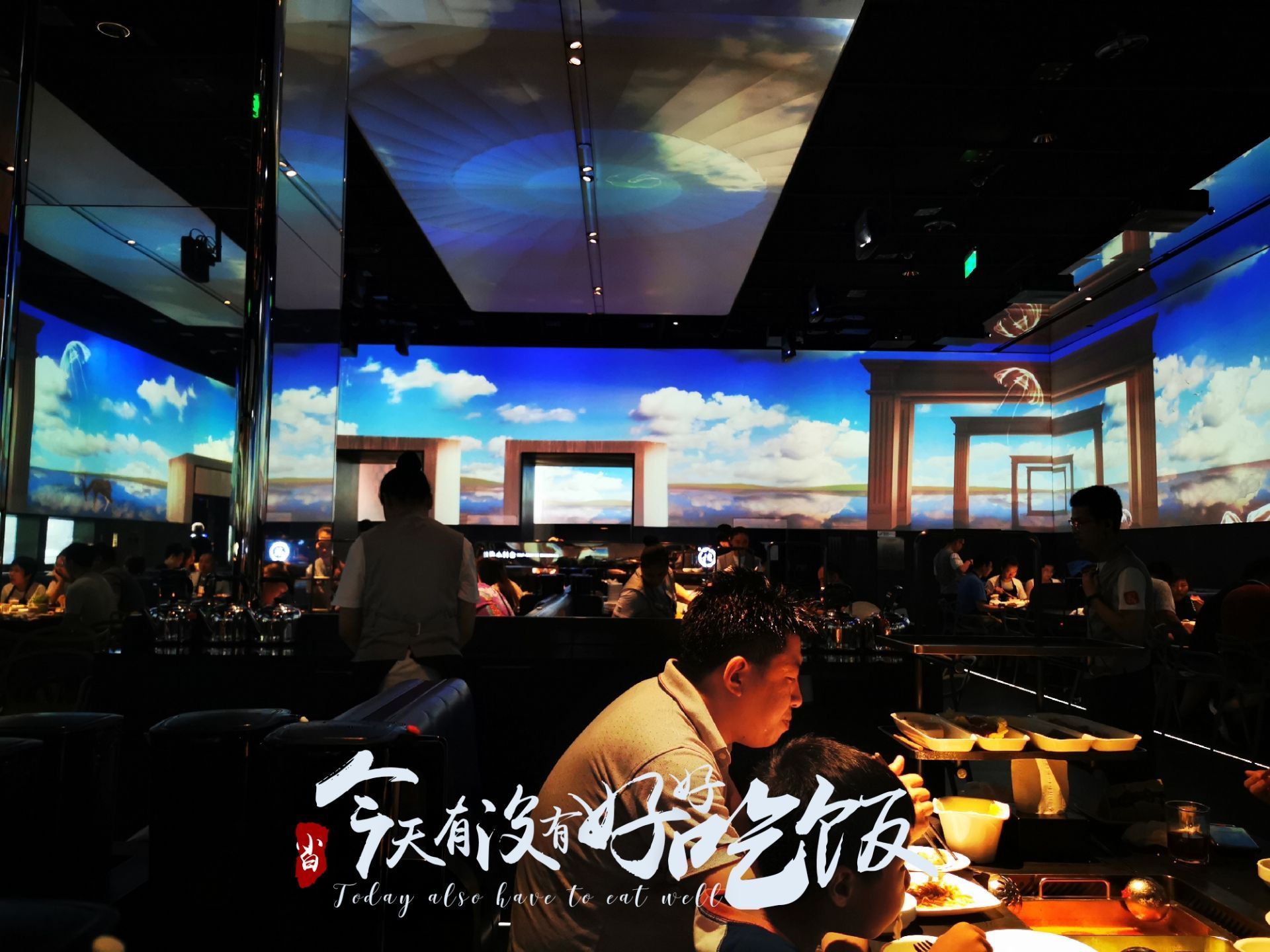 ...区域像一个超大的宴会厅,唯一不同在于四周被显示屏包围,循环播放一图案,为用餐提供不同的氛围感受