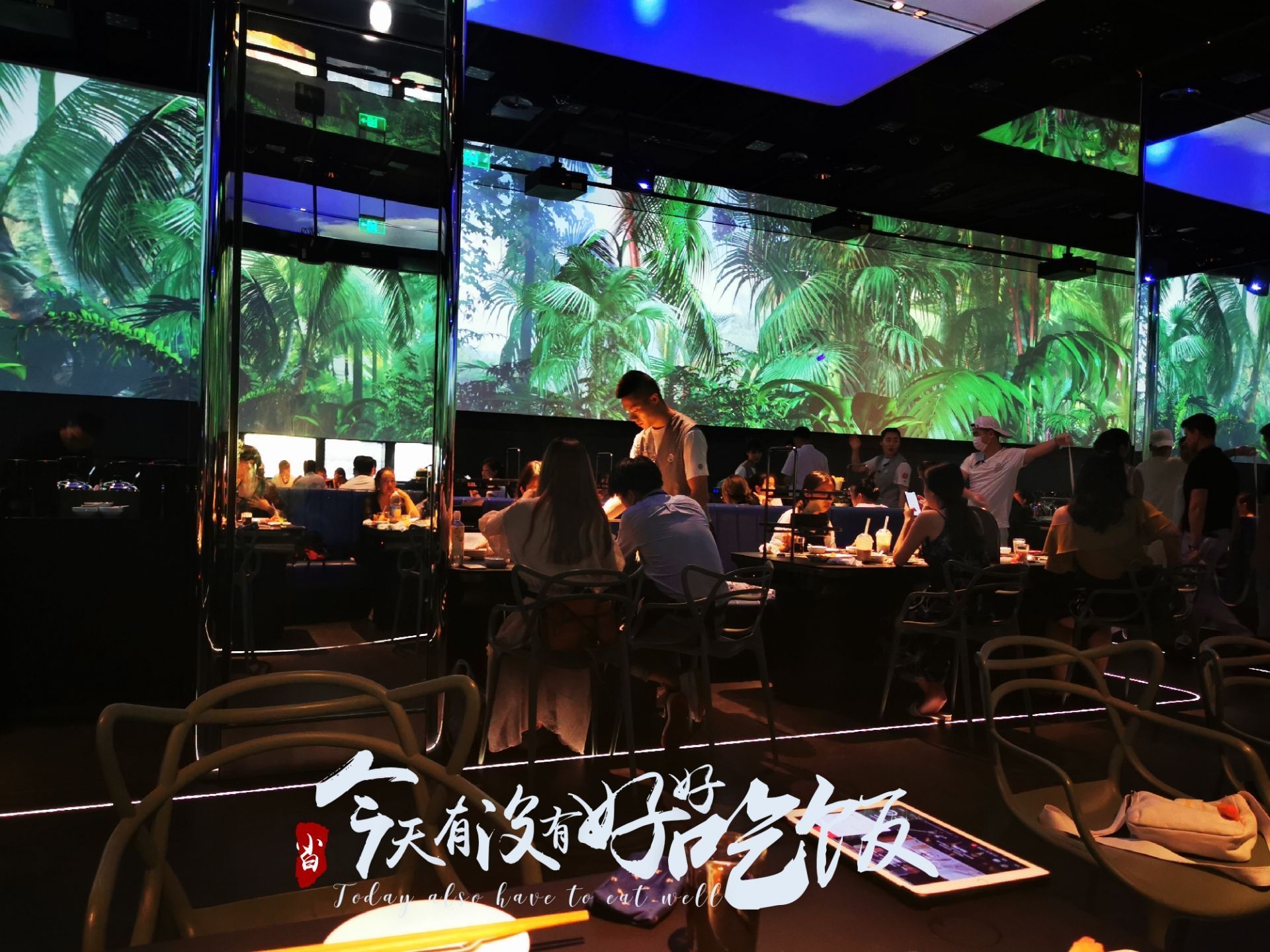 终于终于拔草了海底捞智慧餐厅!很有惊喜感! . 入门的等候区域,没有了美甲和擦鞋服务,换成了一个“电影院”区域。等候区域设置了一块类似电影院的区域,拥有一个十几米长的显示屏,客人在这里玩海底捞自己研发的小游戏“吃货大作战”,下载海底捞 App 扫描屏幕中的二维码就可以一起玩游戏。大屏幕的右下角会实时显示排号和部分餐厅后厨的工作状态。 . 通过等待区域,可以通过透明玻璃窗看见里面的机器人备菜的过程。一份份菜品摆在货架上,机器人通过操作为餐厅提供服务。玻璃窗下面还有一些显示屏,循环播放机器人备菜的操作说明,很有意思。 . 整个用餐区域像一个超大的宴会厅,唯一不同在于四周被显示屏包围,循环播放一图案,为用餐提供不同的氛围感受。 . 餐厅一共有6台上菜机器人,机器人也是随机服务。并不是每一桌都由机器人上菜,但是如果对机器人很感兴趣,服务员会把它召唤过来。机器人走到客人桌前会说话,这时候还是会服务员来端菜。 . 其实海底捞还是那家海底捞,服务依旧高水准。觉得是一家非常适合带家长和小朋友去体验的黑科技餐厅。