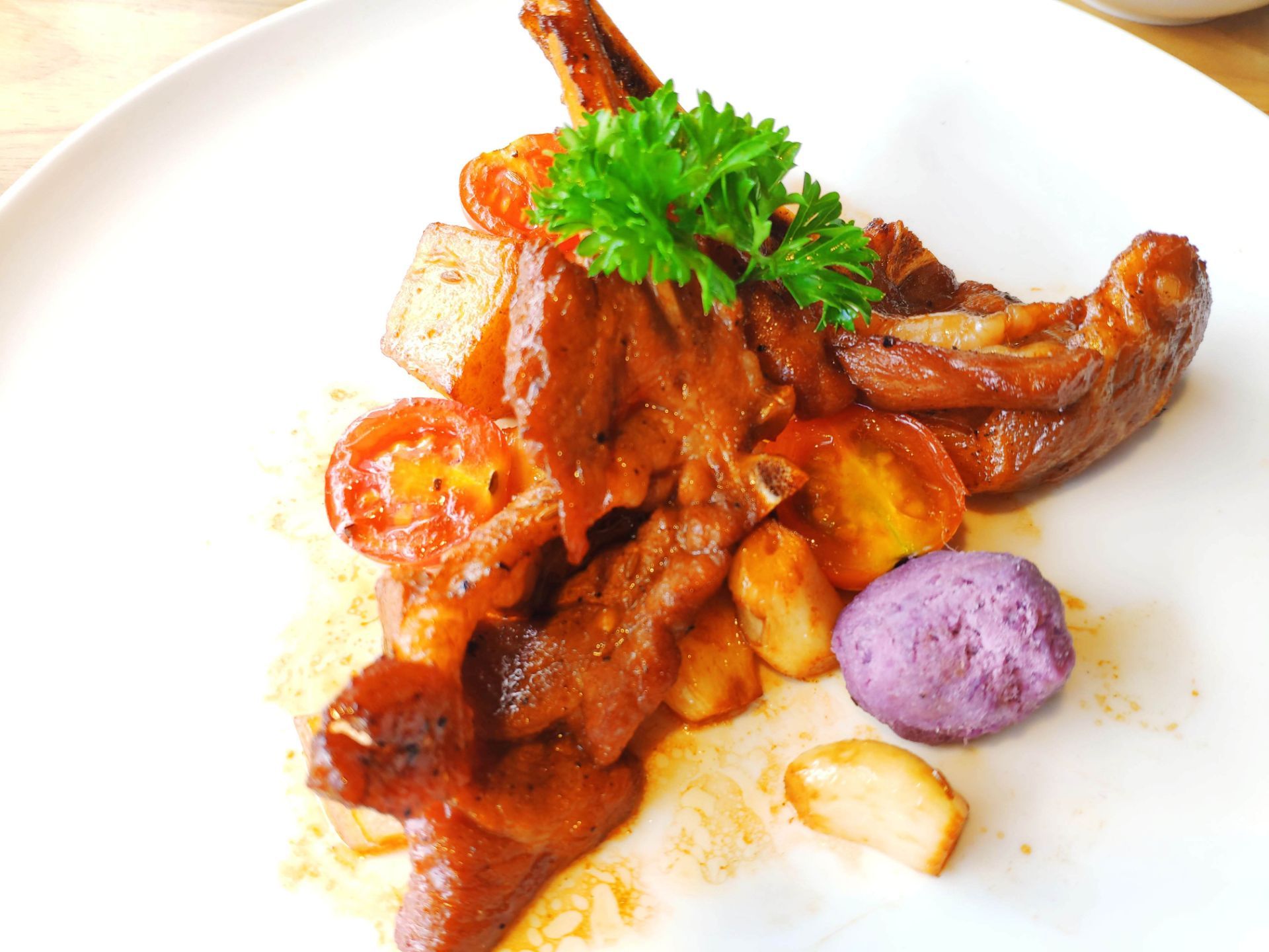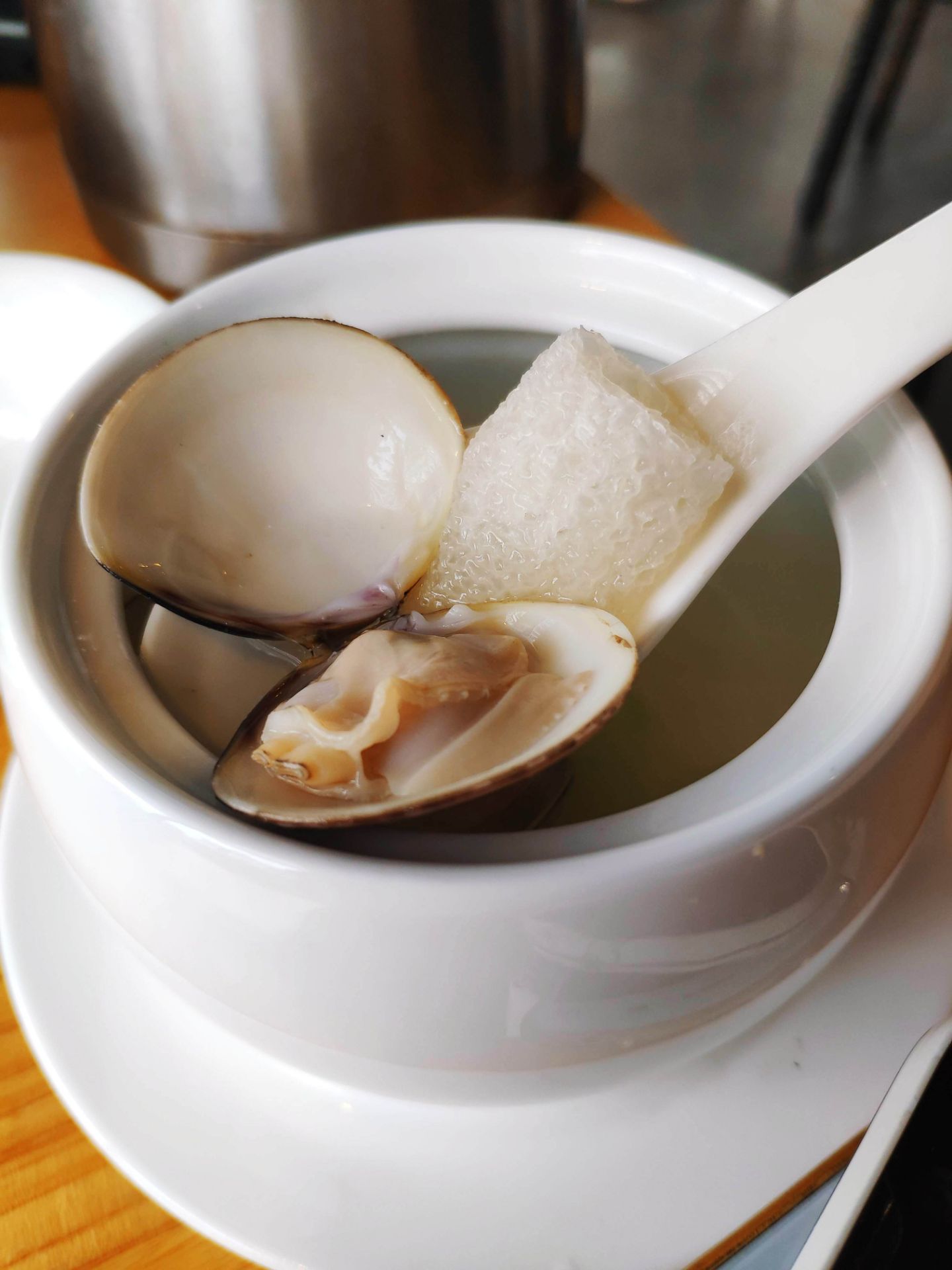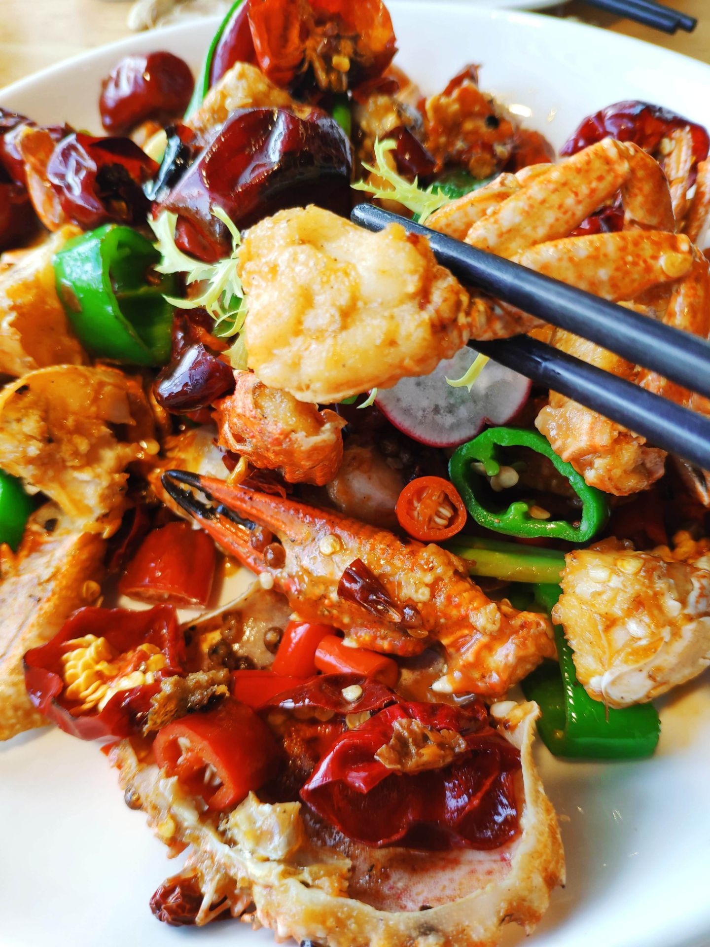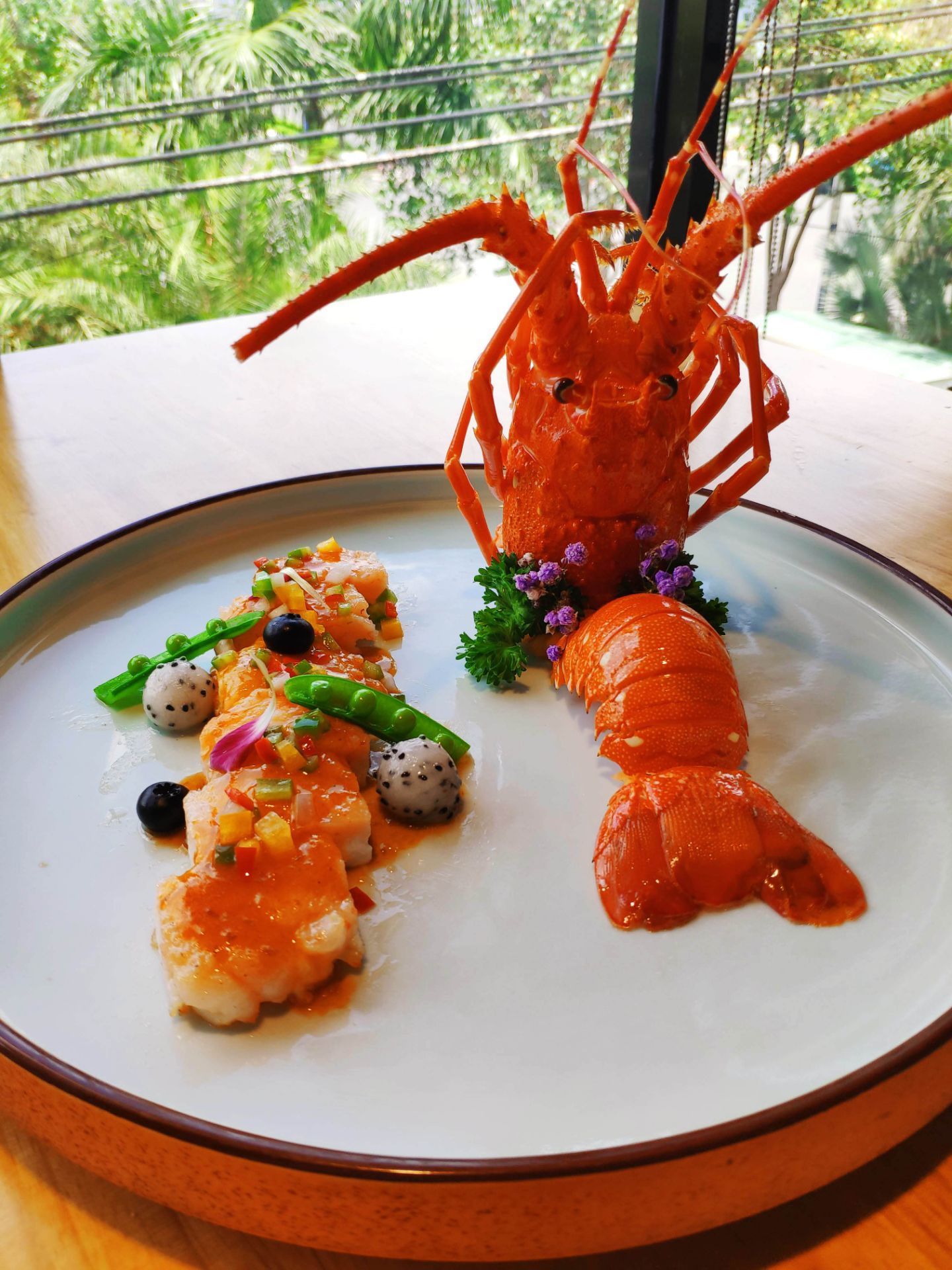 嵩屿九号海景餐厅离嵩屿码头相当的近,环境也不错,一整栋有六层楼,饭点到时候来生意可是相当的好,坐满了人。菜品好吃,摆盘也极为精致,哈密瓜汁,带着纯正的哈密瓜香,鲜甜可口,相当的不错。海苔炒饭,米粒颗粒分明。堂煎小龙虾,新鲜的龙虾肉,用心剥离出,肉质弹牙,可口,香辣蟹,新鲜的蟹,满满的膏,肉质肥美,辣压去腥味。迷你芒果鹅肝球,可爱的造型,铺满的芒果丁口感丰富。法式羊排配紫薯球,羊排没有膻味,细嫩的羊肉,口味不错,竹荪浸文蛤,汤很鲜甜,入口很舒服。