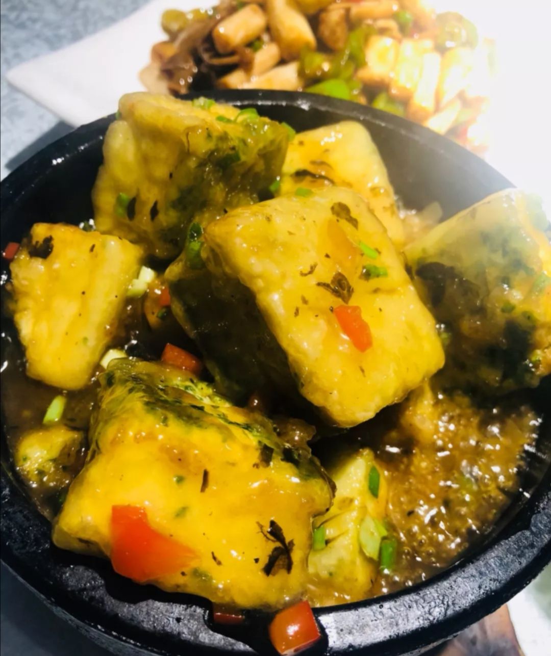 烤牛排,超级大的一盘,牛肉应该是先煮过的,外面烤的很酥脆,里面的汁水很足,外面裹着孜然和辣椒很好吃。 私房嫩豆腐,口味有一些清淡,配上特殊的浇汁,味道还行。 干锅茶树菇,味道很足,茶树菇很有嚼劲,好吃。