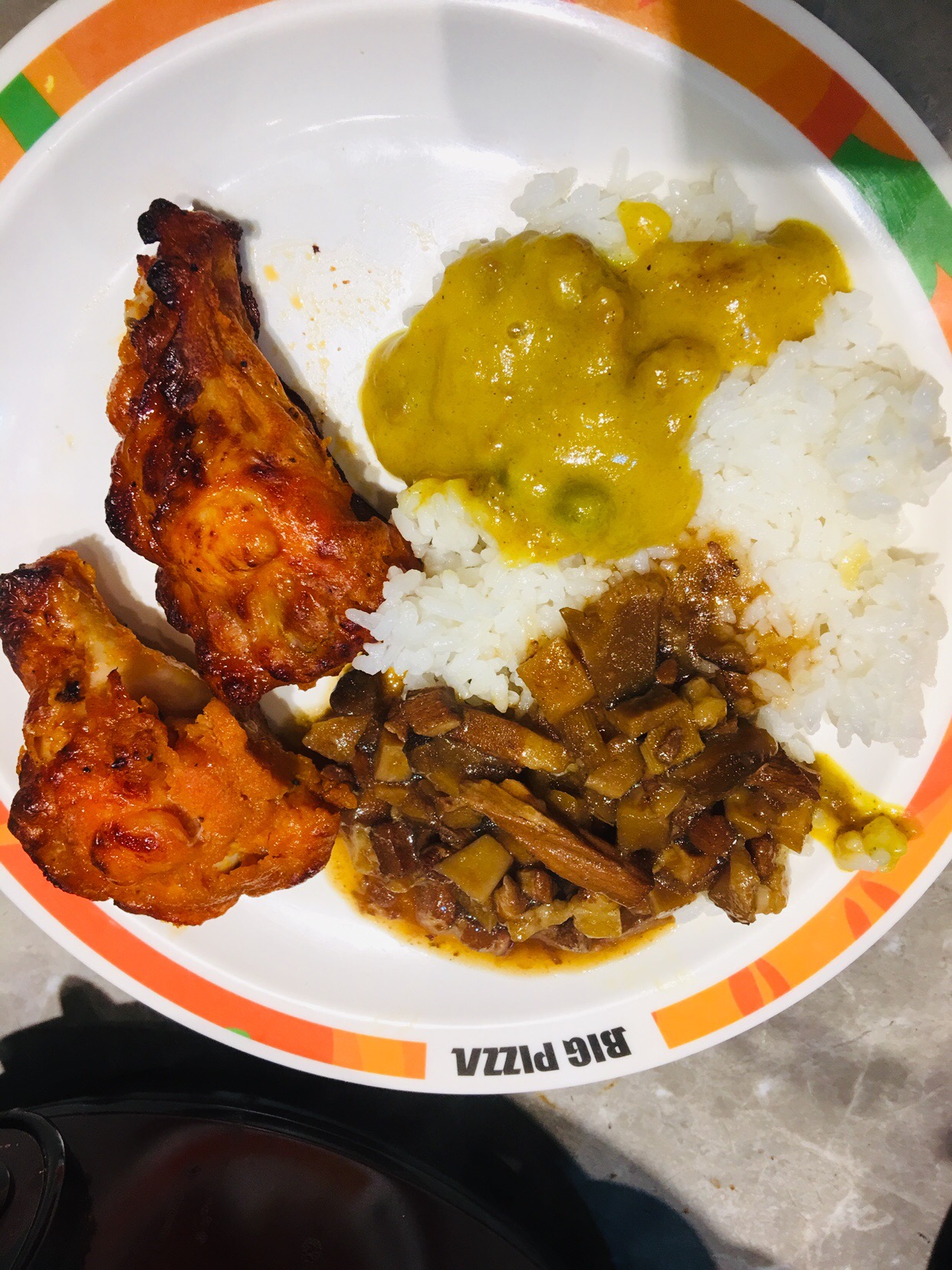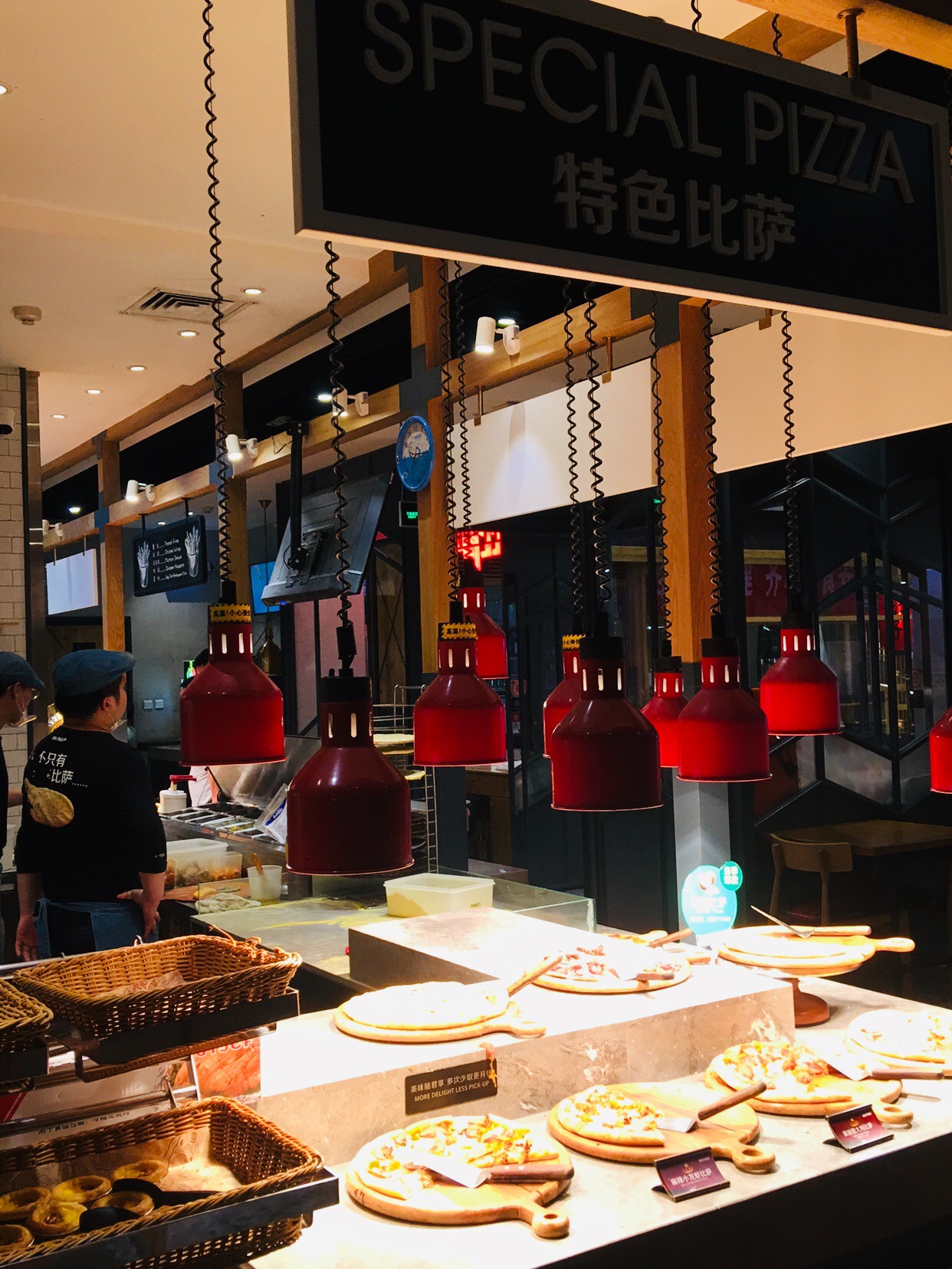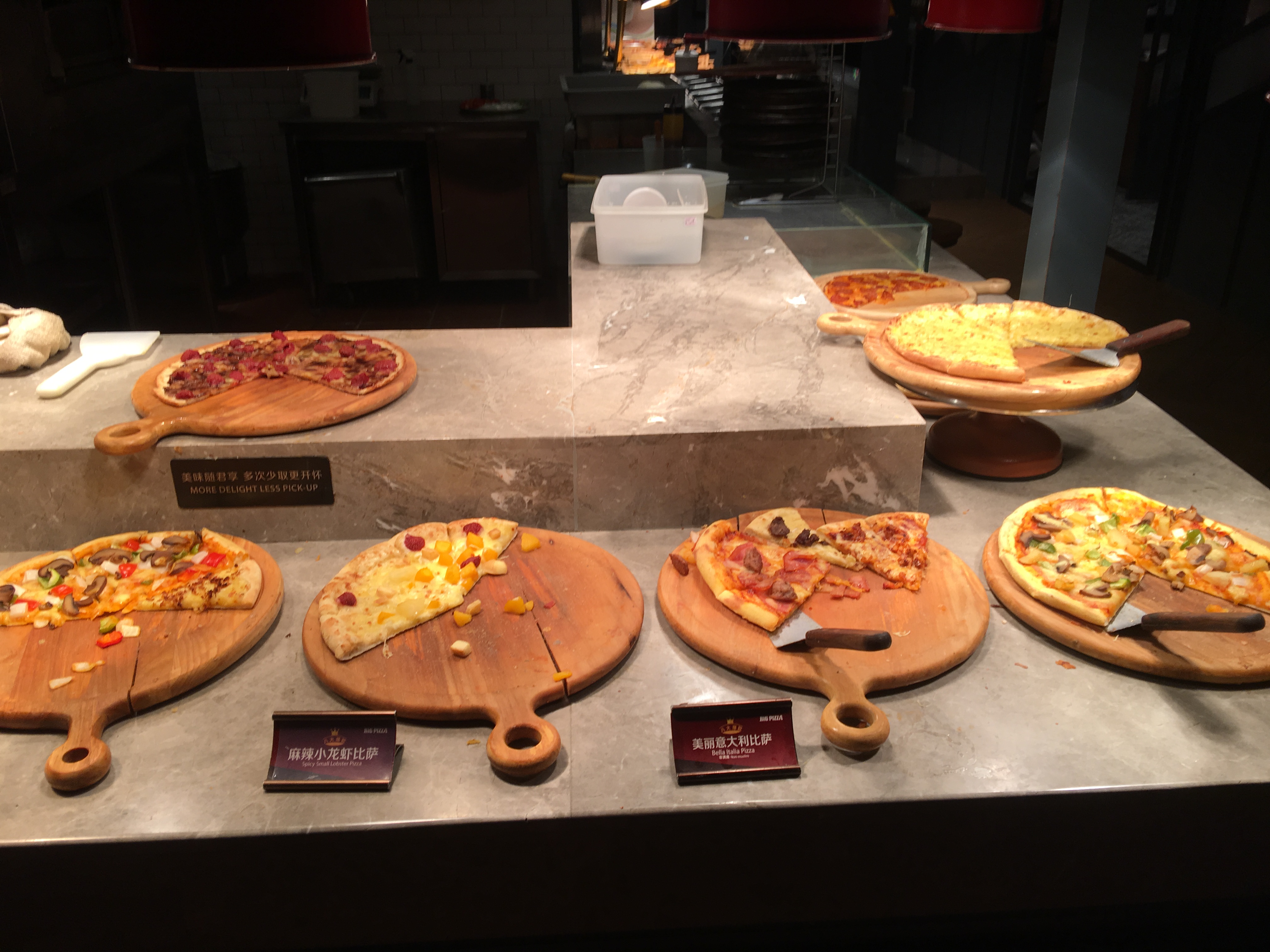 感觉每年生日期间都要到比格披萨打个卡,哈哈,因为每次都有会员生日免单券,也每次都能想起若干年来和小伙伴聚餐就会去比格,所以勾着一定会去一次。 这次选的是靠近六里桥的这家比格,在4楼美食荟萃这边,离经常去的松子日料很近,两隔壁。 可能因为当天下雨,店里人倒是不多。 披萨就试了自己最喜欢的榴莲口味披萨,和麻辣小龙虾,吃了2-3片真的饱了。 没想到比格里现在还增加了台式卤肉饭、咖喱牛肉饭和巧克力瀑布这些时髦玩意,这更吃不下去披萨了,哈哈。 热菜方面有一道冬瓜丸子汤,丸子有点牛肉丸的哪种筋道口感,还挺好吃。 热菜这边有一道粉丝煲一样的炒菜,印象深刻,还不错。 此外还提供冰淇淋,不过已经塞不进去了。 店里的服务很好,披萨可以自己点了现做,但我们人少就算了,不够吃掉一张的。 经理也随时巡视,我感觉管理蛮好。 要说最大的感触,是感叹自己一年不如一年能吃了,哈哈,虽然餐厅还是熟悉的味道,我已经眼大肚子小了……