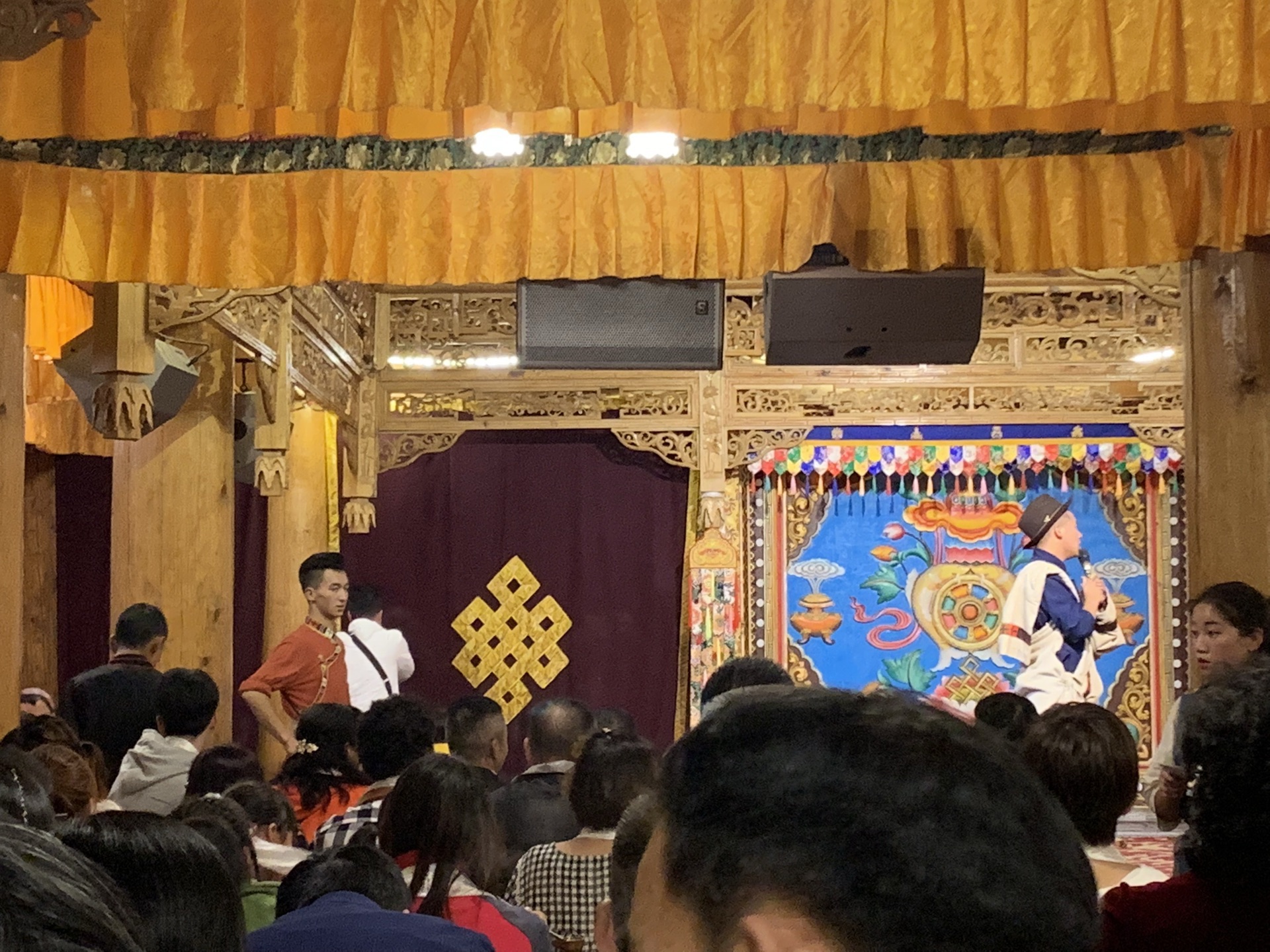 1.环境:如果你不坐前面,我建议你不要去,后面看不到,如果跟团,那就惨了,碰上6个人一排的,讲道理,这辈子没这么挤着吃火锅,就餐环境很差,因为人太多了,可能想多捞点金吧。 2餐品:餐品还吃得饱,有鸡肉,猪肉,耗牛肉,不够可以再要,餐品味道一般,因人而异吧,青稞茶,酥油饼,一些常见的藏族地区饮食可以吃到,如果说精致算不上,最多吃饱。 3服务:有些服务员还是可以的,有些态度很差,问你要不要跟吵架一样的,有些颜值很高哈哈哈,有一位门口拍照的小哥哥,真得帅哈哈哈 4门口拍照还要20块钱,送哈达什么的感觉很模式化,商业化气息还是挺浓的,晚会还是挺热闹的,主持人很会控场,也有参与游戏什么的,喜欢安静的还是不要去了,那音响吵死你。