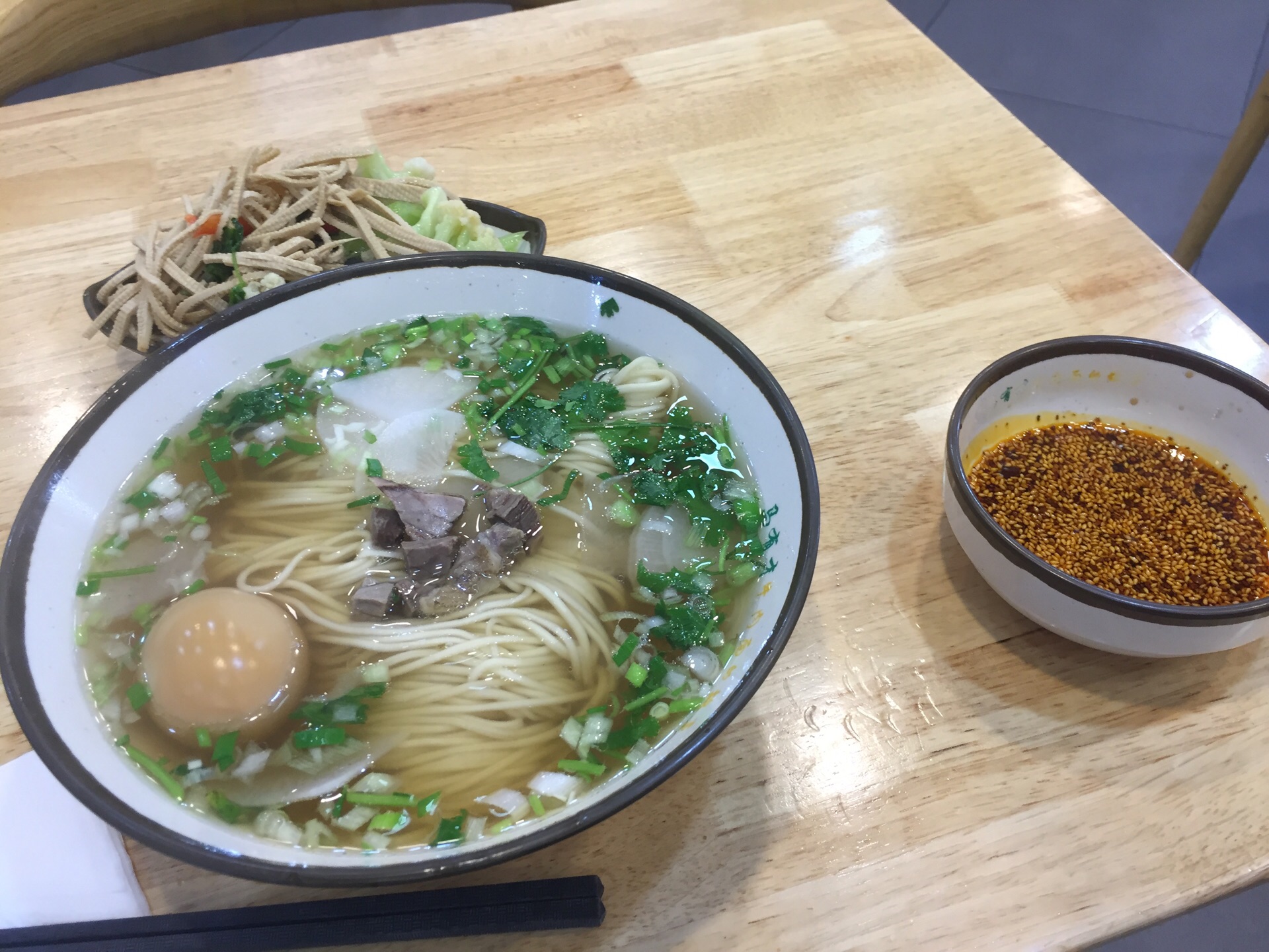...里面有卤鸡蛋,小菜,最喜欢他家的辣椒油,再加上醋,开心地吃着,牛肉板面味道不错,炸鸡柳火候正好