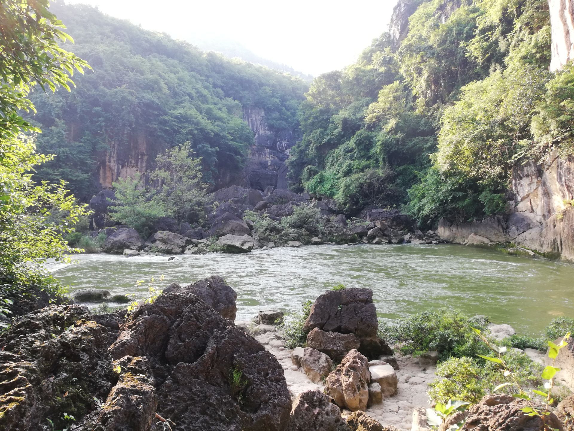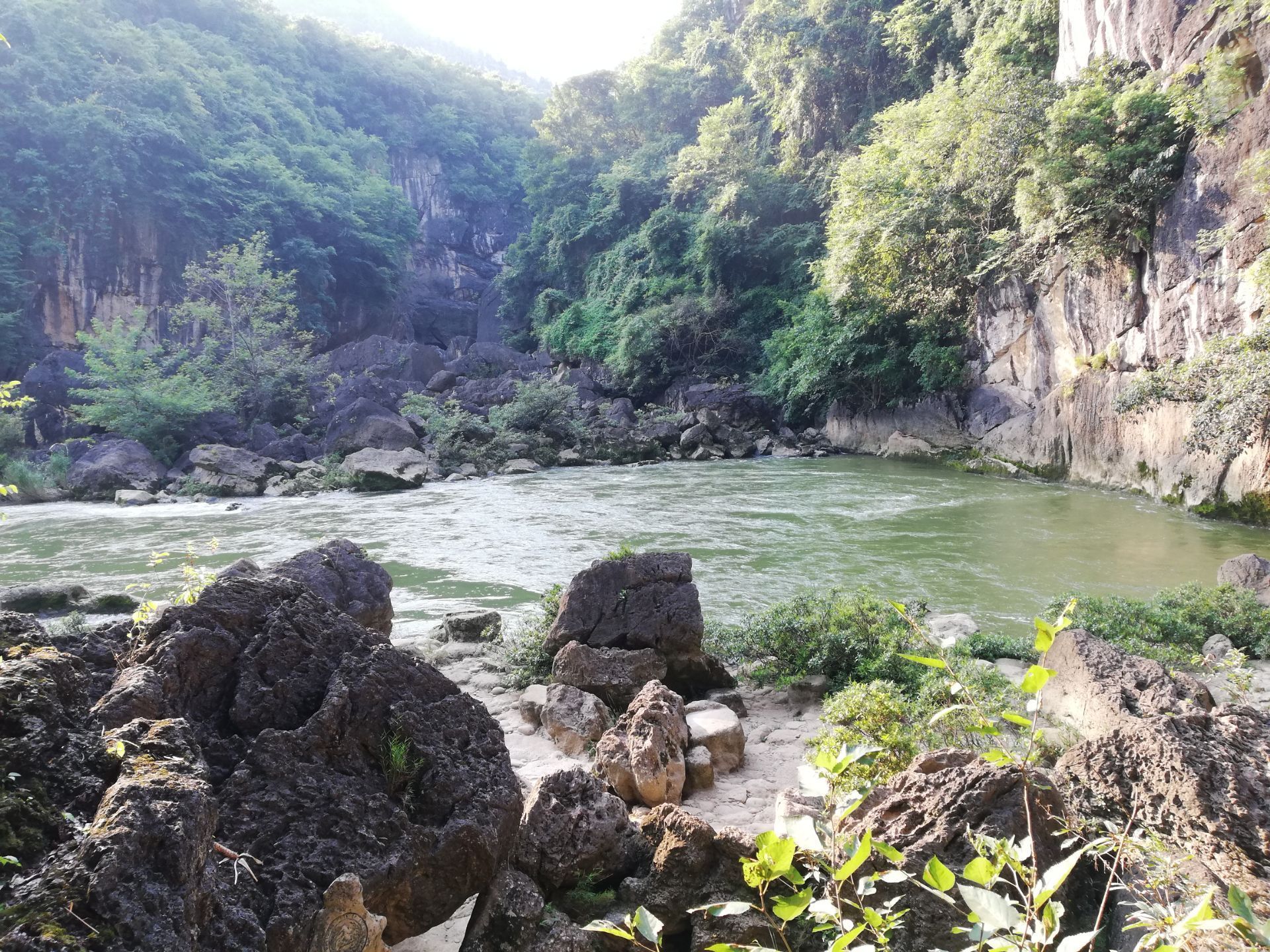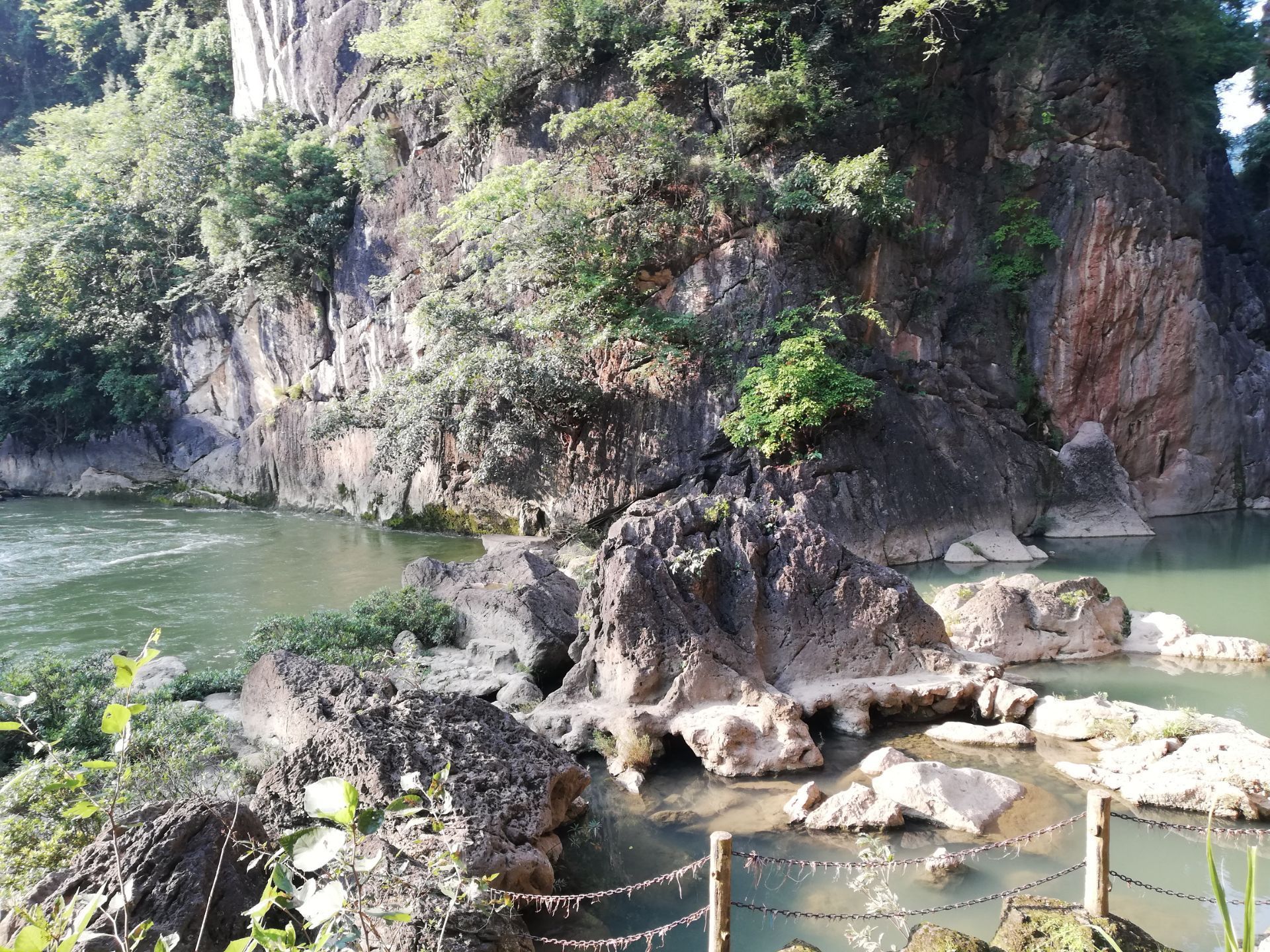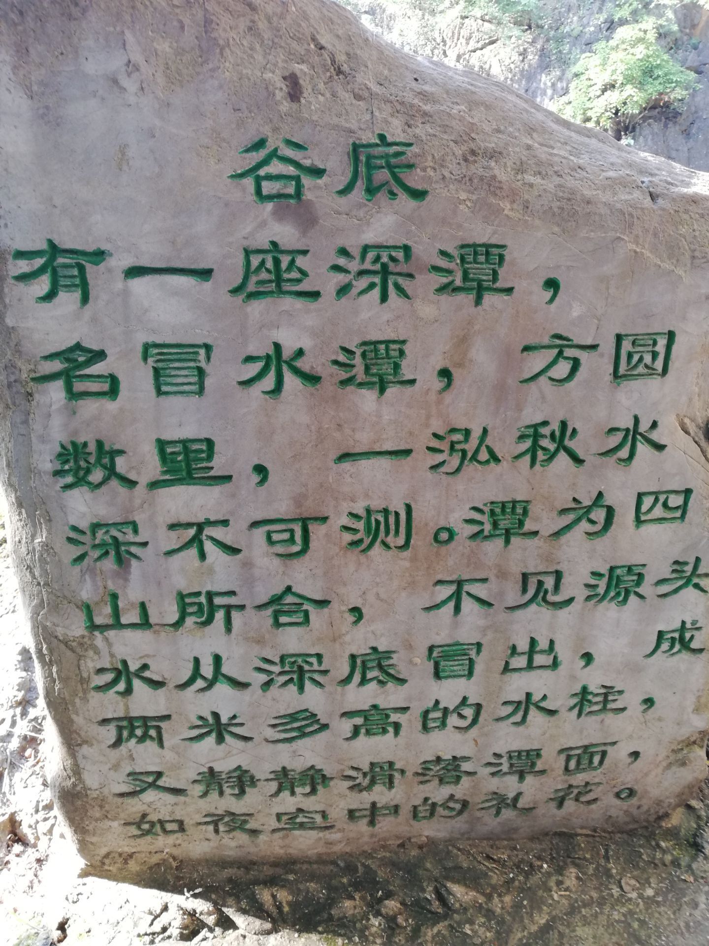 冒水潭是安顺天星桥景区里面的一个景点,临近银链坠潭瀑布。 冒水潭处有一石碑把冒水潭描给得很真实:“谷底有一座深潭,名冒水潭,方园数里,一泓秋水,深不可测。潭为四山所含,不见源头,水从深底冒出,成两米多高的水柱,又静静淯落潭面,如夜空中的礼花。”,看了这个描述,你是否心里痒痒的,想一睹为快呀? 图片中看不出水柱,更看不出两米多高,因为距离有点远,想知道冒水潭究竟如何?亲自走一趟不就行了!