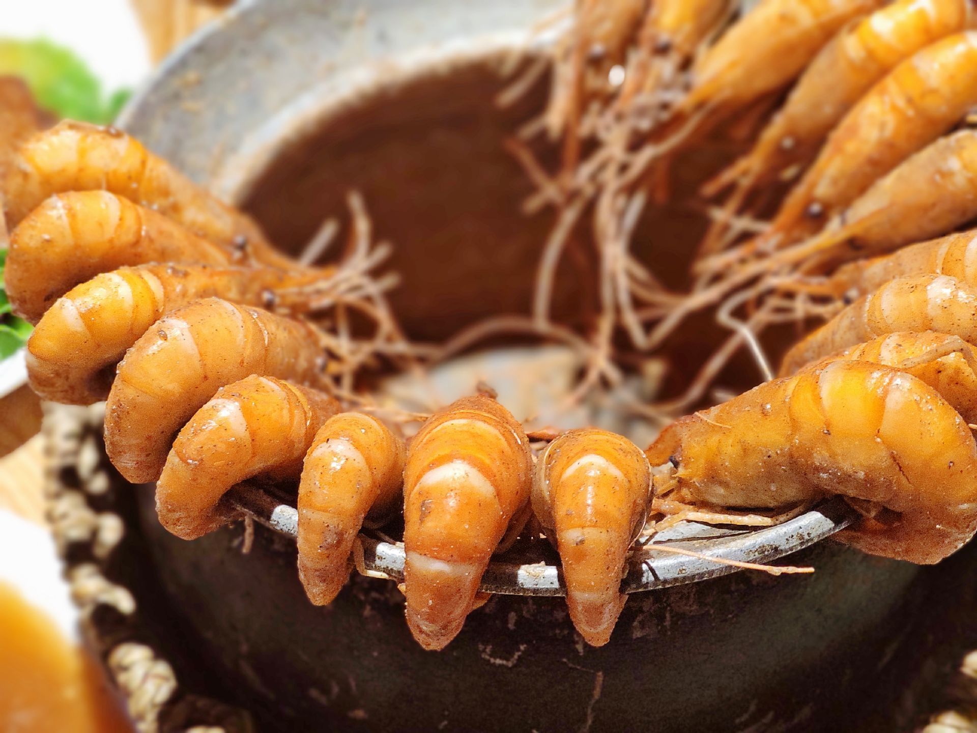 菜品造型就很特别,少见的狗母锅边缘18只万氏对虾,虾头朝里冲下,环形摆放,色泽焦亮,胡椒被高温...