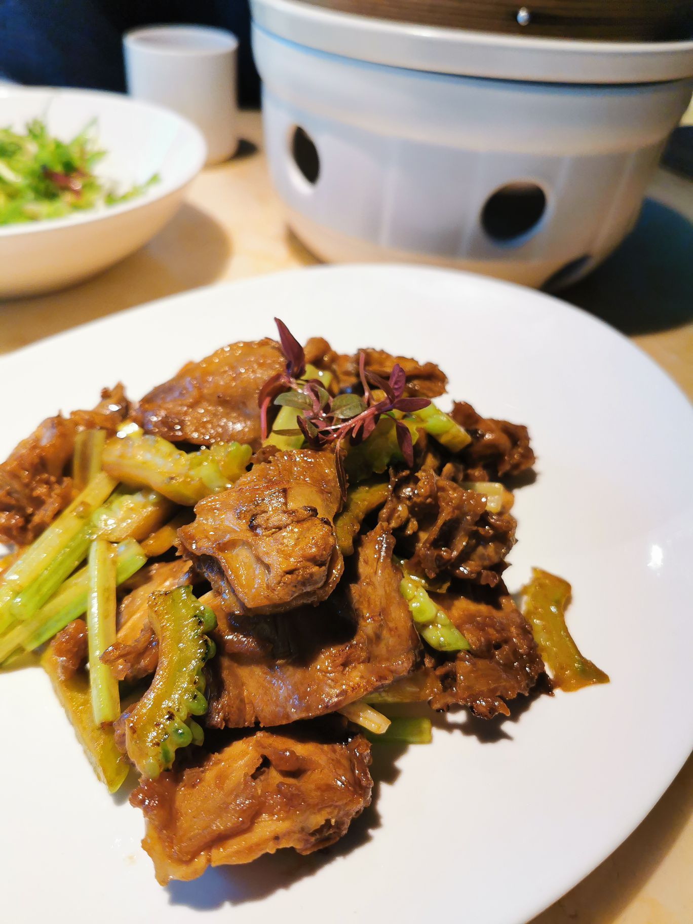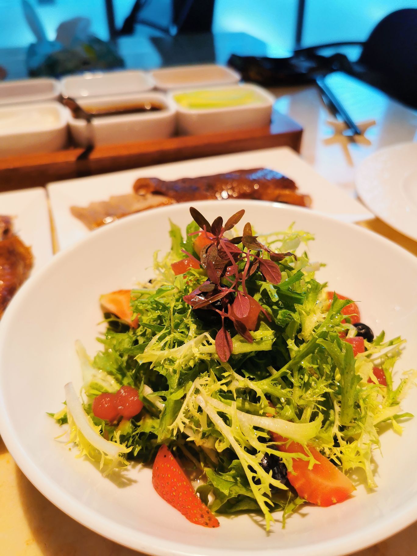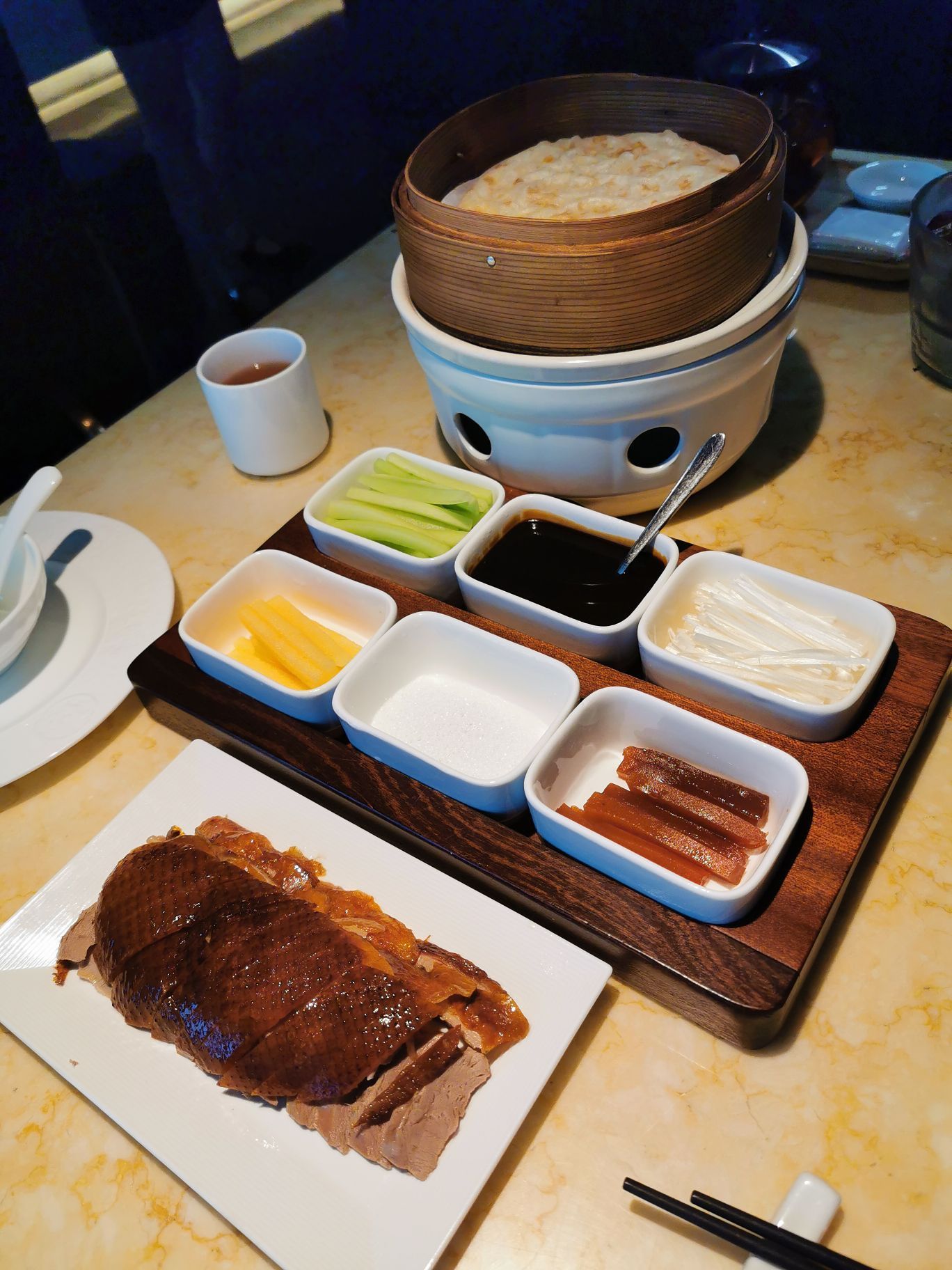第一次吃这么新鲜出炉的烤鸭,看着厨师推着车子到桌边现场片鸭肉,鸭皮烤得真的非常酥脆
