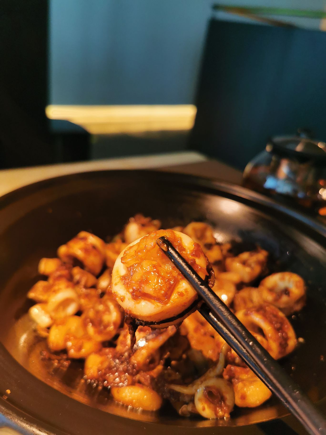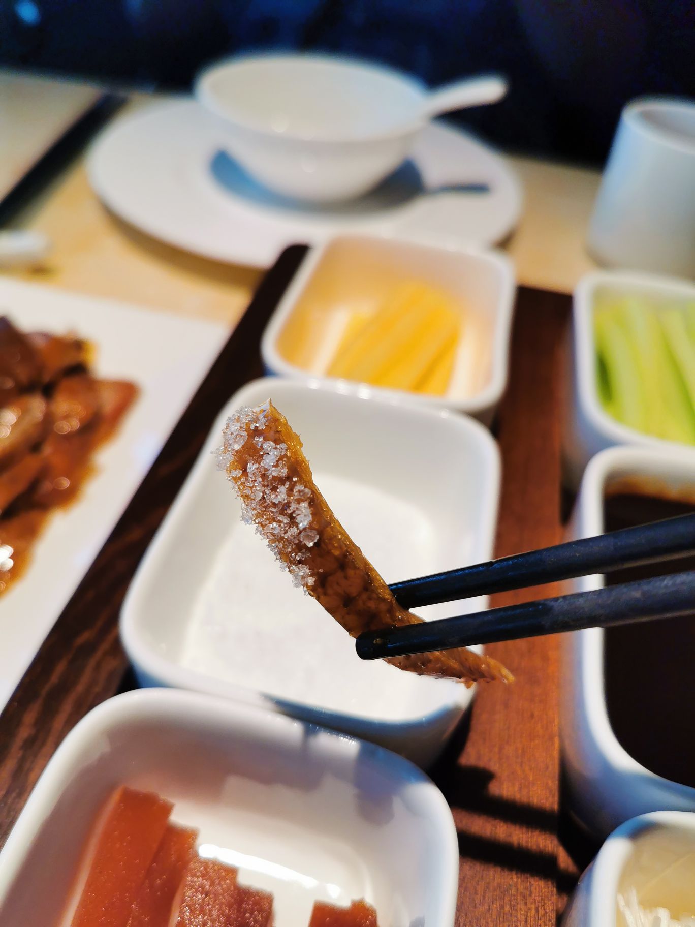 “有朋自远方来,不亦乐乎?” 朋友好不容易来一趟厦门玩,自然是要好吃好喝的款待,她订了会展附近的酒店,刚好,请她来非常高大上的JFC吃超级赞的烤鸭,提前约了时间,以及上菜的时间,忽然就觉得很有仪式感,连带朋友也觉得很期待。 提前了10分钟到店,落座后问我鸭子马上就要烤好了,可以按着约好的时间上吗?第一次吃这么新鲜出炉的烤鸭,看着厨师推着车子到桌边现场片鸭肉,鸭皮烤得真的非常酥脆!!沾白糖吃真的很香甜呀,抿一抿都化开了。鸭肉沾甜面酱,加京葱丝,青瓜条,用很薄但劲道的烙荷叶饼裹起来,老北京烤鸭,就是这个味! 另外点了金汤黑豆腐,焗东山小管,豆腐真的很好吃,超级嫩,有豆子的香气,装在沙煲里端上来还滋滋的沸腾,一直到最后都很保温,豆腐慢慢吸收金汤,越来越鲜甜。东山小管膏很足啊,吃起来粘糯丰腴,朋友惊叹从来没有吃到这样的小管,那是,毕竟也算是本地特色菜了,朋友喜欢就好,这一顿饭宾主尽欢,想必这一次的相聚,也将会成为朋友心心念念的美好回忆吧。