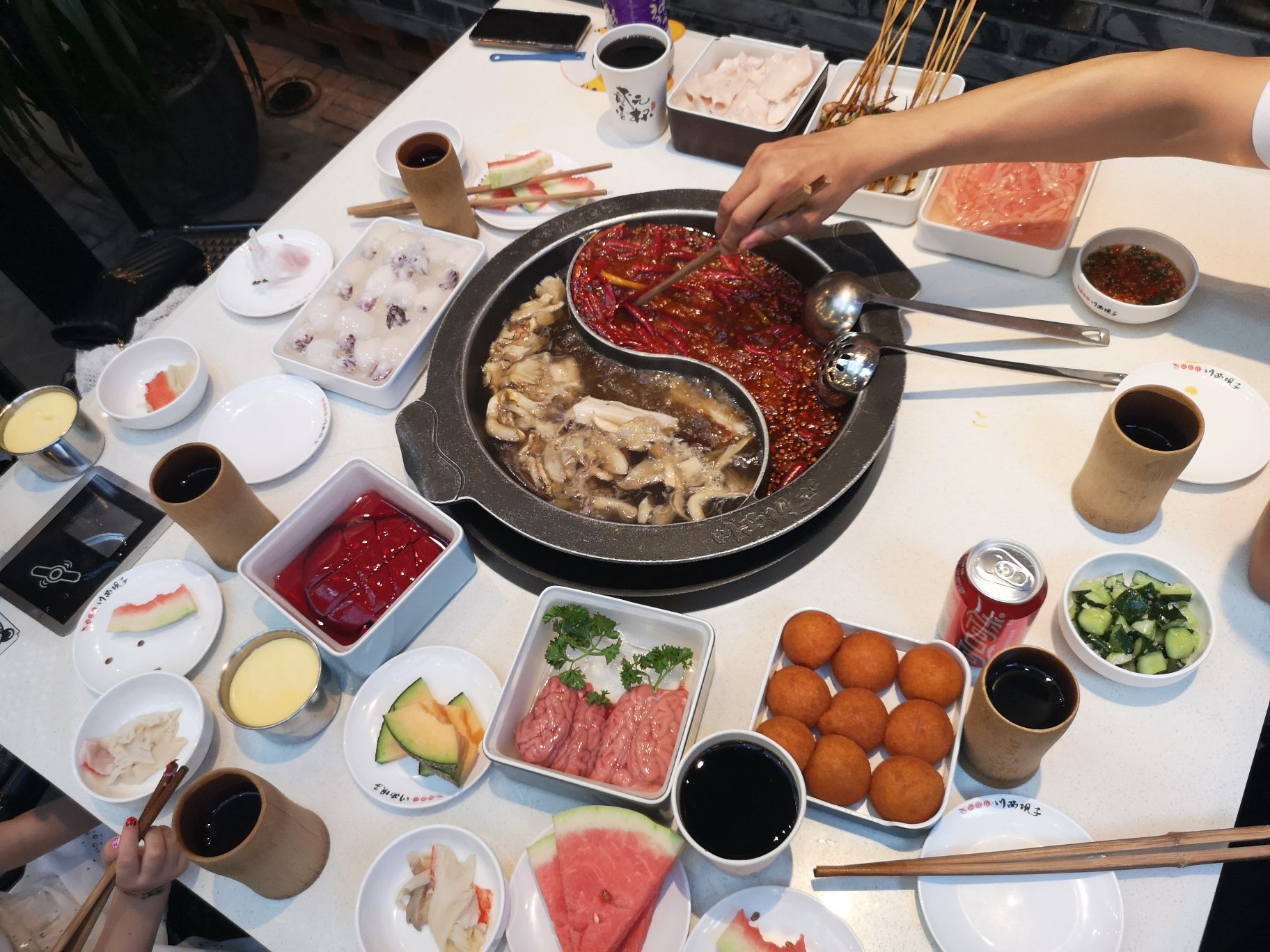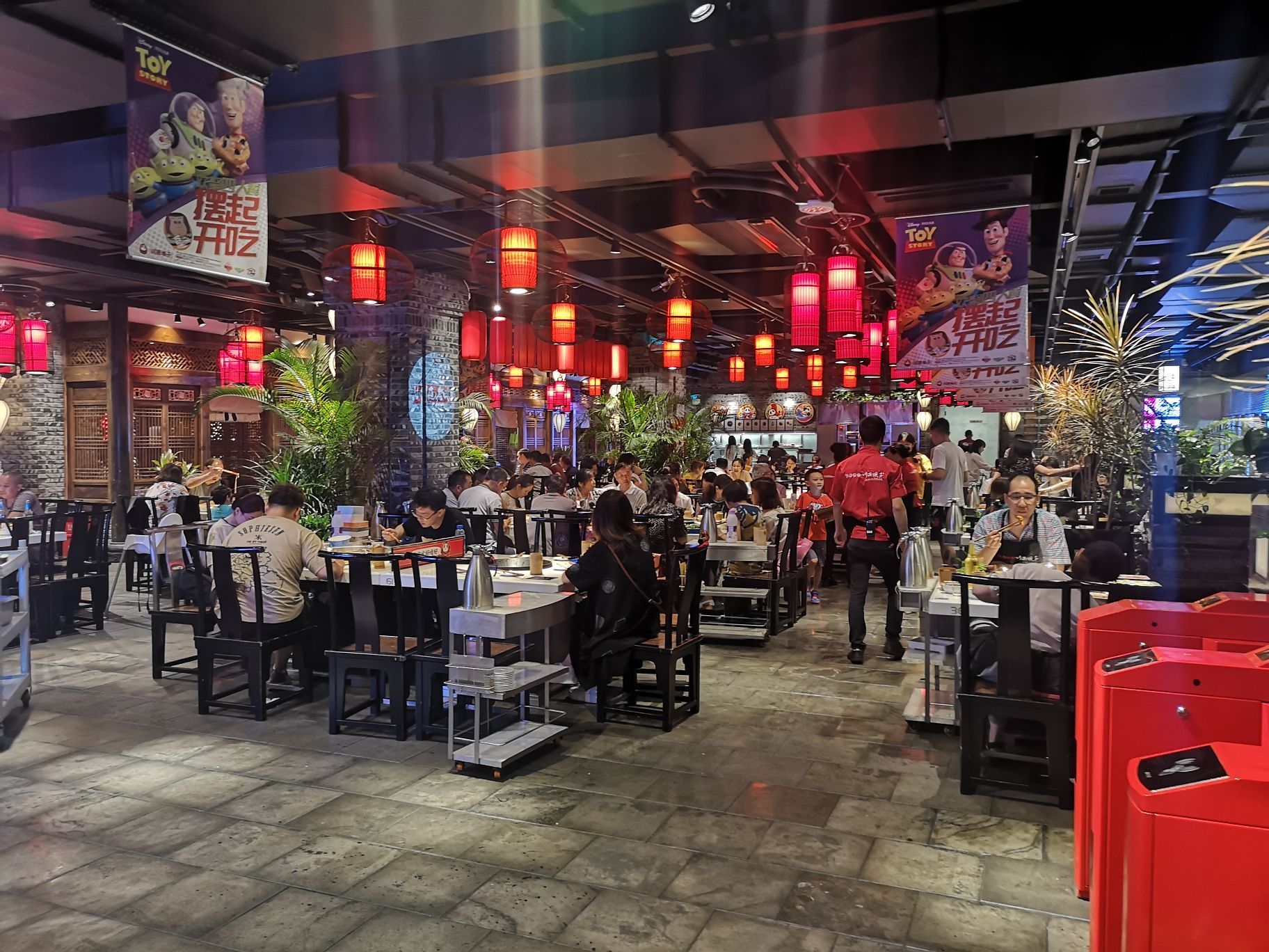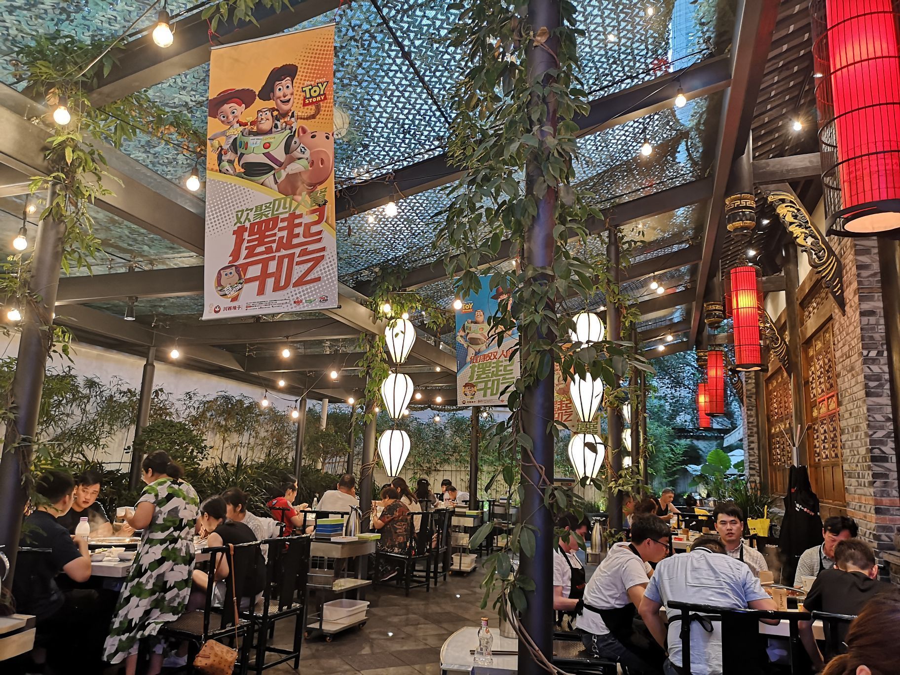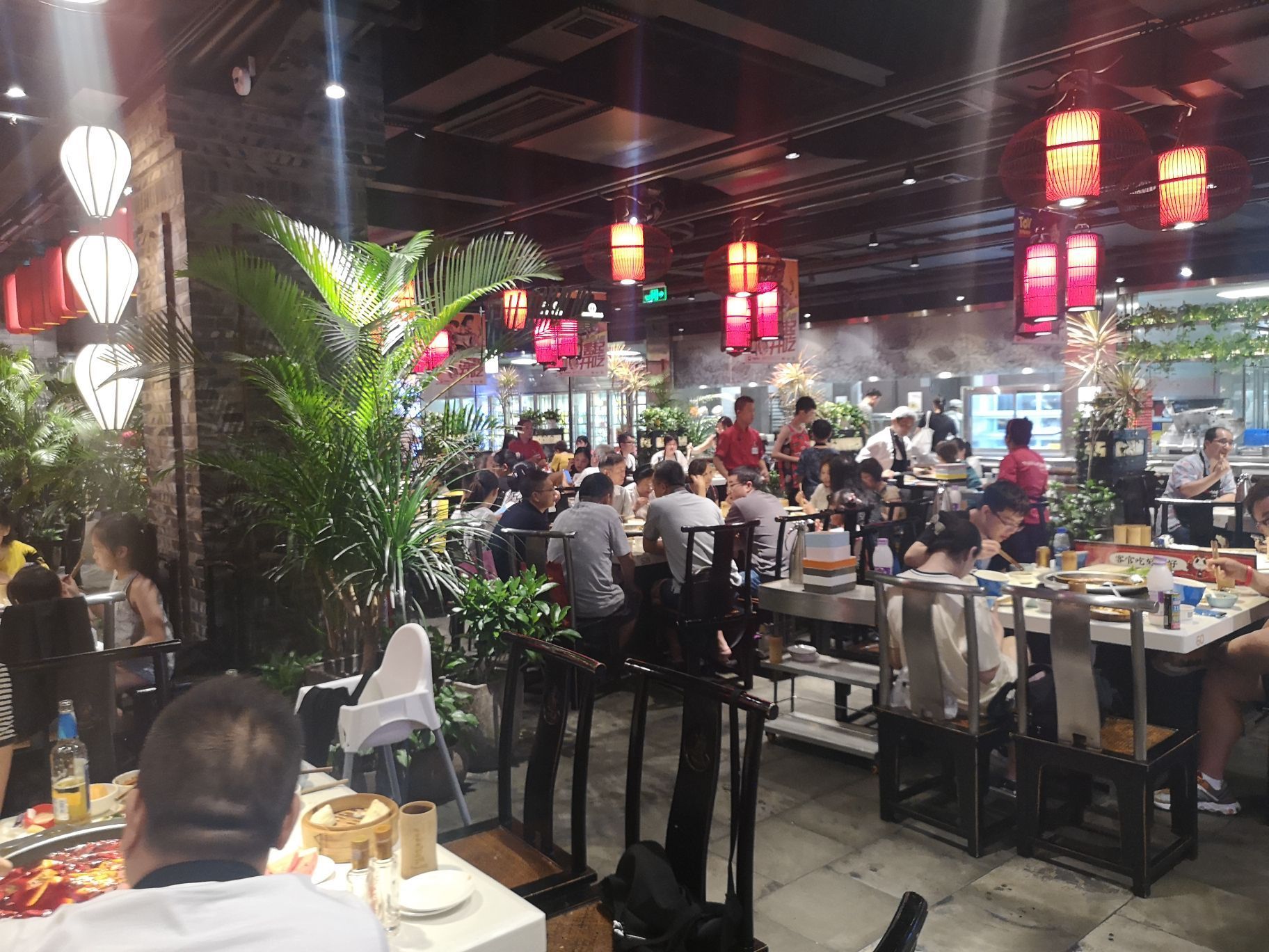 逛完杜甫草堂,不想多走路,就在门口附近选了这家,毕竟也是上了必吃榜的。饭点直接去的,没有预约,大堂没座位了,所幸里面院子里还有半露天的座位,有风扇所以也不热,通风还好点(大堂一股略微呛鼻的辣味,孩子也受不了)。点餐是凭手环,像乘地铁一样进虚拟闸机在指定区域自己选的,然后在“出口”结算,出去就不能再退了。比如我们点了菌菇鸳鸯锅,回到座位上才发现不该拿香菇,拿回去就被拒绝了,浪费了一盘。服务比较到位,可惜底料没有之前吃的某家感觉好,辣锅涮久了有一点点苦味。
