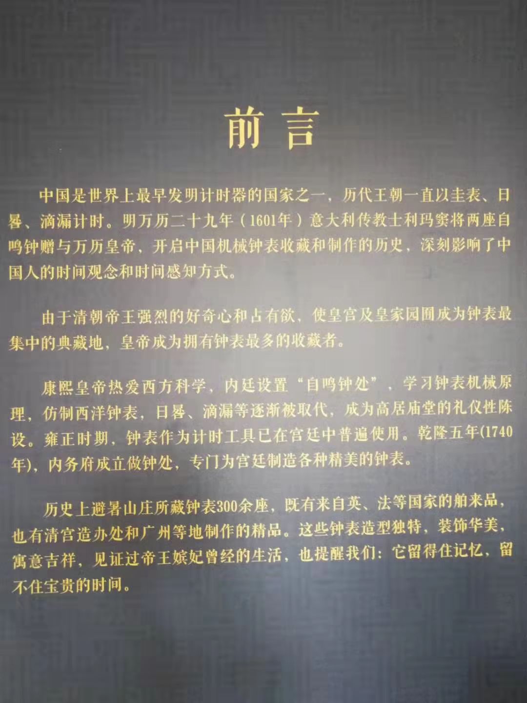 网友2019-08-13在避暑山庄博物馆里面有个钟表馆是有必要细细的看一下的。但是传教士带来的钟表很得皇帝们的喜欢在避暑山庄博物馆里面有个钟表馆是有必要细细的看一下的。虽然在明清两代钟表被定为奇技淫巧。但是传教士带来的钟表很得皇帝们的喜欢。于是在紫禁城和这里放了很多钟表。很多都是孤品值得一看。
