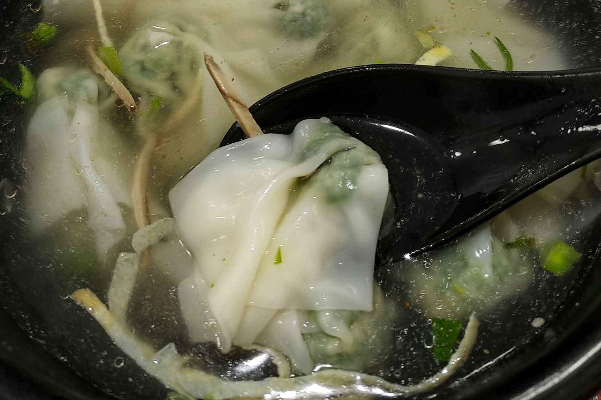 凤爪诚然只有一个,很仔细切成了三小块,倒是方便食用,可以用筷子直接取用就好,不必上手,维持淑女风范。 馄饨是清汤的,看起来有一种清爽感,还有切成丝状的蛋皮,这一碗馄饨也算是比较讲究的了,味道挺不错。吃完也不会口干。