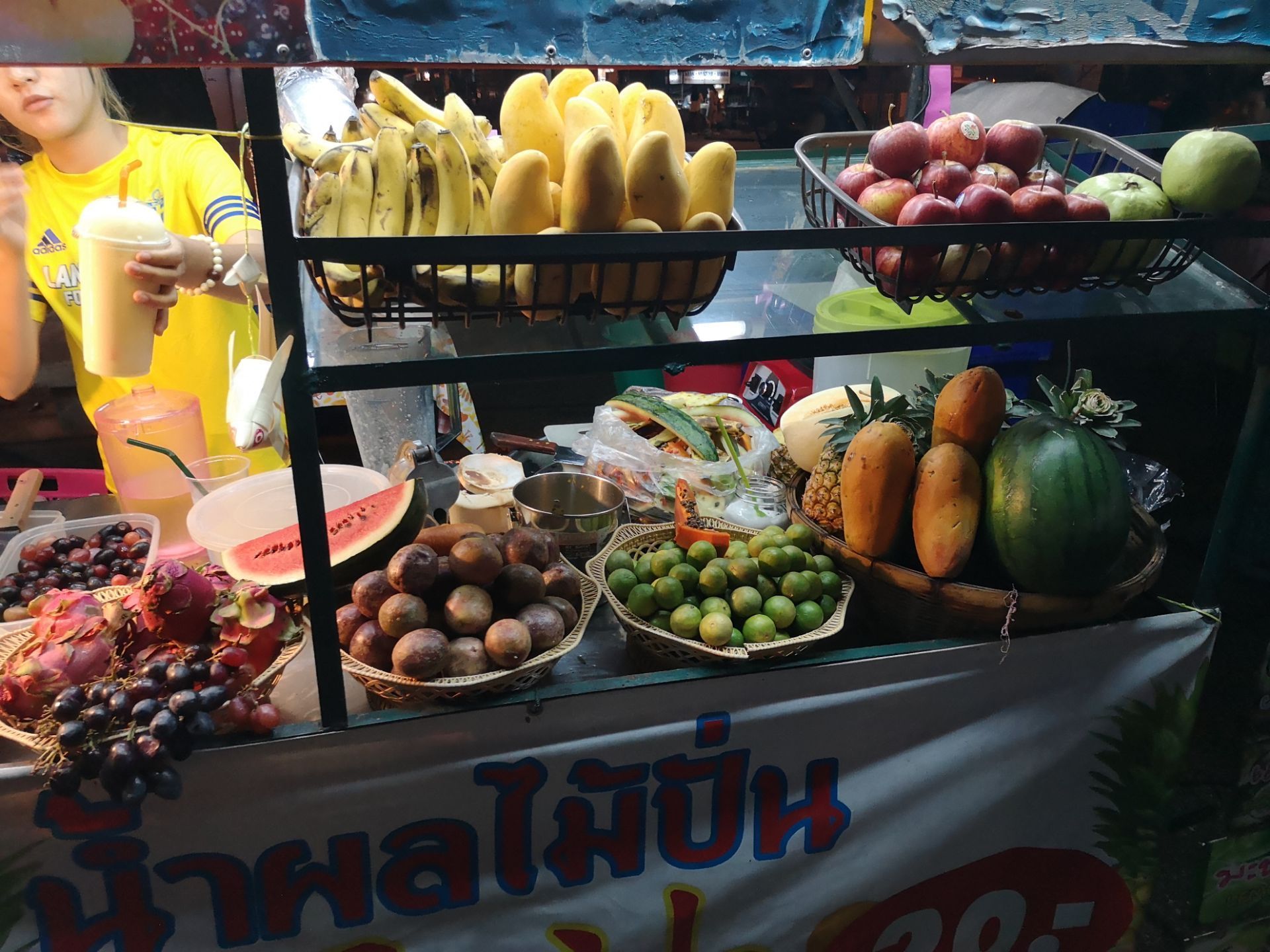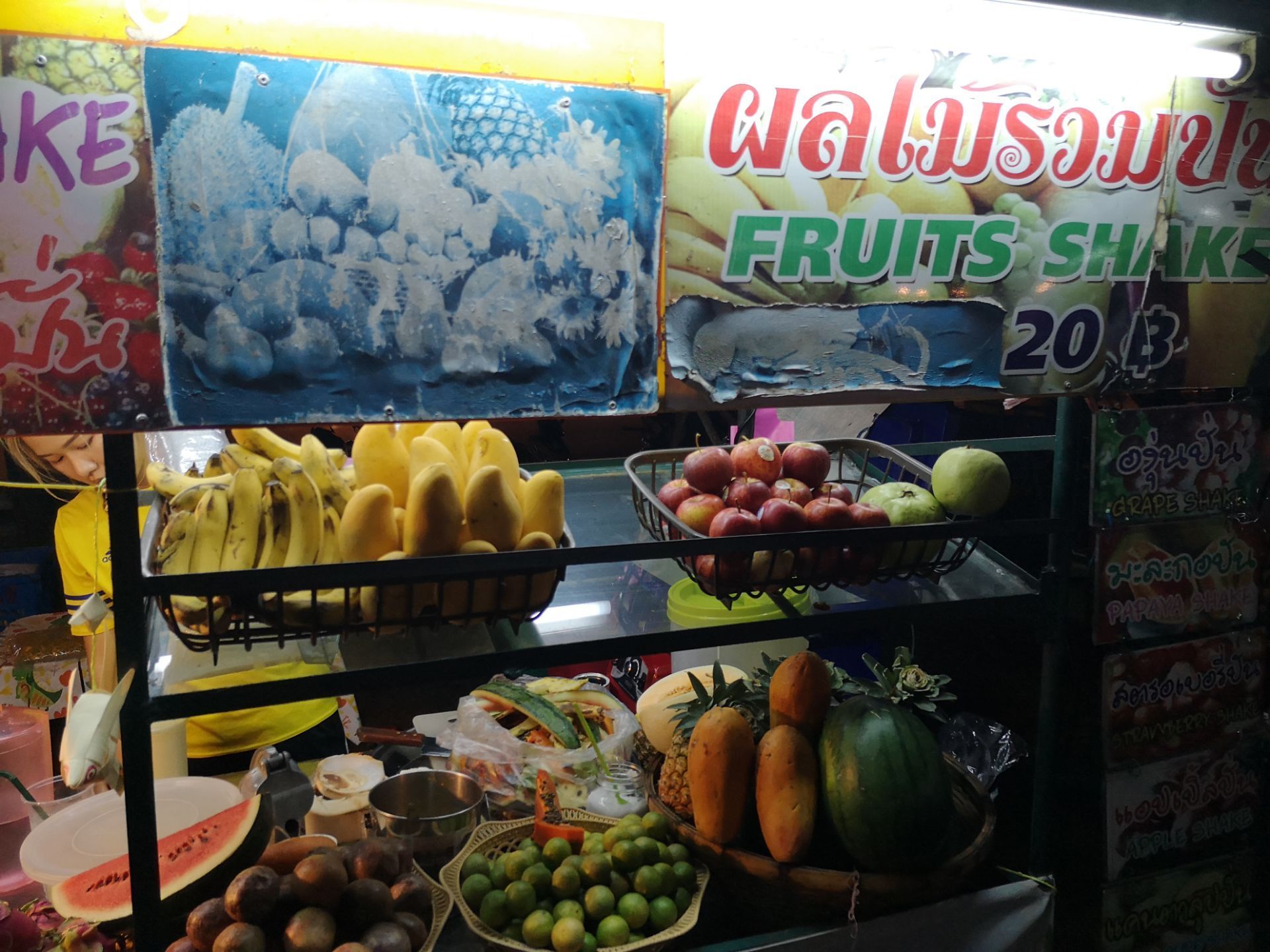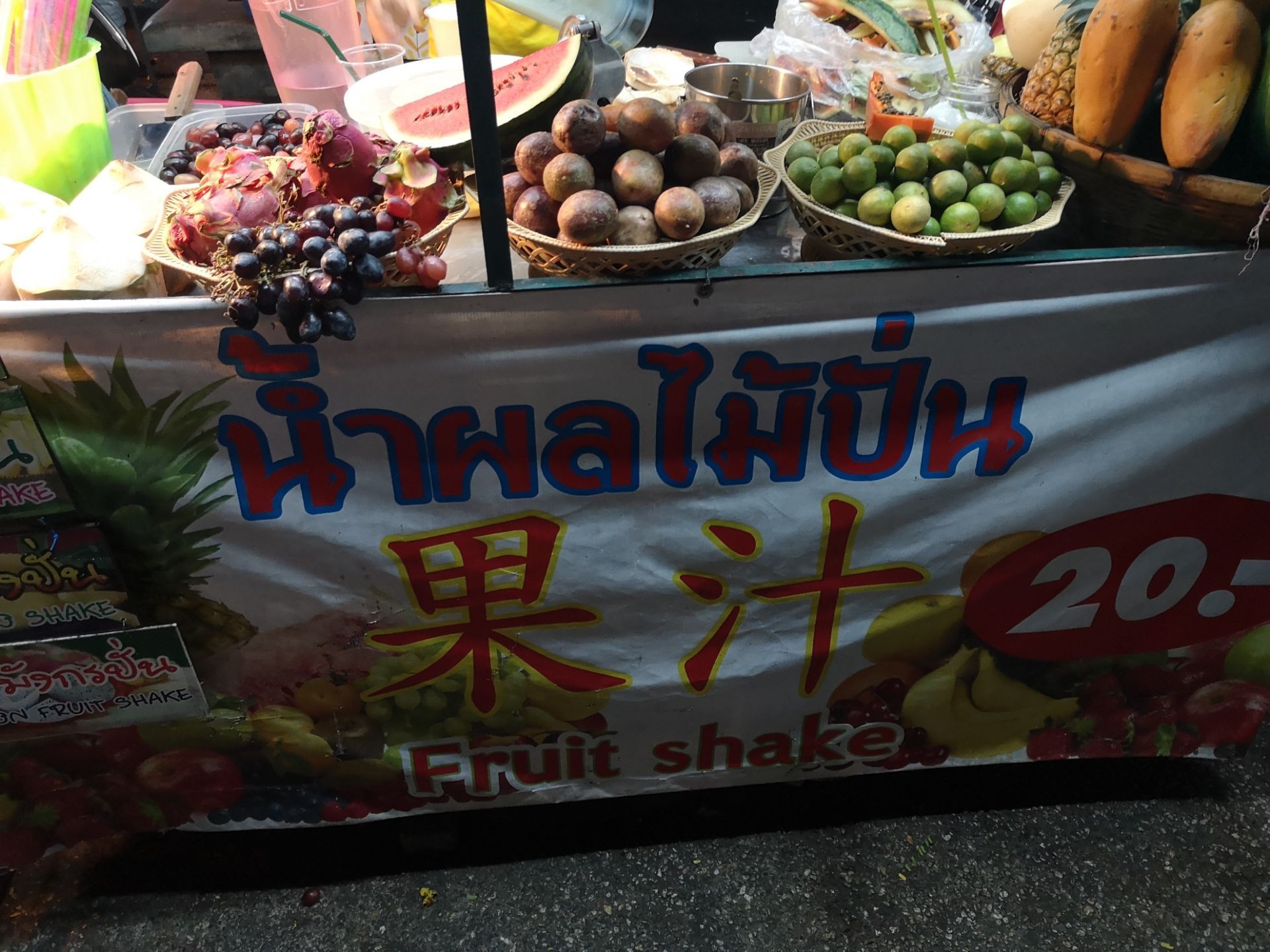 清迈这边一到晚上就特别的热闹,在这里能够找到很多夜市,里面都有的食品元素,所以如果错过几个夜市的话过来这边吃东西就好了,每一天晚上过来的话,都会叫上一杯水果shake,无论选择哪一种水果都是统一的价格,20泰铢,很划算啊。