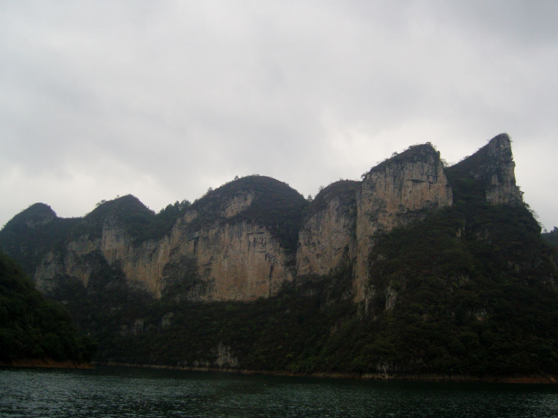 都说舞阳河把最精华的一段留给了镇远,但实际上从镇远古镇到游下舞阳的乘船点,还需要坐至少半个小时的车子。 我们在古镇上的旅行社里购买了到舞阳河游览的行程,费用包括往返中巴车费用、门票和游船三部分。 我们坐船游览的舞阳河,是舞阳河的三峡景区,看的无外乎就是青山绿水,奇峡险峰。 两边崖壁上自然也有很多景观被形象化了,而最主要的景观就在游程的最后,一处被称为孔雀开屏的石峰。 游船会从孔雀开屏的侧面开到正面,从侧面看,你可以把她想象成一只傲娇的孔雀,或者其他;而当船开到正面,就真的非常像一一个正在开屏的孔雀了。