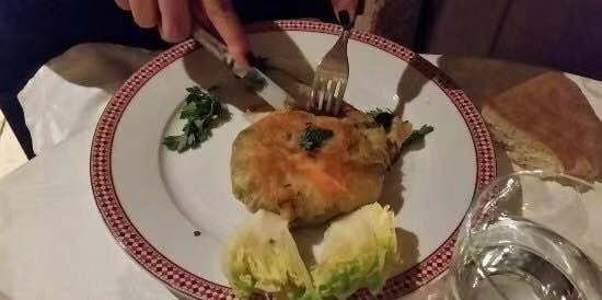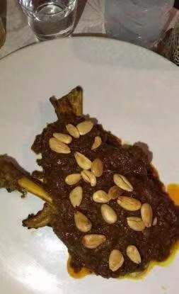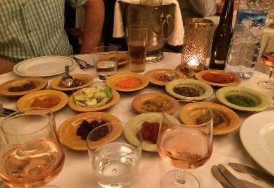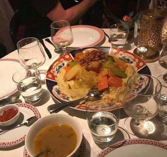 这家真的比较做法比较传统. 菜单看起来简直要人命 阿拉伯语 法语 关键 英语真的十分的花式 看着很费眼力. 我们提早半个小时到的 不能进去坐着等 一定要到了12:30才能进去坐着. 点了传统汤;牛肉蔬菜塔吉;色拉(菜单上就一种传统色拉). 这里的沙拉就是很多小碟菜 . 牛肉塔吉挺好吃的.配的蒸小米.服务态度一般.