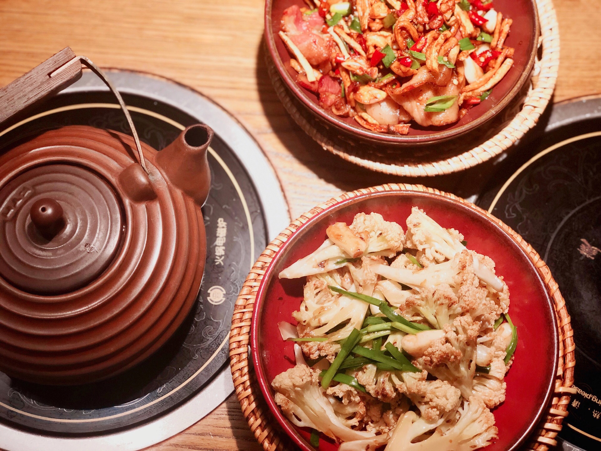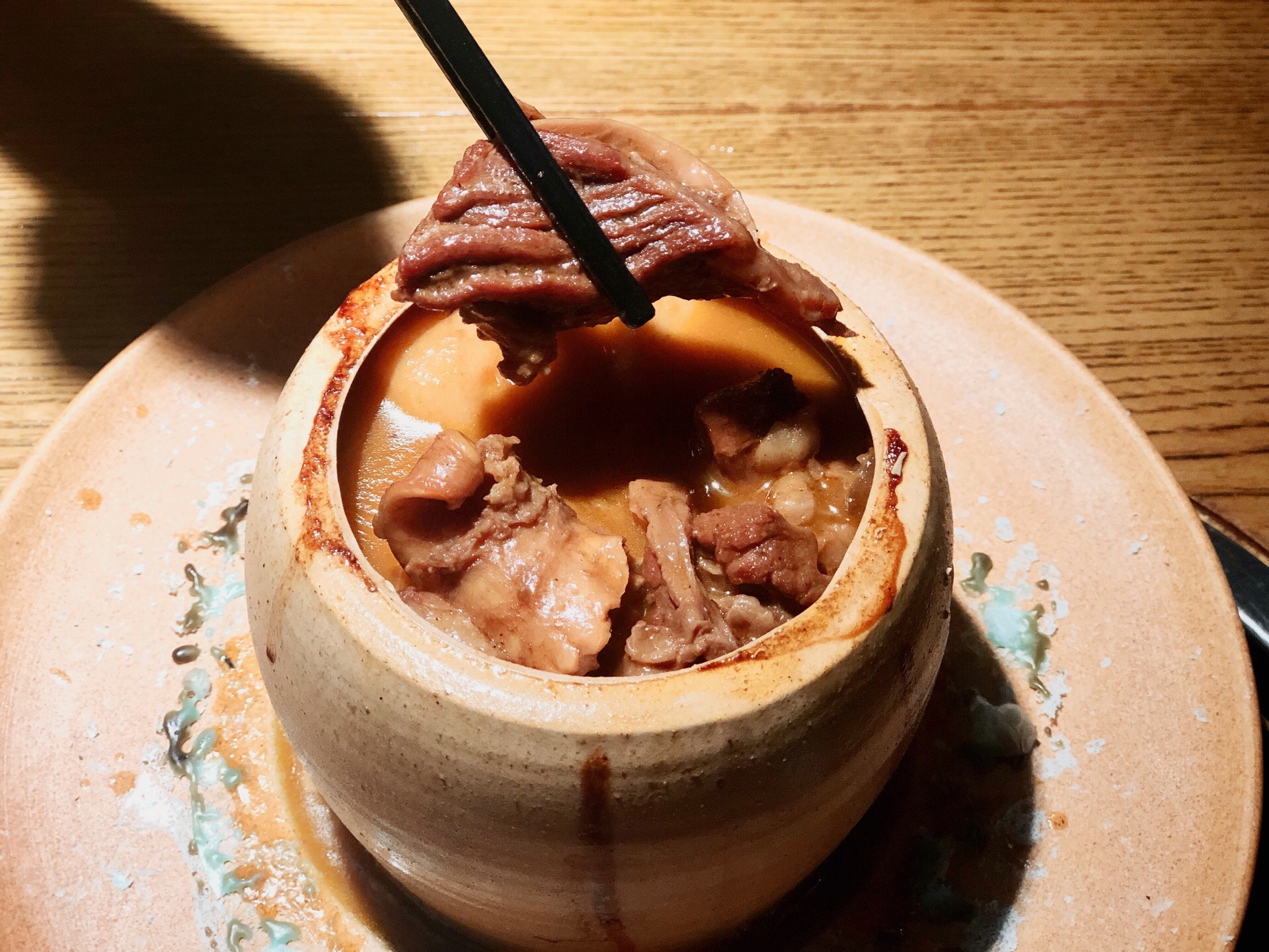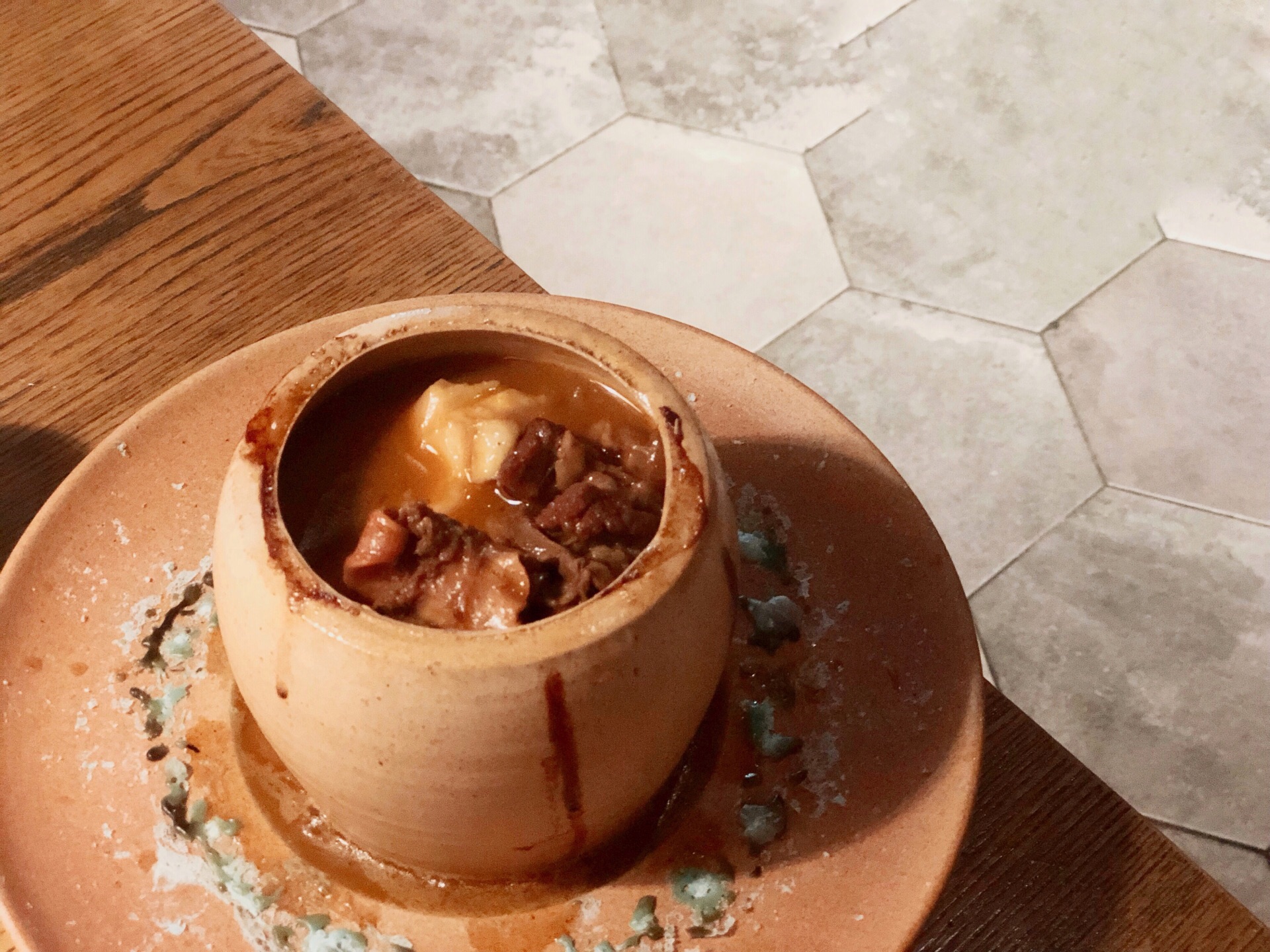 「罐罐牛腩」看到店门口的海报感觉很不错的样子,果断点了。开罐方式很特别,体验到了湘西文化~罐罐里的牛腩炖的很烂,萝卜很入味!服务员介绍说罐子都是一次性的,敲开后就不能给下一个人用啦,感觉有点可惜…… 「土萝卜干炒土腊肉」萝卜干很硬咬不动,土腊肉很好吃,肥瘦相间,却一点也不腻! 「土司酒大碗花菜」很好吃!一点点辣,没有酒味,放了孜然提香,很下饭! [环境]装修很有特色,进门后一秒穿越到湘西。 [服务]上菜速度快,穿着民族特色服装的服务员上罐罐前居然还有吆喝,很新奇。