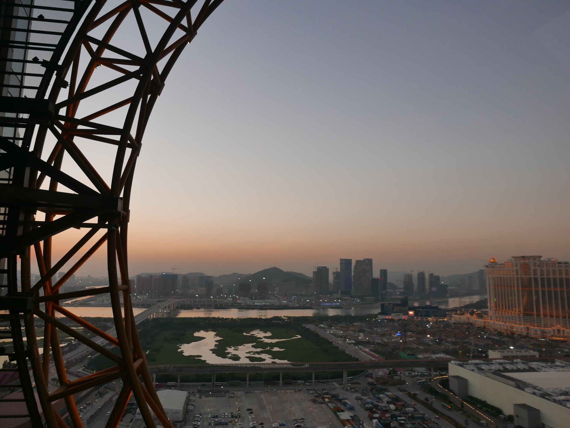 如果来到澳门想登高看落日,感受浪漫的氛围,新濠影汇之星的8字摩天轮是个不错的景点,一般的摩天轮是原形的,而这座摩天轮有两圈组成8字,在130米高处,远远就看到了。全程十八分钟,随着摩天轮的起降,可以换一个角度欣赏澳门。