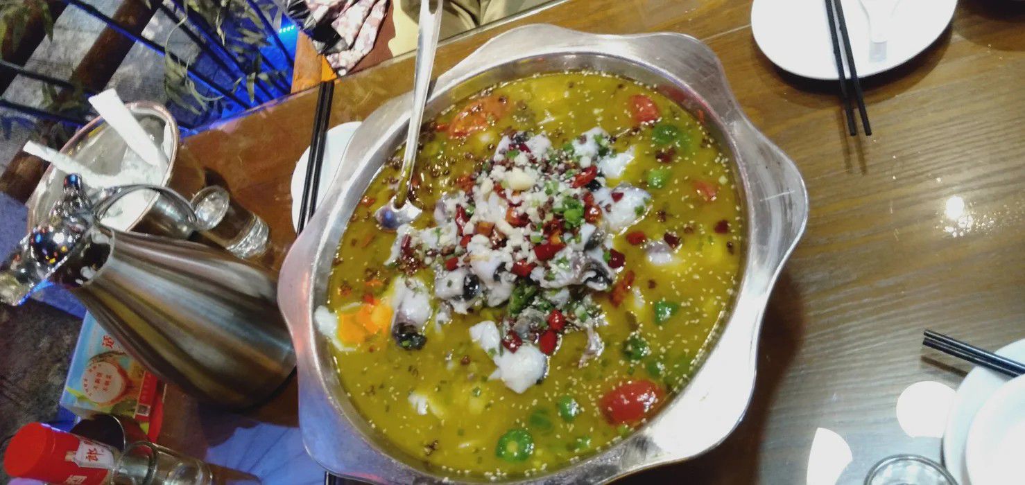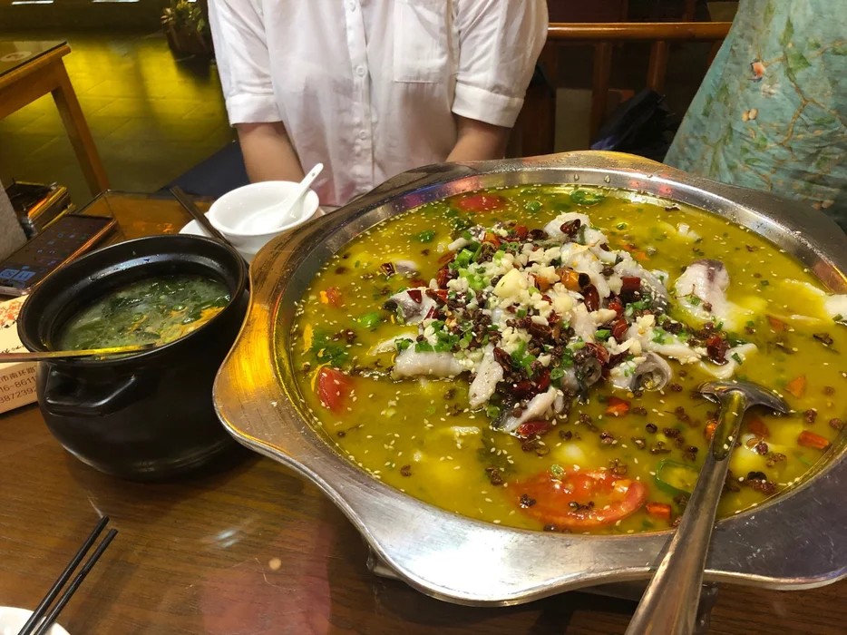 "酸菜鱼"用鲜鱼加泡青菜制汤,因泡青菜味酸,故名。说起它的来历,传说颇多。 一个传说始创于重庆市江津县津福乡的周渝食店,80年代中期经营酸菜鱼,颇受食者赞许,此店陆续收了不少徒弟,艺成之后,离店自立门户,该店的拳头品种也随之流传四面八方。又有传说重庆市壁山县来福镇,此镇位于成渝公路侧,壁南河穿街而过,鲜鱼产量多,烹鱼高手辈出,有"来福小镇鲜鱼美"之誉,桥头一小食店,干脆以"鲜鱼美"为店名,由全国著名书法家杨宣庭写的"鲜鱼美"三字,吊挂店前,既作市招,又是店名,它在推出"水煮鱼"风靡数年之后,又推出"酸菜鱼"。风味独特,名声不胫而走,全省各地纷纷仿制。