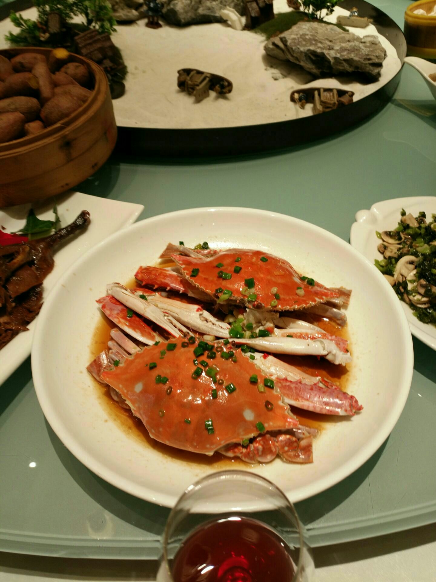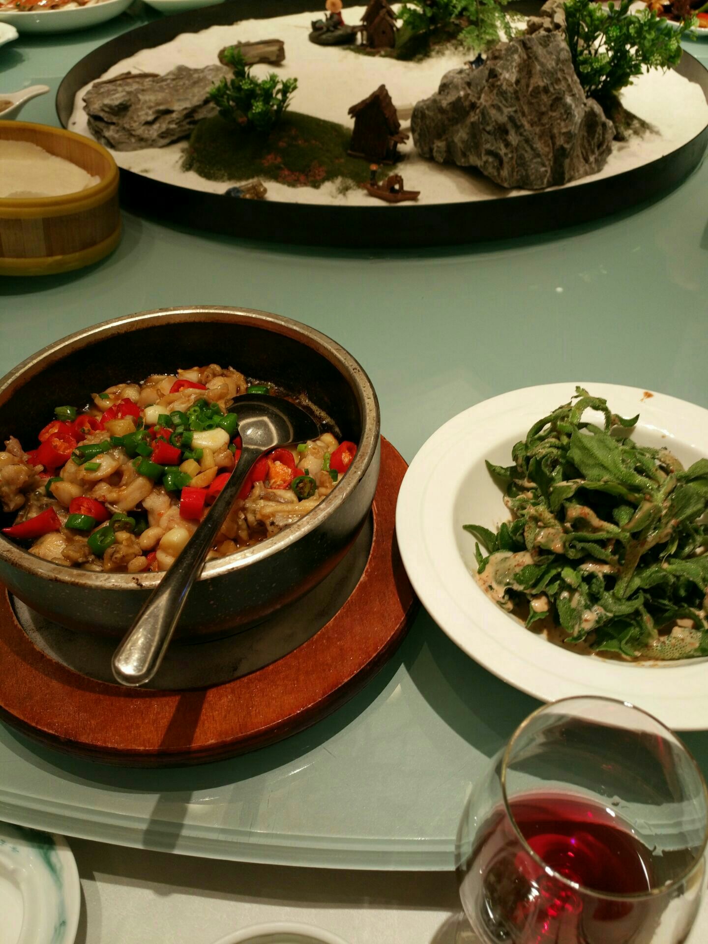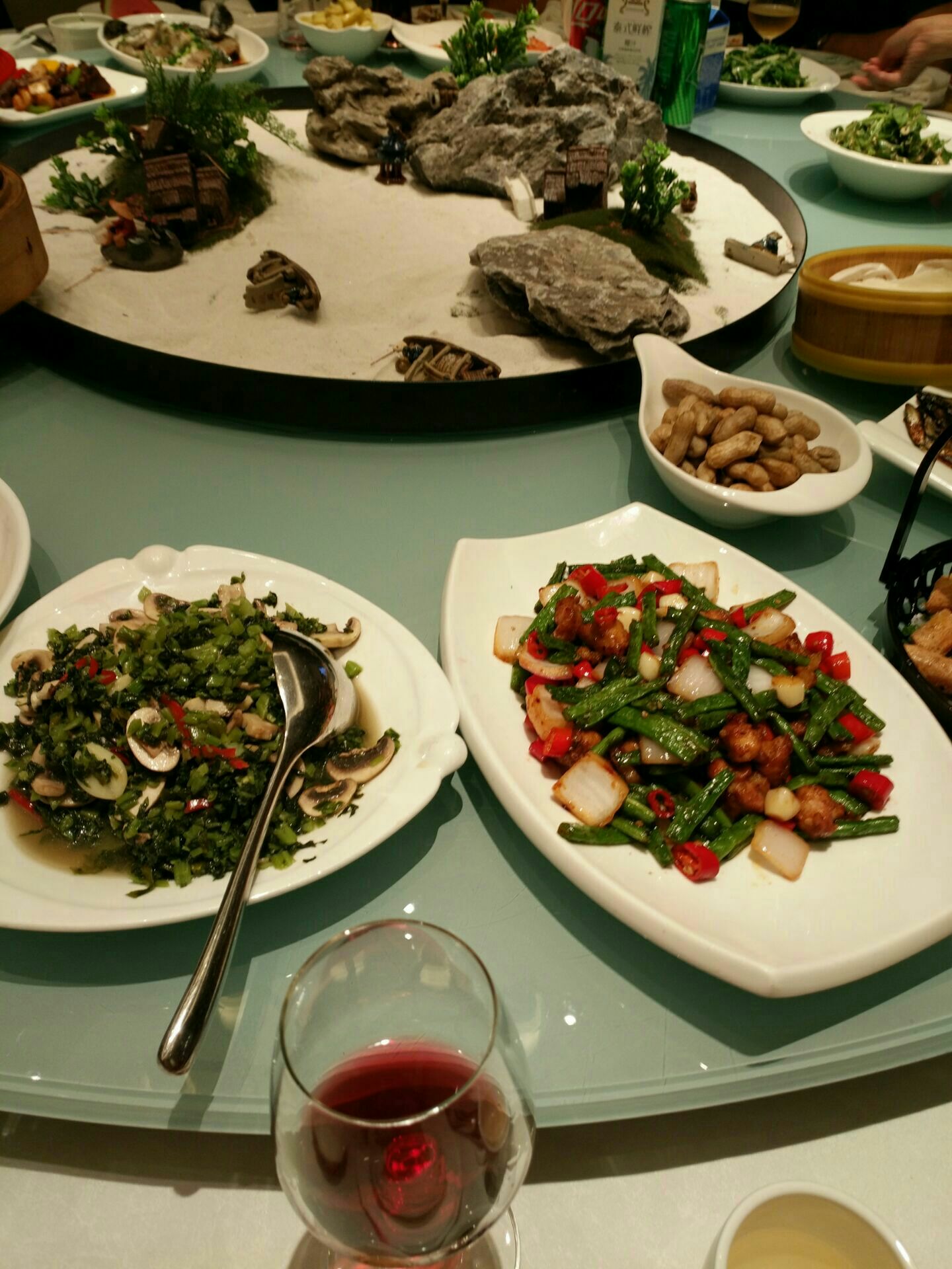 天港禧悦大酒店的宴会厅,我们订了一个包厢,酒店环境还是不错的。晚上去的晚了,服务员一直在等我们,那我们去的时候当然脸色会有点不太好了。菜品味道都挺好的,其中一道开胃菜,味道非常好,我们还特地研究了一下,感觉是某种菜心,很好吃,很脆,很爽口。餐桌中心是一个装饰品,很好看。