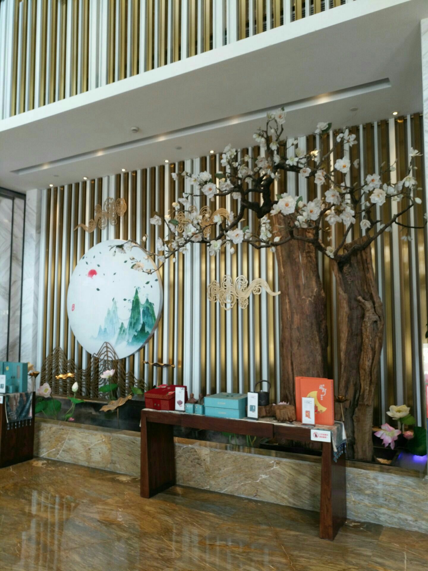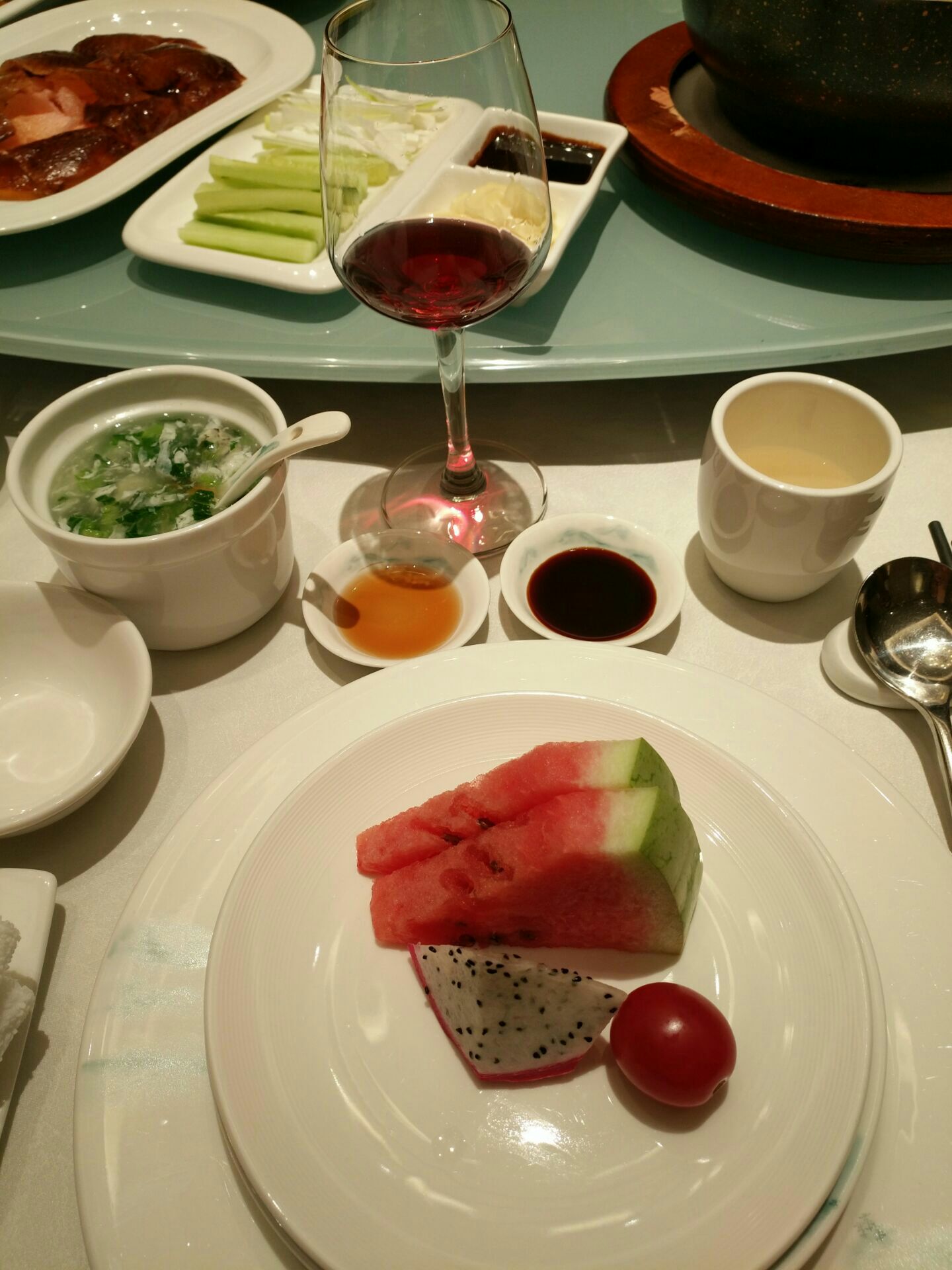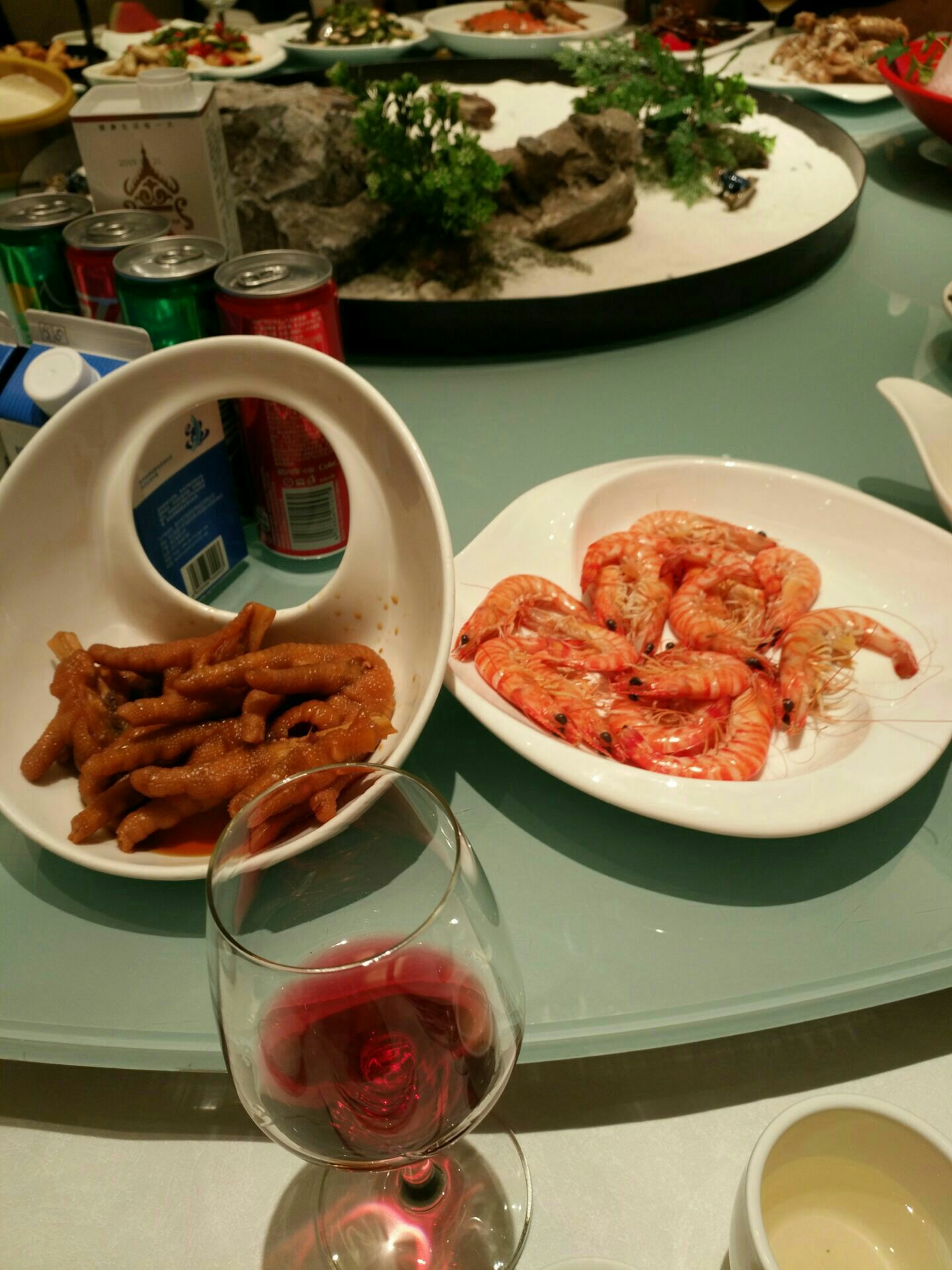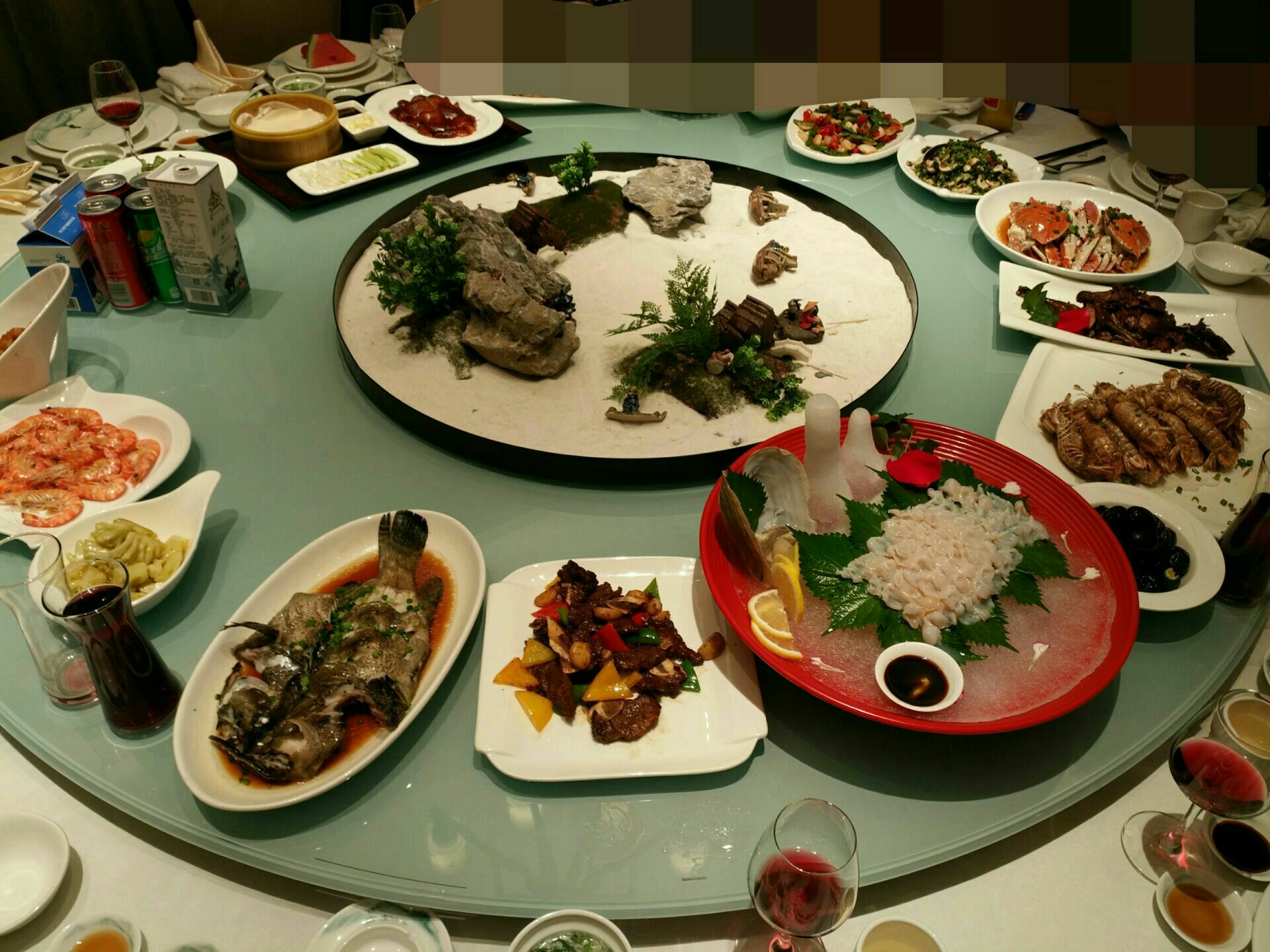 天港禧悦大酒店的宴会厅,我们订了一个包厢,酒店环境还是不错的。晚上去的晚了,服务员一直在等我们,那我们去的时候当然脸色会有点不太好了。菜品味道都挺好的,其中一道开胃菜,味道非常好,我们还特地研究了一下,感觉是某种菜心,很好吃,很脆,很爽口。餐桌中心是一个装饰品,很好看。