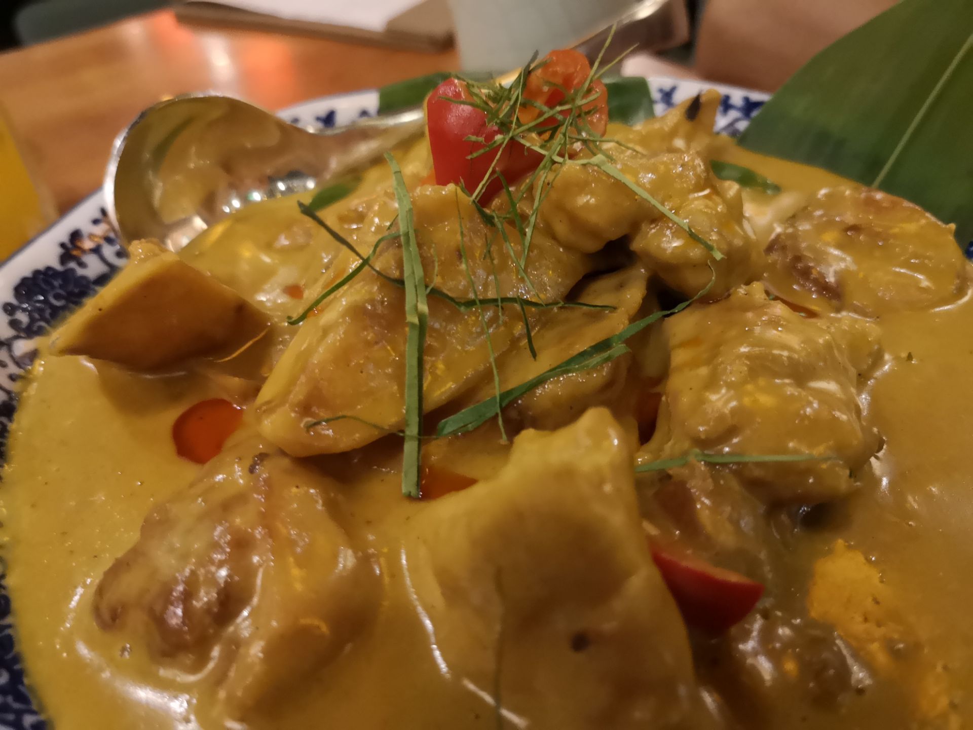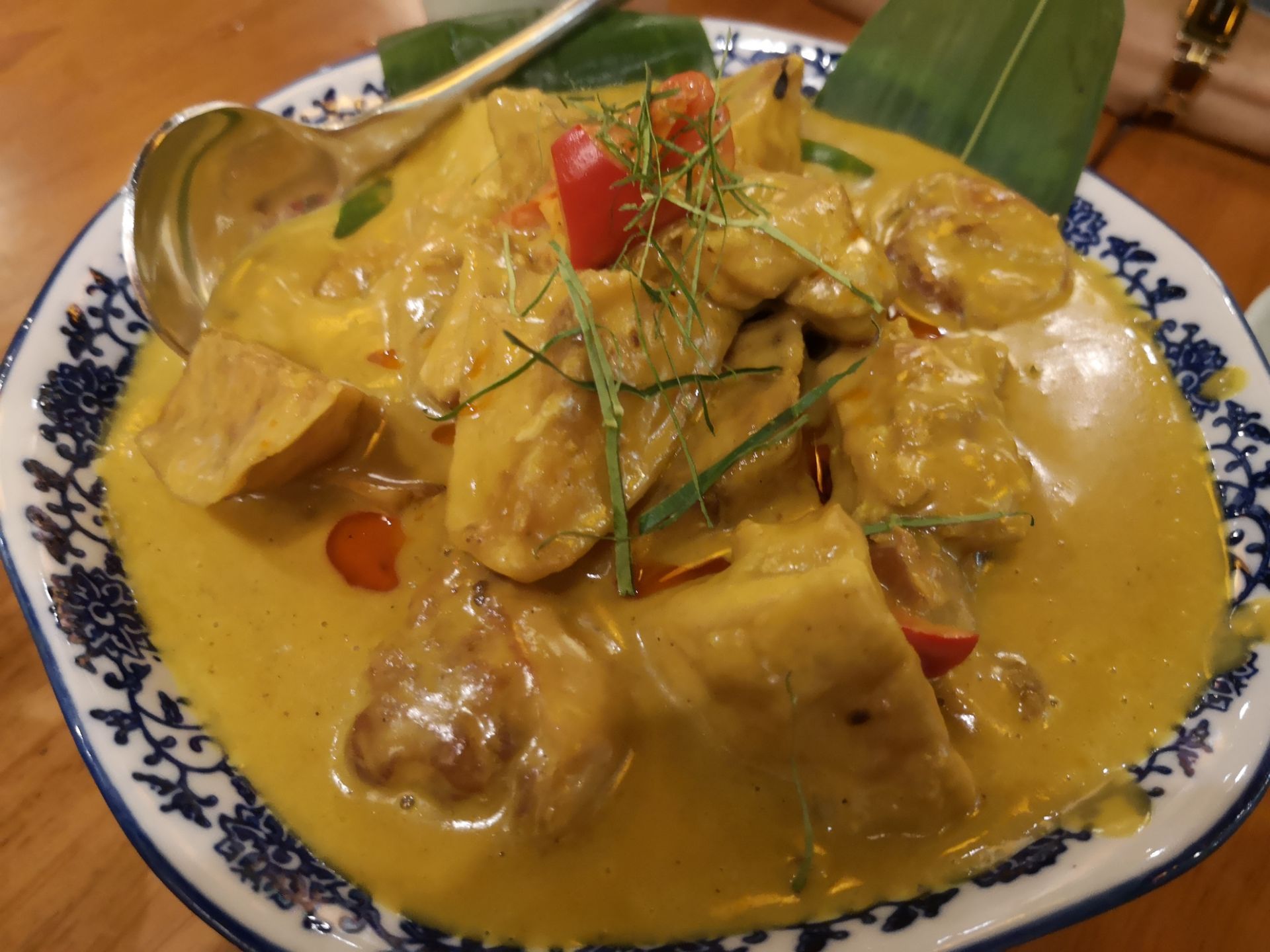 最近都在天河北这边上班,虽然公司有食堂,不过还是要调节一下口味的,所以有时候也会出来中午吃顿饭,中信广场,虽然不算是特别大的购物中心,不过里面吃饭的地方还蛮多,二楼这家东南亚菜馆就经常来,位置方便。 (越式咖喱鸡) 分量还是蛮不错的,里面的配菜还跟鸡肉的比例大概是1比1左右,很适合点多一份饭拌着吃,白米饭是三块钱一个,比较适中的价格。 (飞天通菜) 分量可以说是相当多了,比起在泰国本地吃的通菜这边的明显叶子多很多。 (百香果汁) 现在的天气那么热,肯定要冷饮的,百香果很解渴消暑。 (环境) 这边的东南亚菜比较靠近越南的风味,连这里的灯笼也是越南风的,虽然不是特别大,但是比较温馨一点,那也是挺用心去经营的。 (性价比) 套餐100多块钱,其实三四个人吃都没有什么太大问题了,两个人吃的话就有点多了。