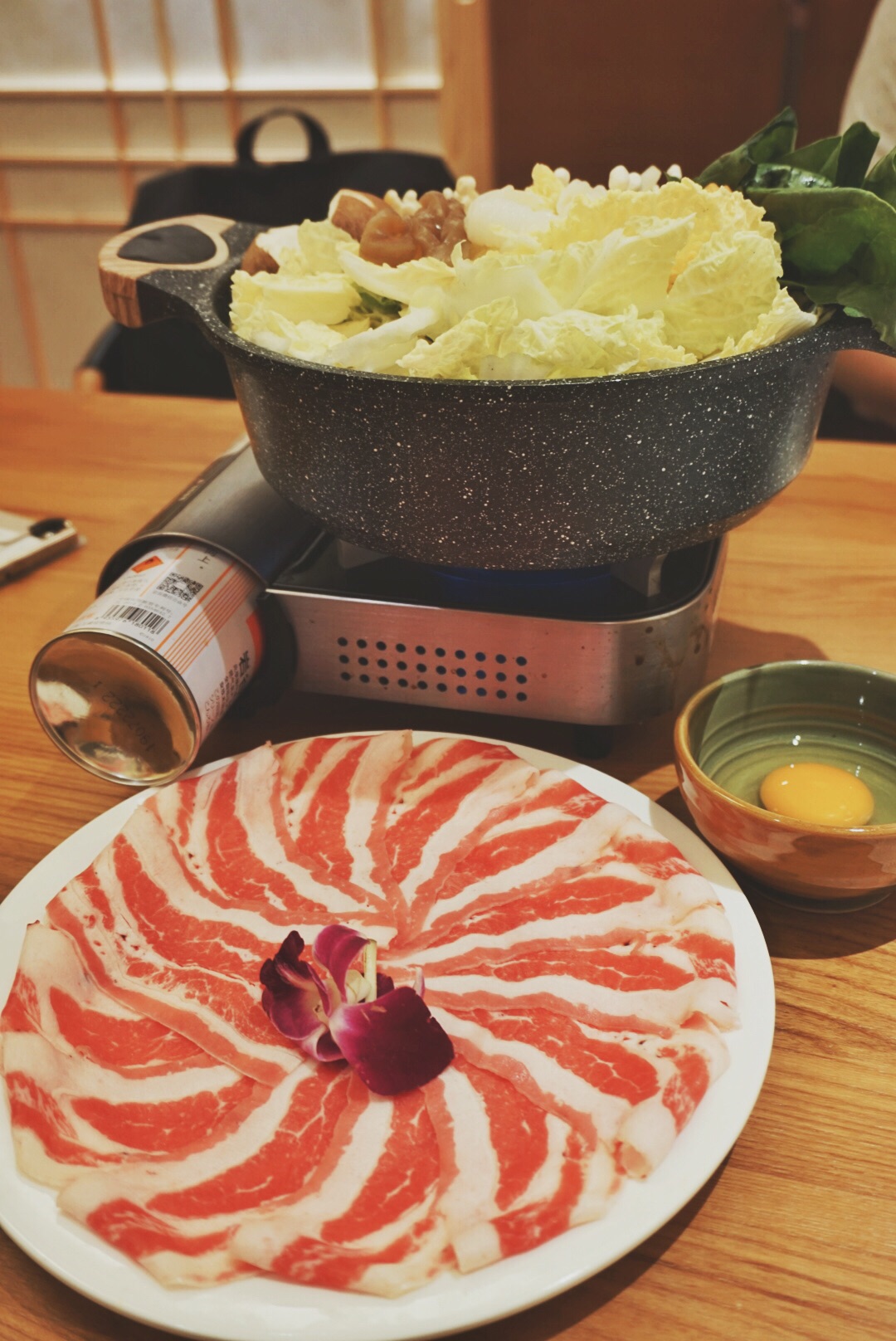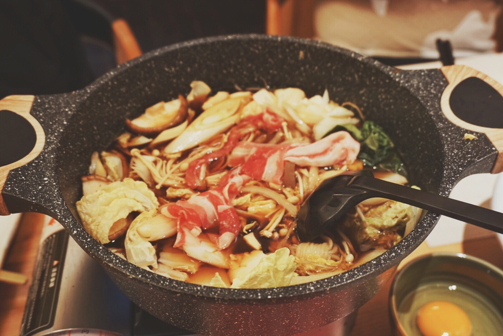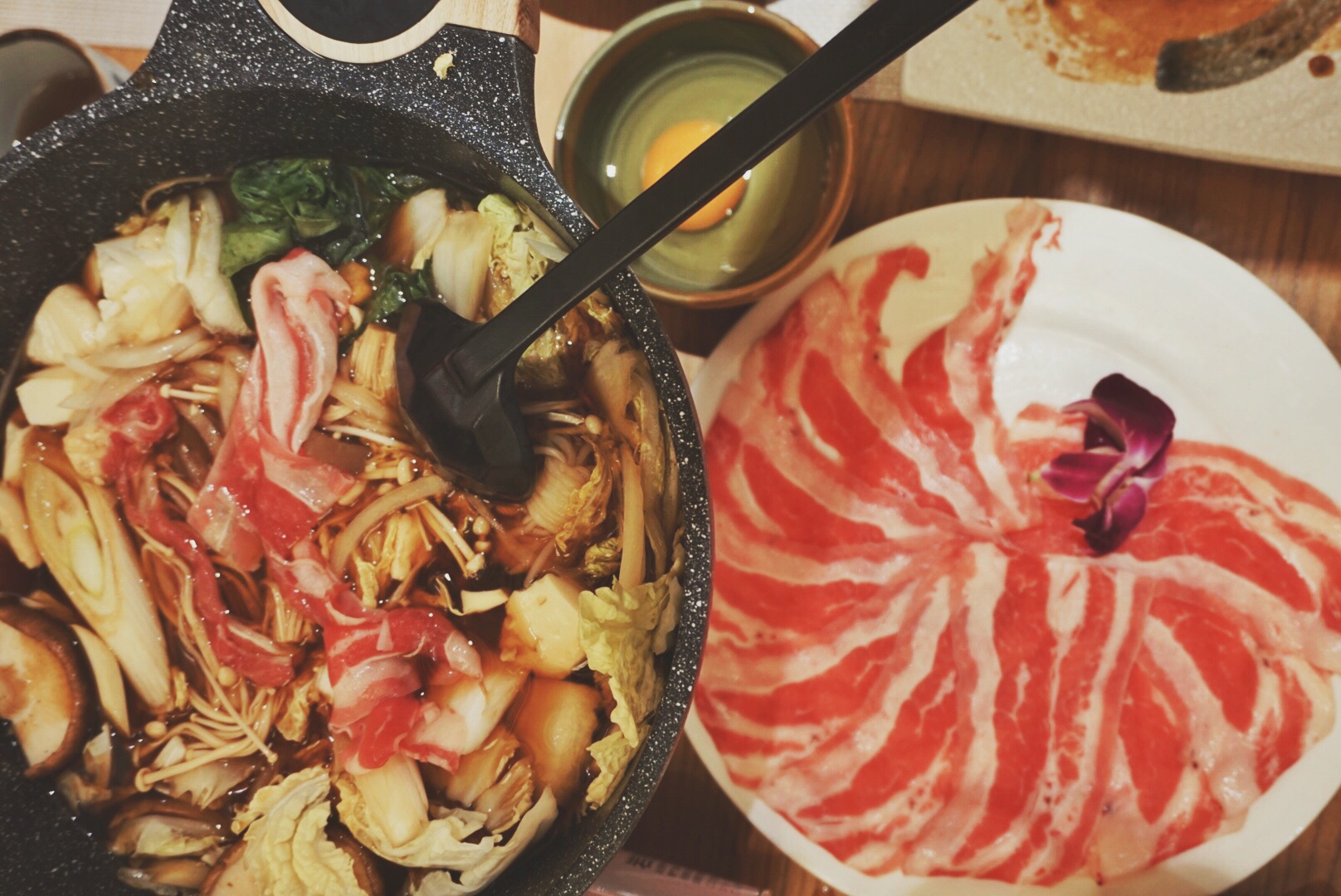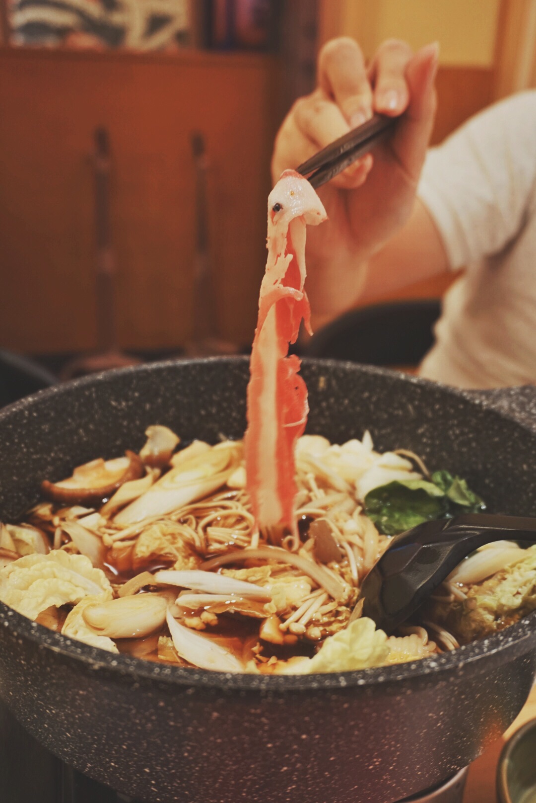 寿喜锅也是我的最爱之一, 这家蔬菜是先下好的,牛肉量也挺多的, 可惜没有魔芋丝,放的是魔芋,...