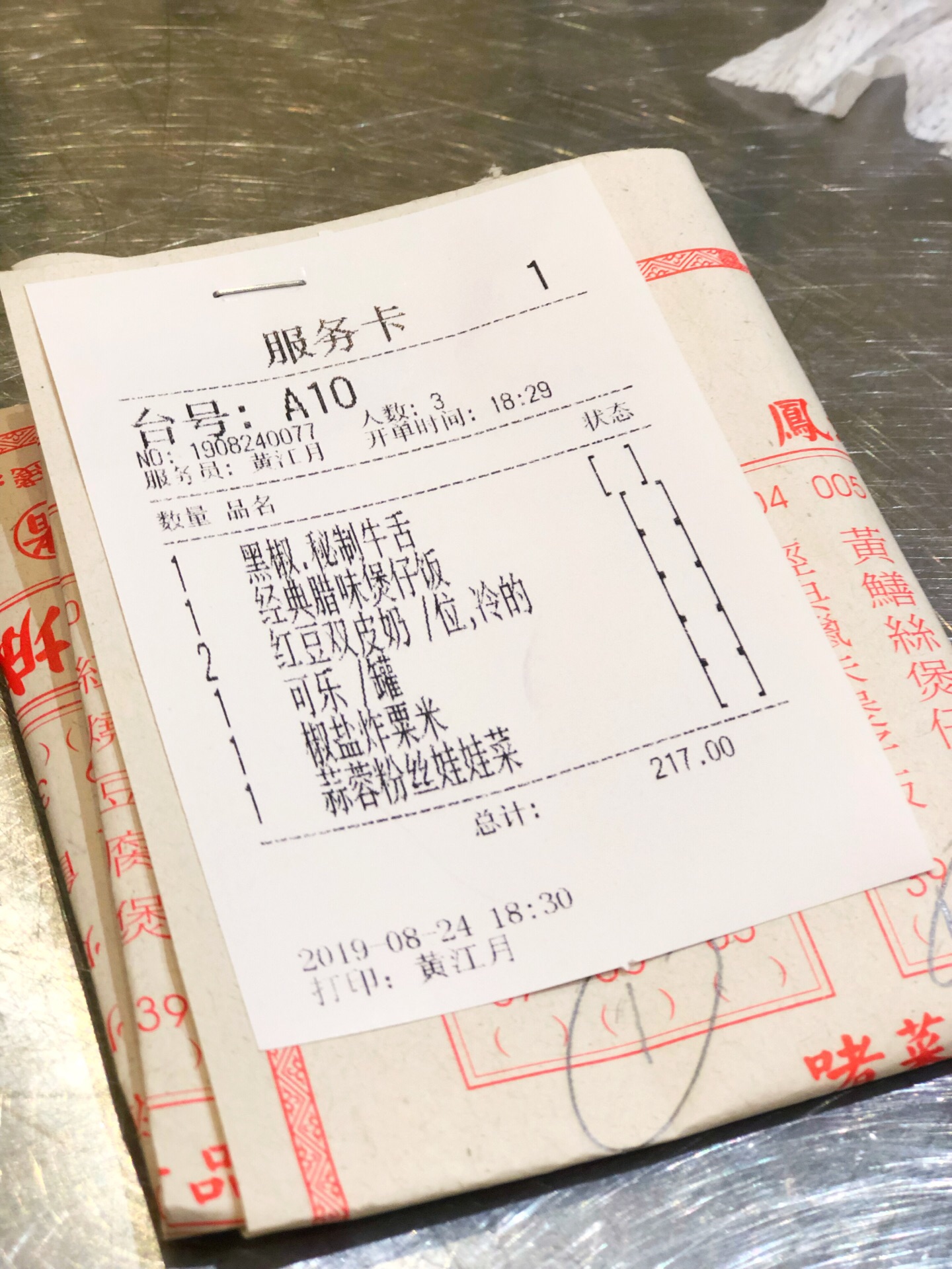 和初中闺蜜两年没见了,约在大学路。 晚饭这里不需要排队~室内坐满了,我就先坐在室外,店员说慢点有位子了留给我,我就兴高采烈去上厕所。 大学路的餐厅厕所在全家附近,排队长得来!到了店里发现我的座位被坐了,店员告诉我说里面的位子给我留好了,瞬间觉得服务棒棒的! 菜比较中规中矩,说不上好吃。 「黑椒啫秘制牛舌」牛舌挺嫩的,但是筋比较多,有几块咬不动只能生吞了… 「腊味煲仔饭」煲仔饭应该是这家特色,但没啥特色,香肠蛮多的。 「金牌炸栗米」脆脆的玉米,很爽口,炸得很入味。 「红豆双皮奶」双皮奶味道浓郁,红豆有嚼劲。 「蒜泥粉丝娃娃菜」比较清淡的娃娃菜,喜欢吃上面的粉丝。 「葱姜炒牛蛙」后来又觉得不够加点的菜,牛蛙不是很多,牛蛙切得比较碎。 隔壁桌的人太讨厌了!一直往旁边挪,椅子撞到我好疼,都不打招呼。一转手把我们的东西弄到了地上,也不打招呼,呵呵了!不过这家餐厅室内的位子也太拥挤了吧…