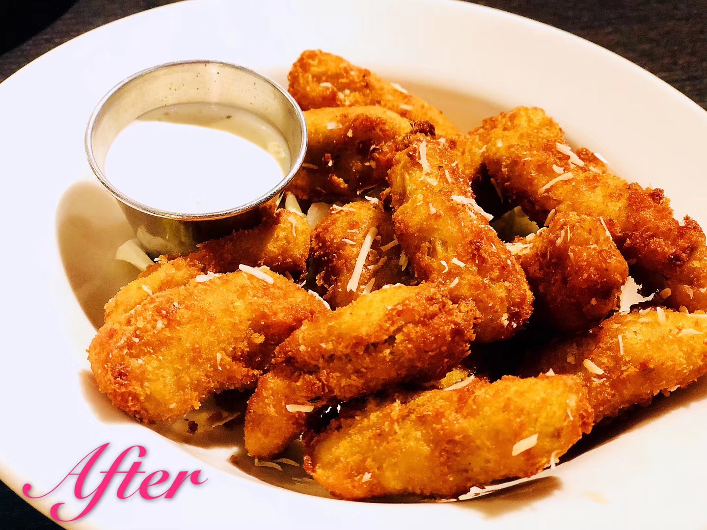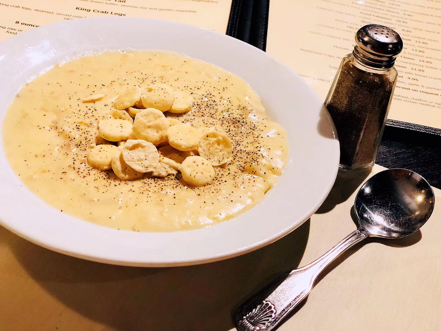 clam chowder蚌蛤杂烩奶油浓汤; fired artichoke hearts好奇宝宝再次上线,之前根据网络菜谱摸索白灼朝鲜蓟的做法,始终感觉太过随意草率,于是决定靠舌头亲测,结果[撇嘴]面拖&油炸 罐头朝鲜蓟芯做的开胃菜,毫无惊艳感~ oysters on the half shell有2个肉质感觉不饱满新鲜,要求店家更换,换回了小一号的生蚝。也许为了品质以及口碑,店家用叉子挖出藏在蚝壳深处的肥美蚝肉,以证自家食材新鲜,好心的店家最后多送了2个oyster给我们,6个变8个 给你们看看,不给吃,最后5个都进了我的肚子[害羞][强][色] mahi-mahi店内招牌鱼肉干柴了点,芒果黄油酱汁味道还是不错的~